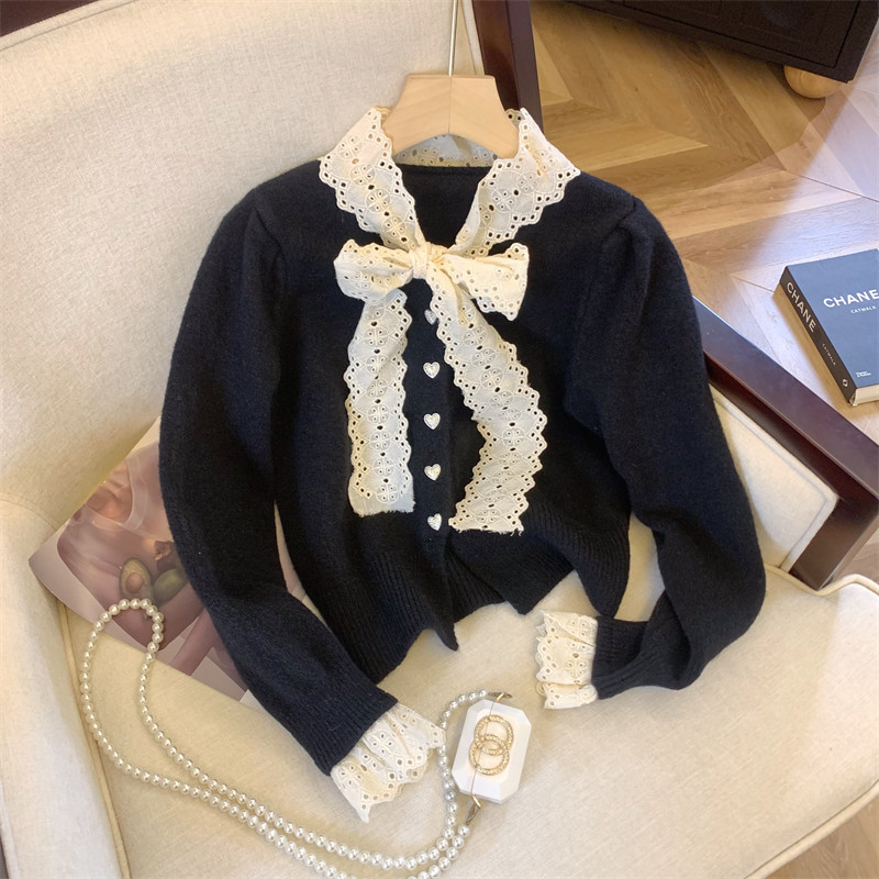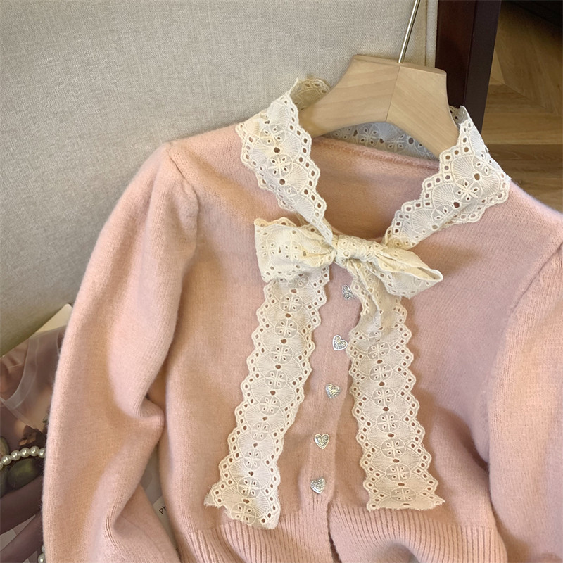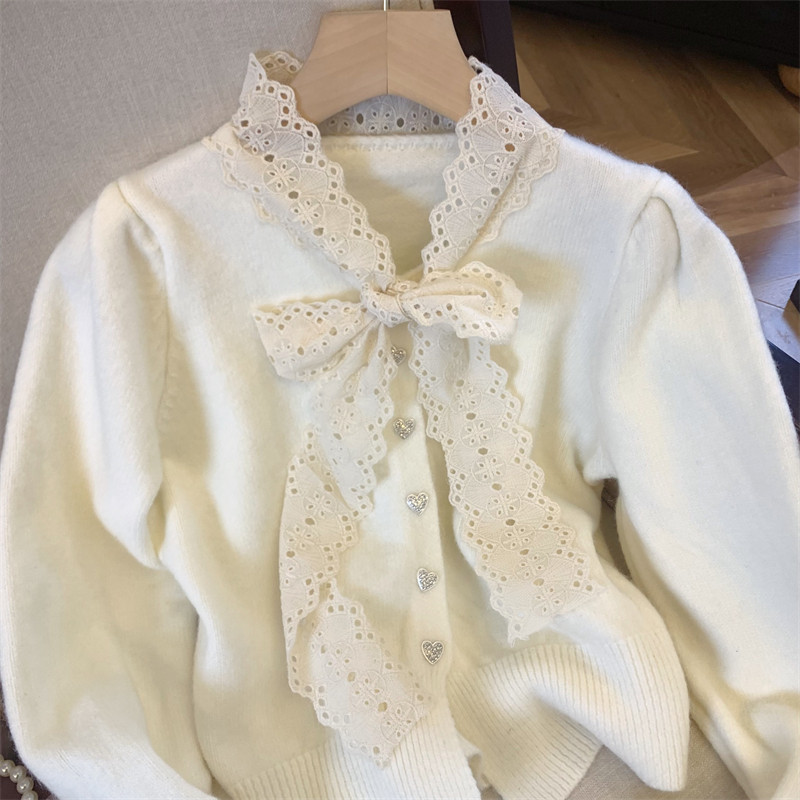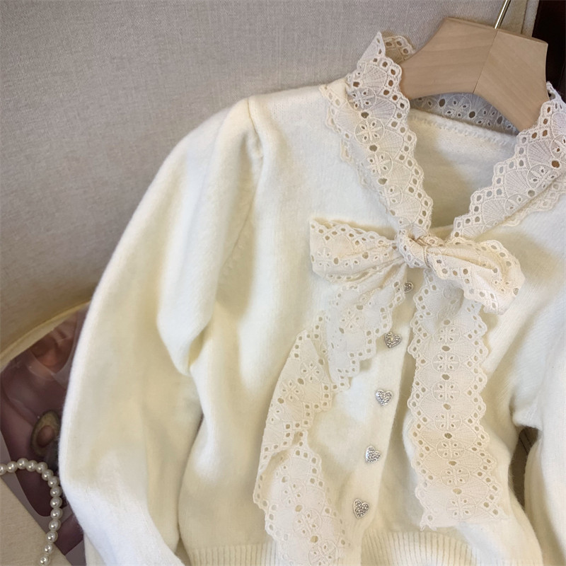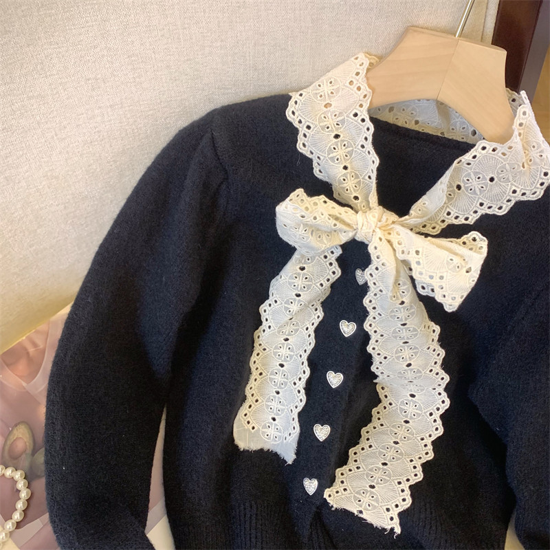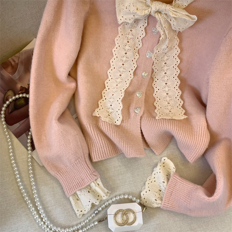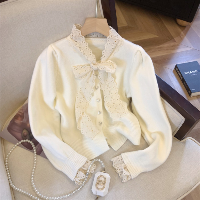 大牌買手店法式蕾絲花邊蝴蝶結針織開衫女冬季新款超好看毛衣外套