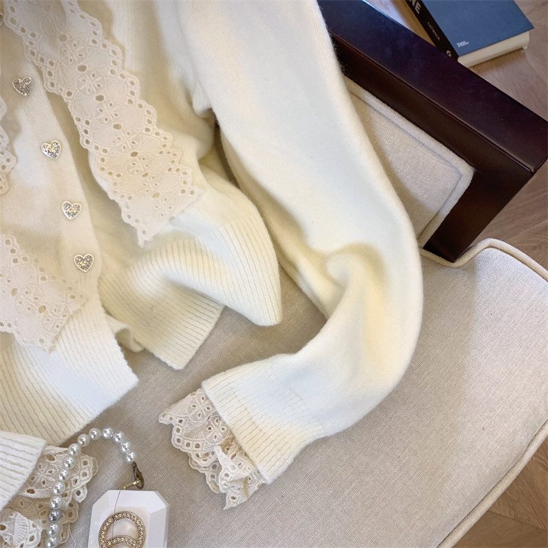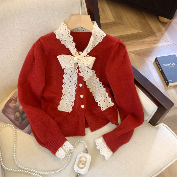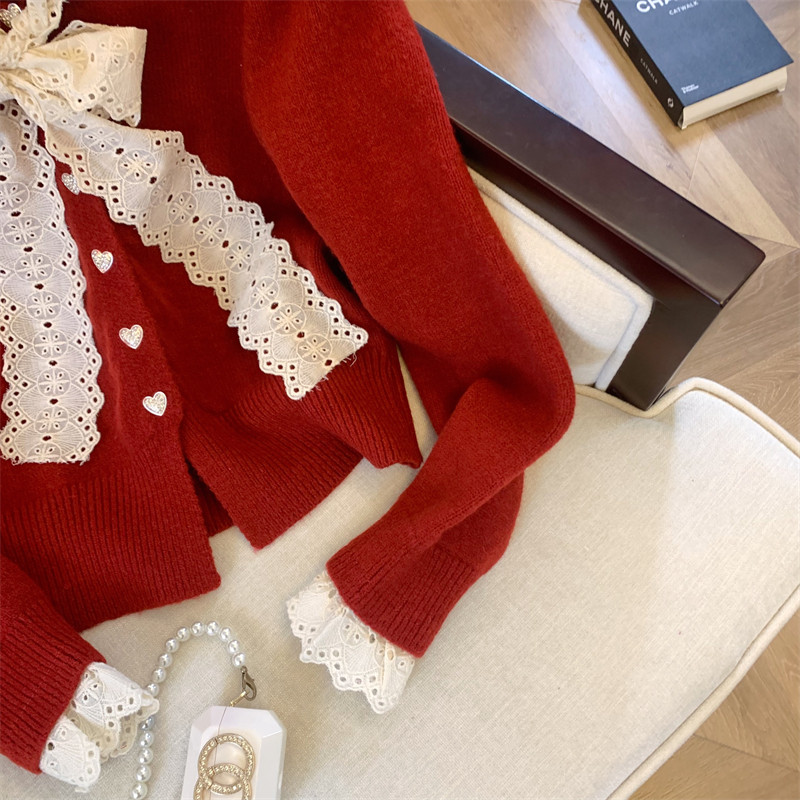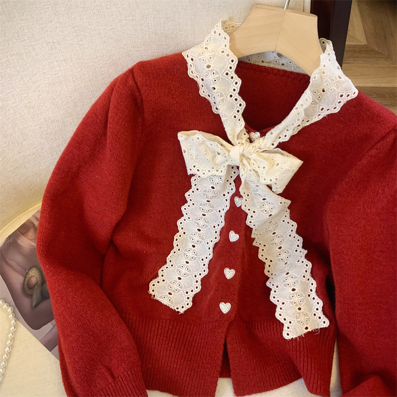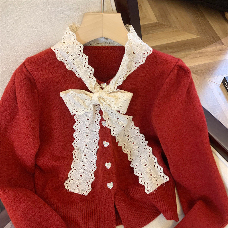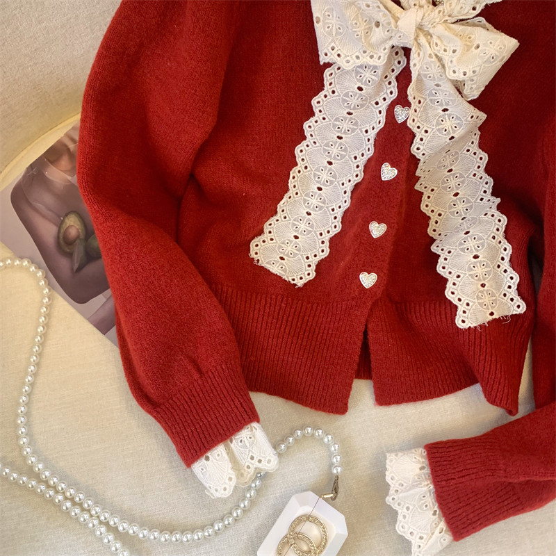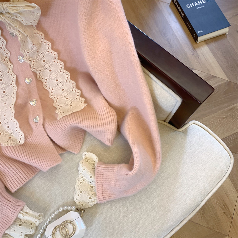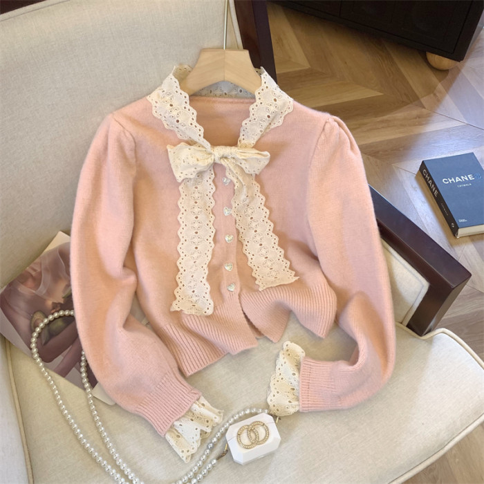 大牌買手店法式蕾絲花邊蝴蝶結針織開衫女冬季新款超好看毛衣外套