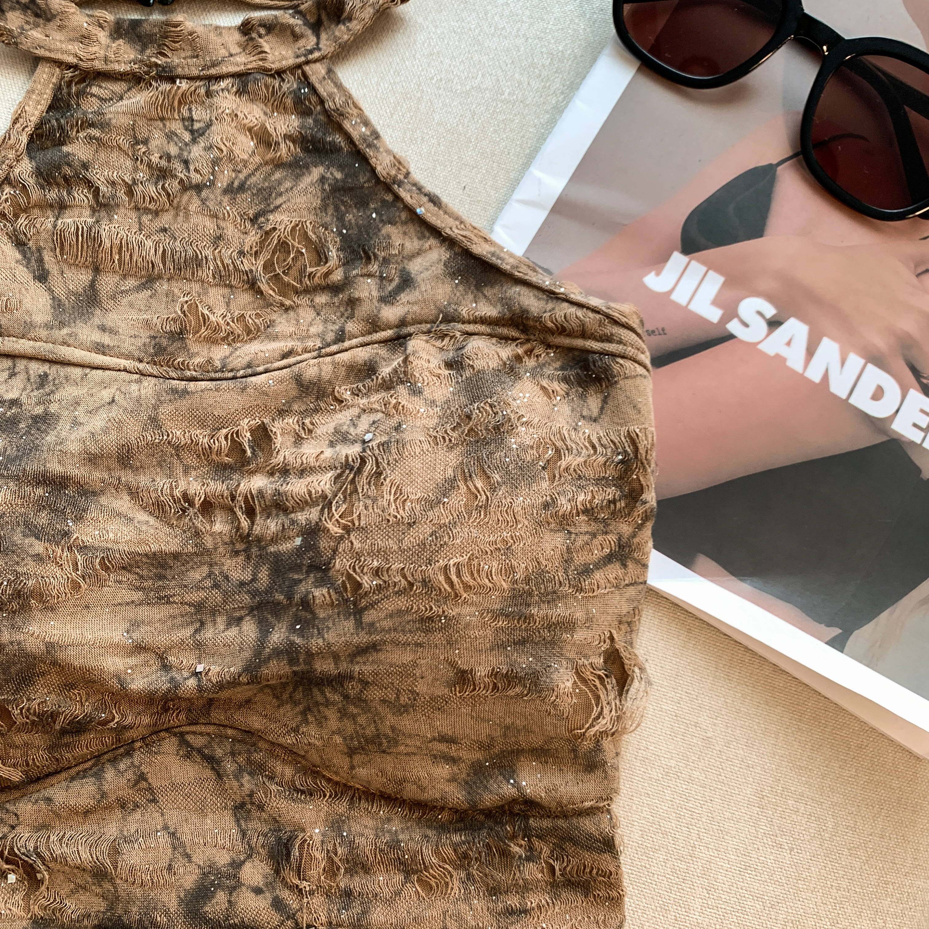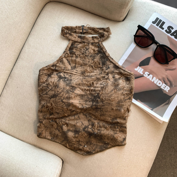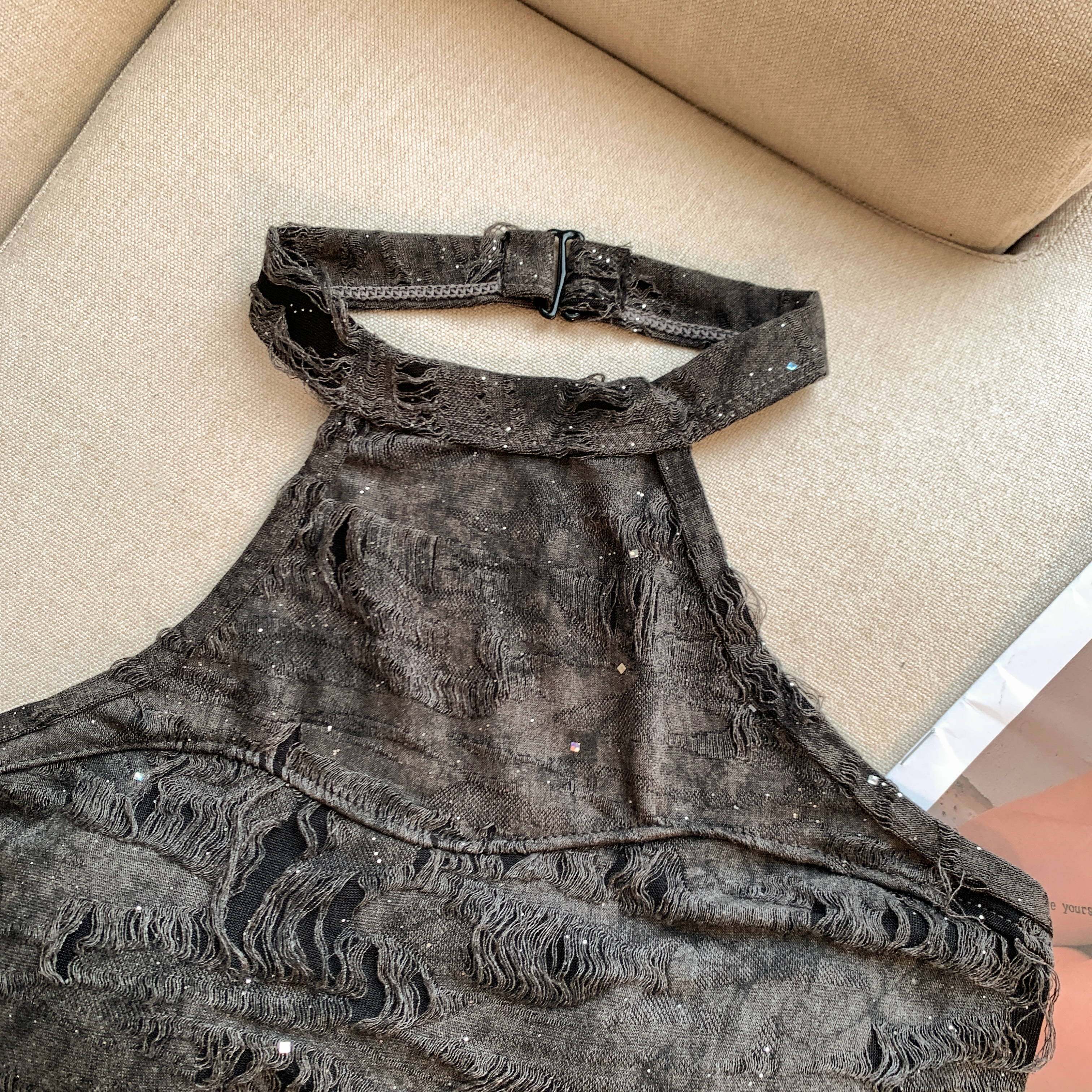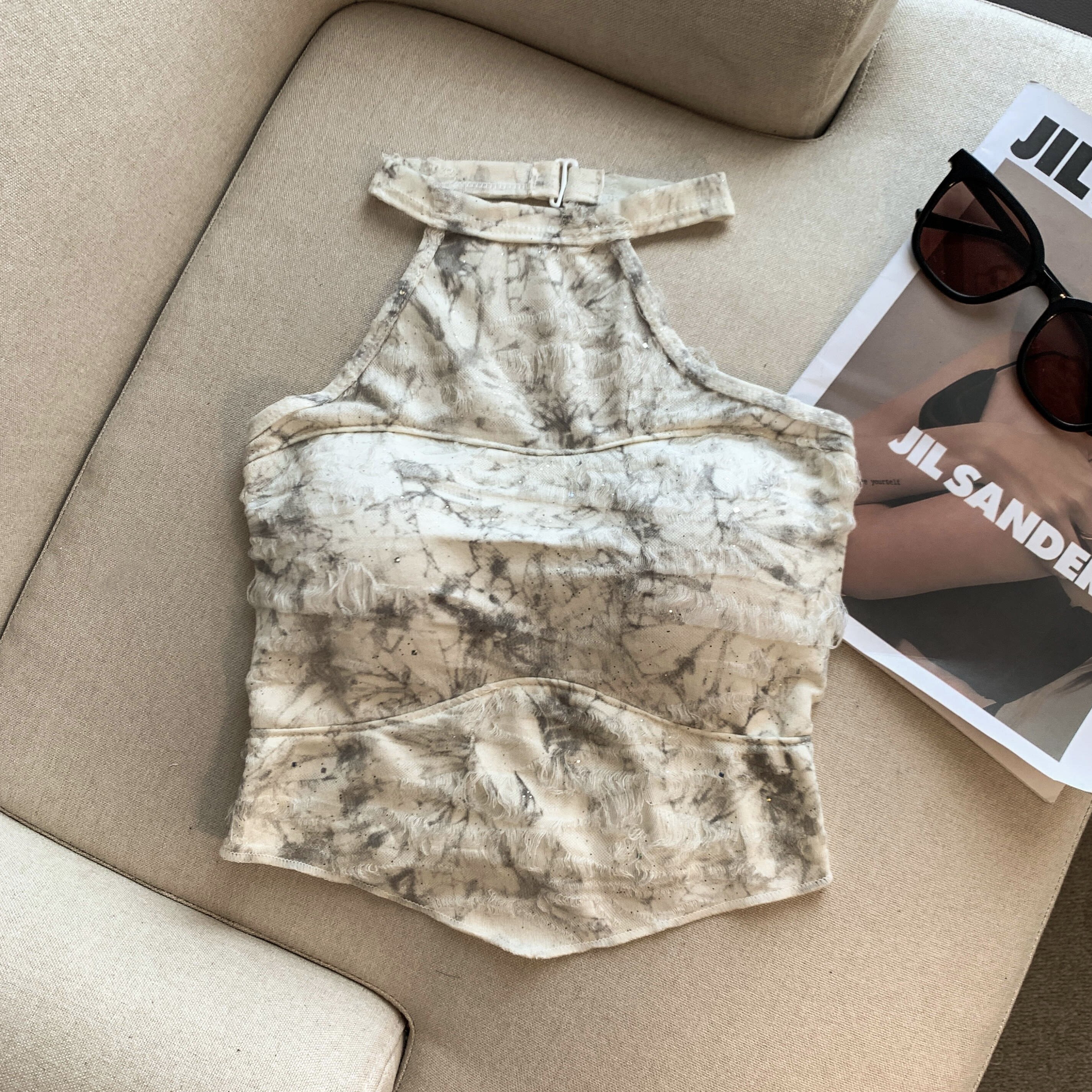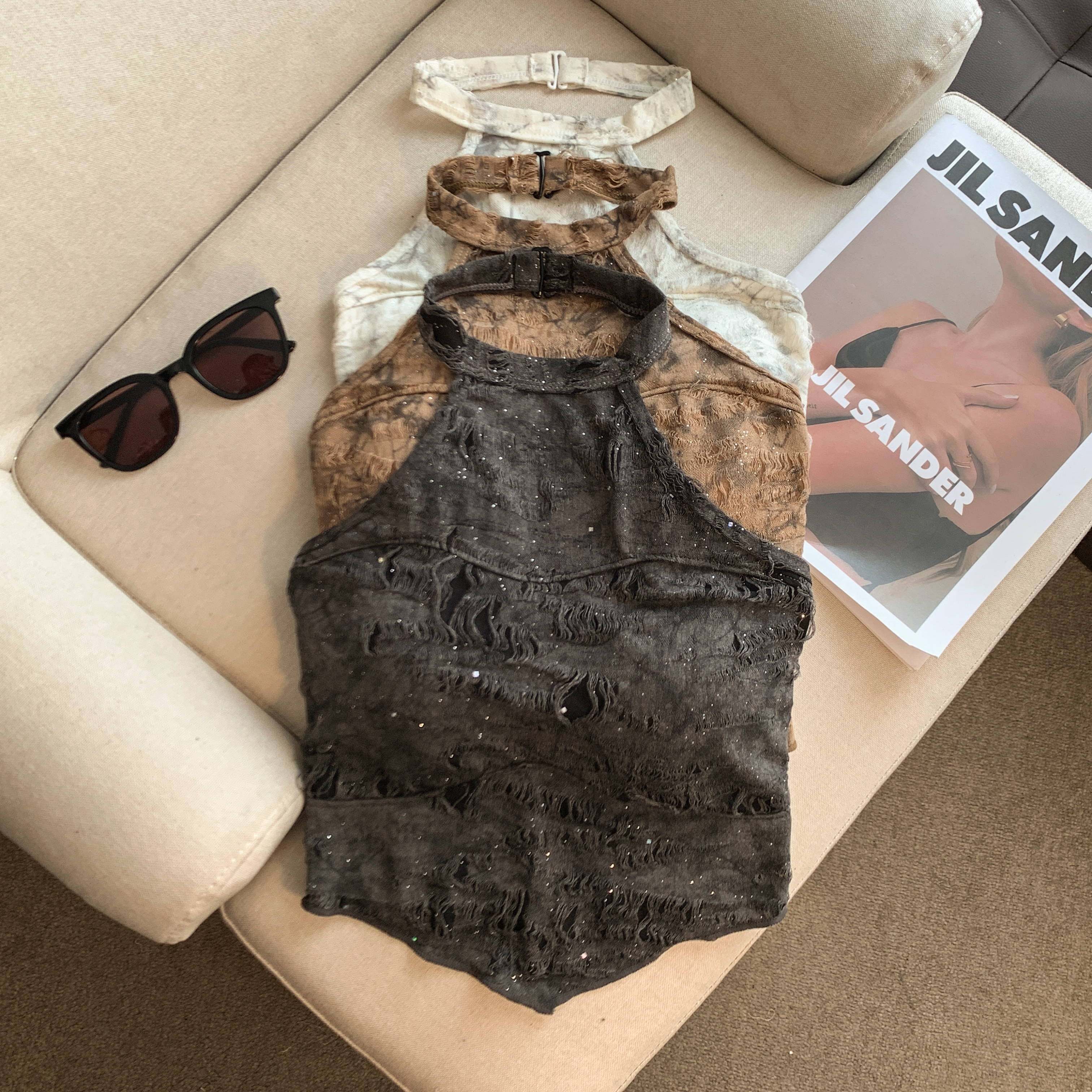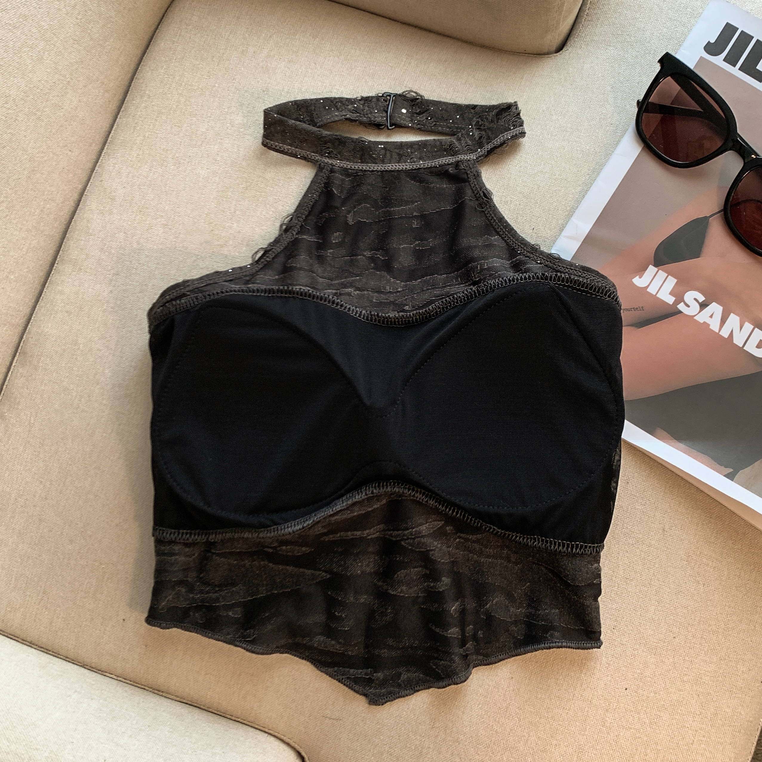 專櫃撤廻剪標復古辣妹掛脖重工鑲鑽吊帶背心女夏款設計感露肩上衣