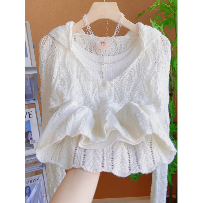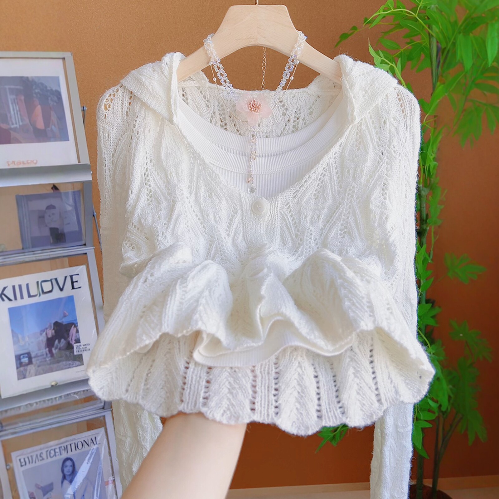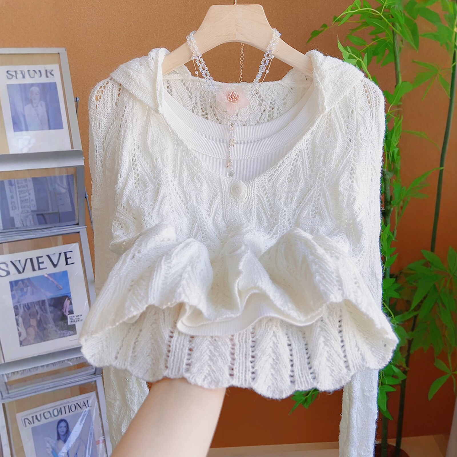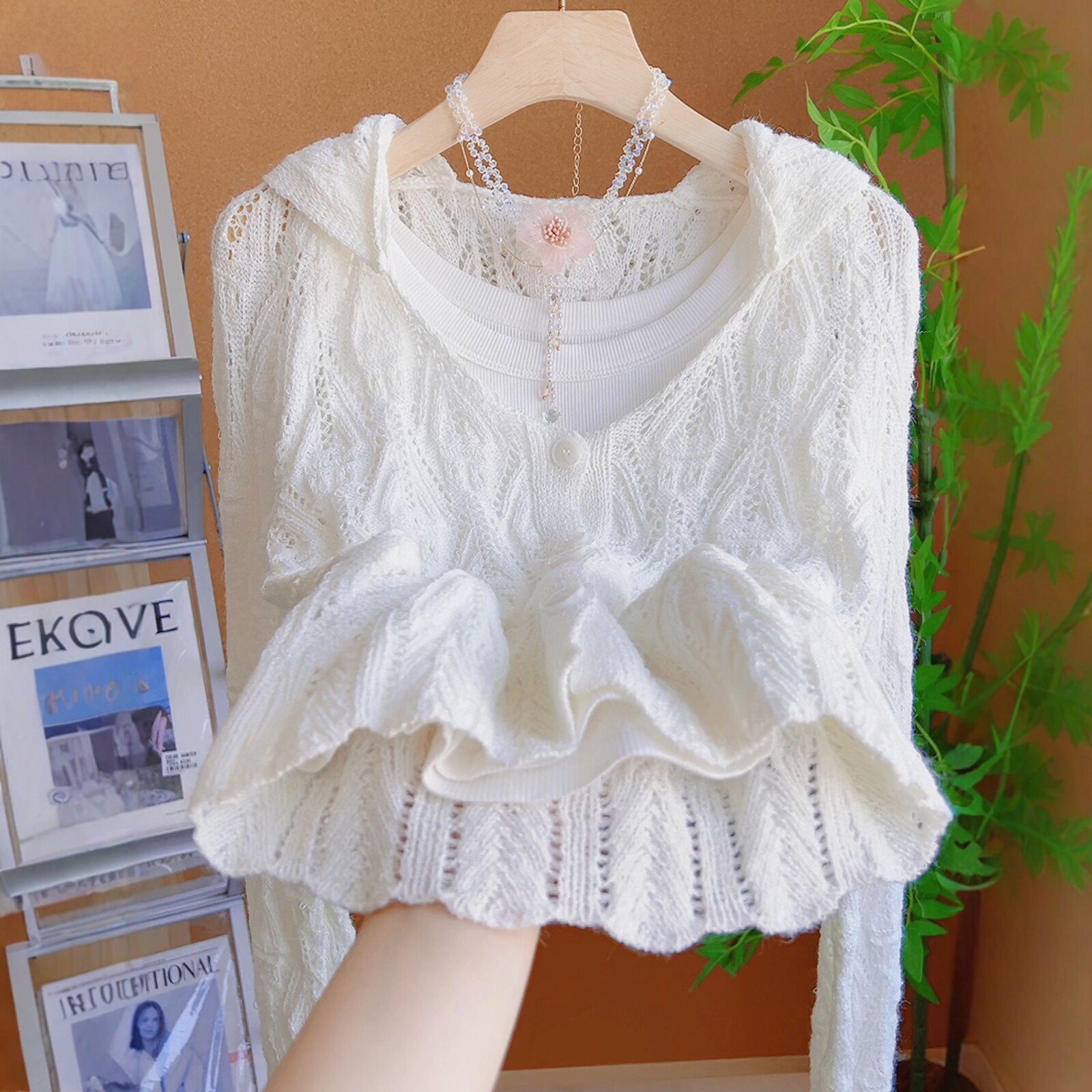 十三行韓版薄款鏤空連帽針織罩衫女夏季白色防曬開衫配背心兩件套