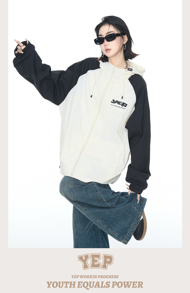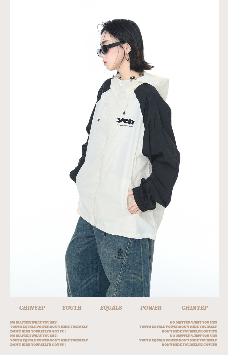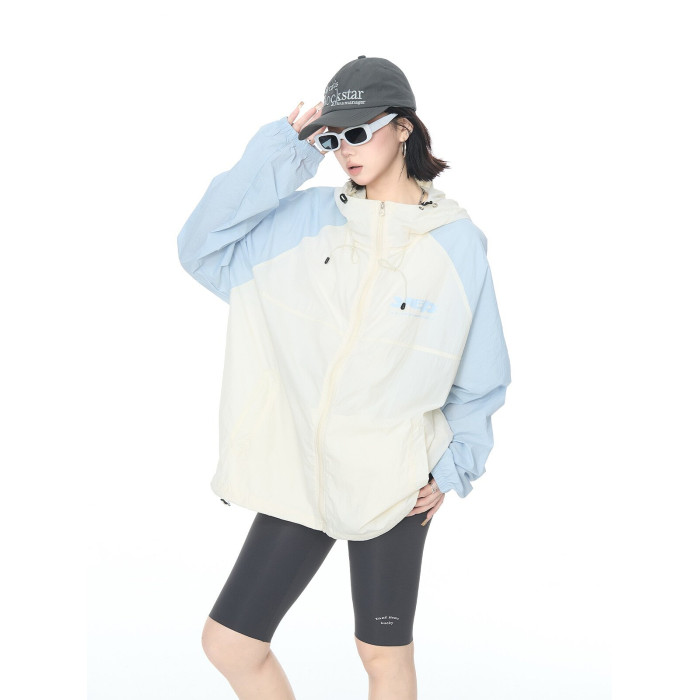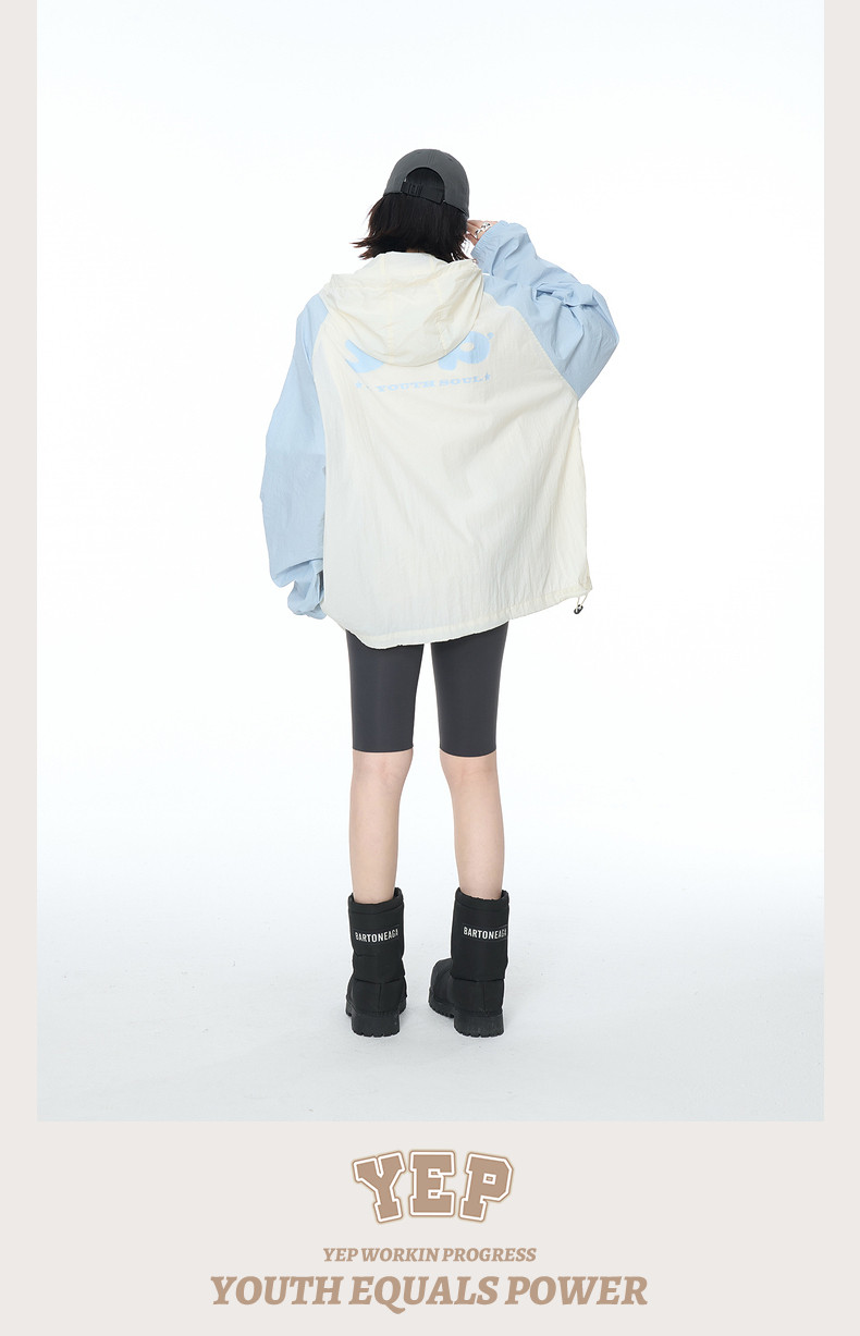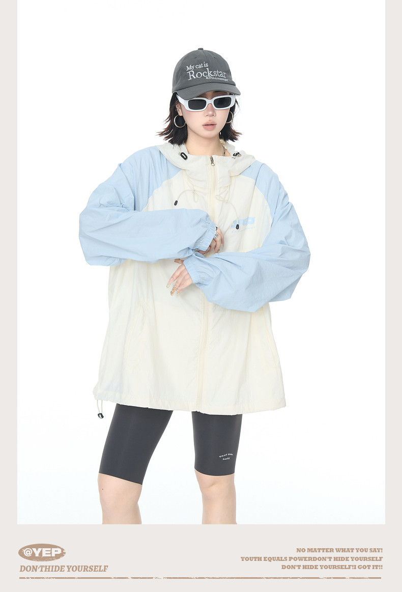 2025夏款upf50+潮流撞色連帽防曬衣男女同款透氣戶外寬鬆印花外套
