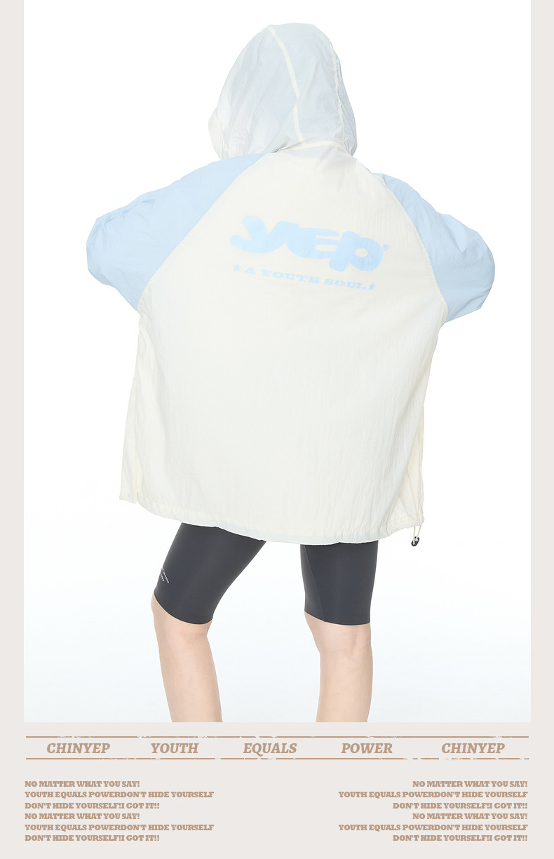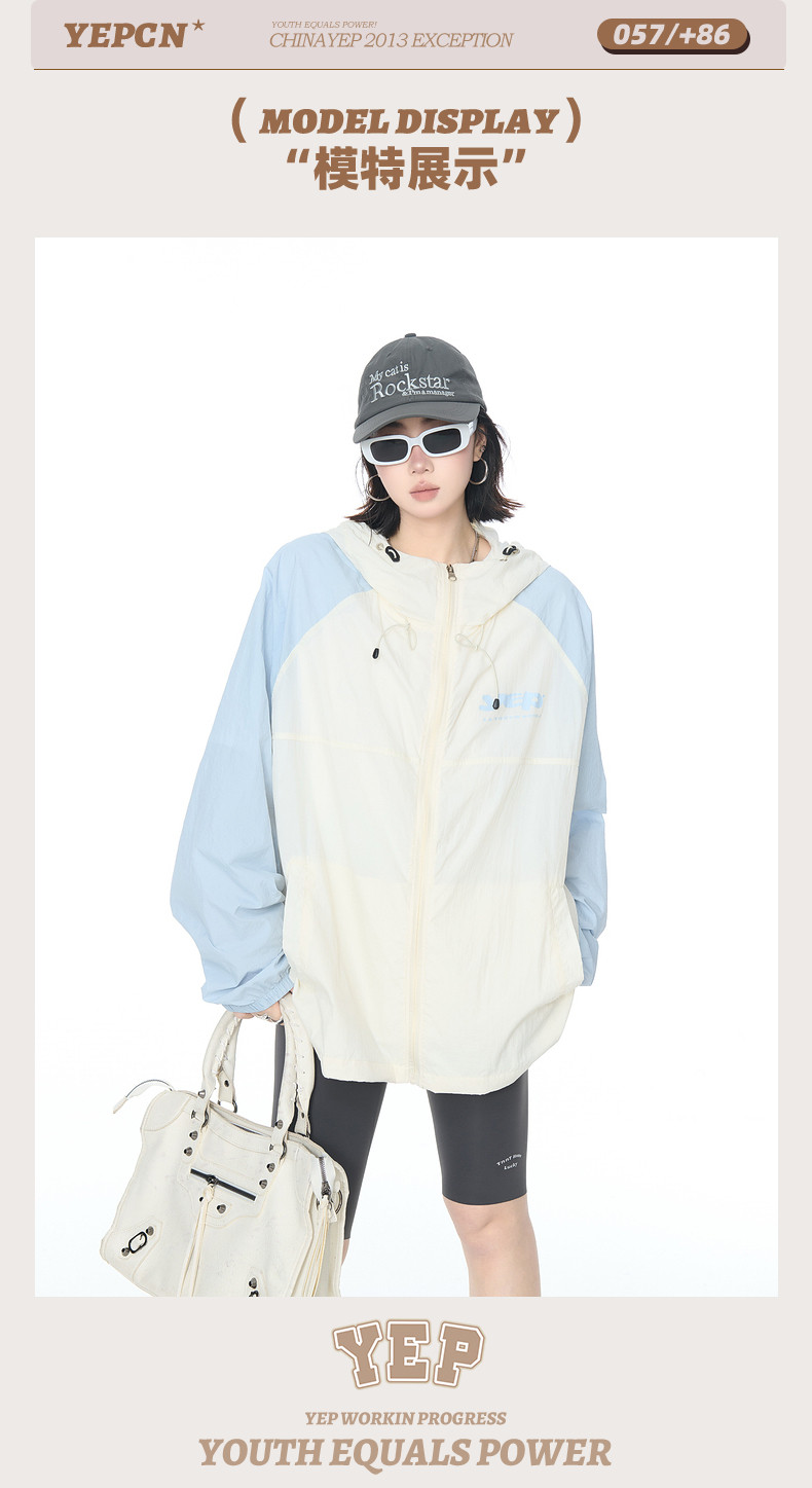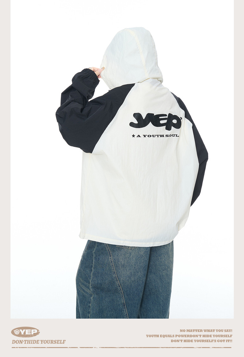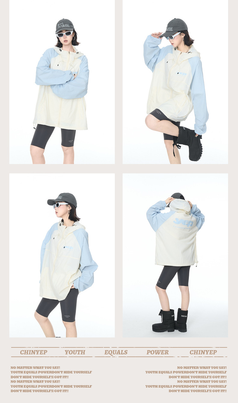 2025夏款upf50+潮流撞色連帽防曬衣男女同款透氣戶外寬鬆印花外套