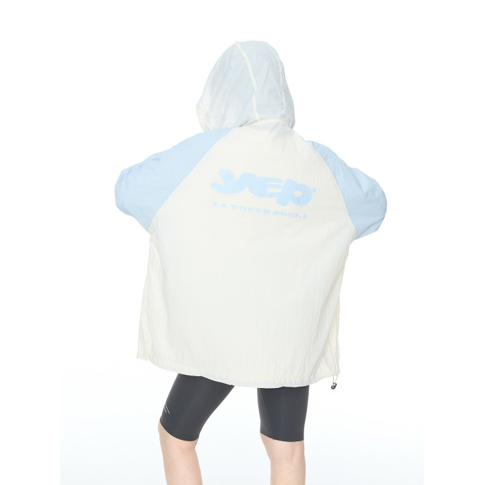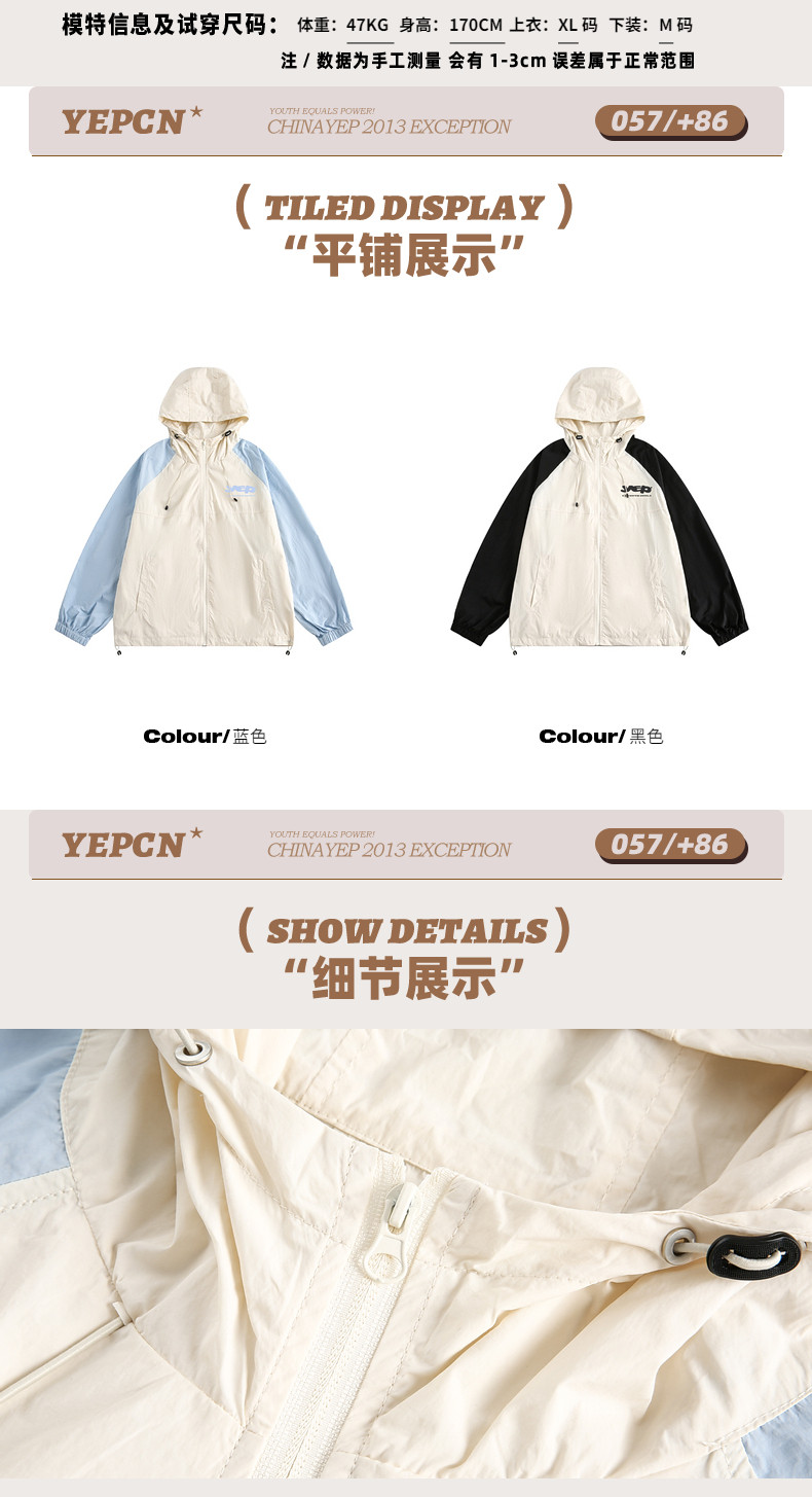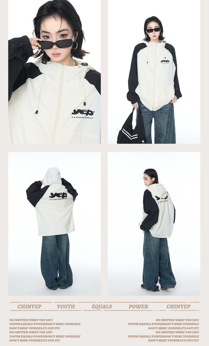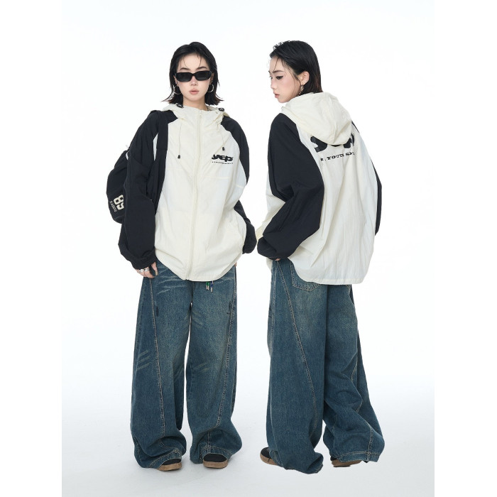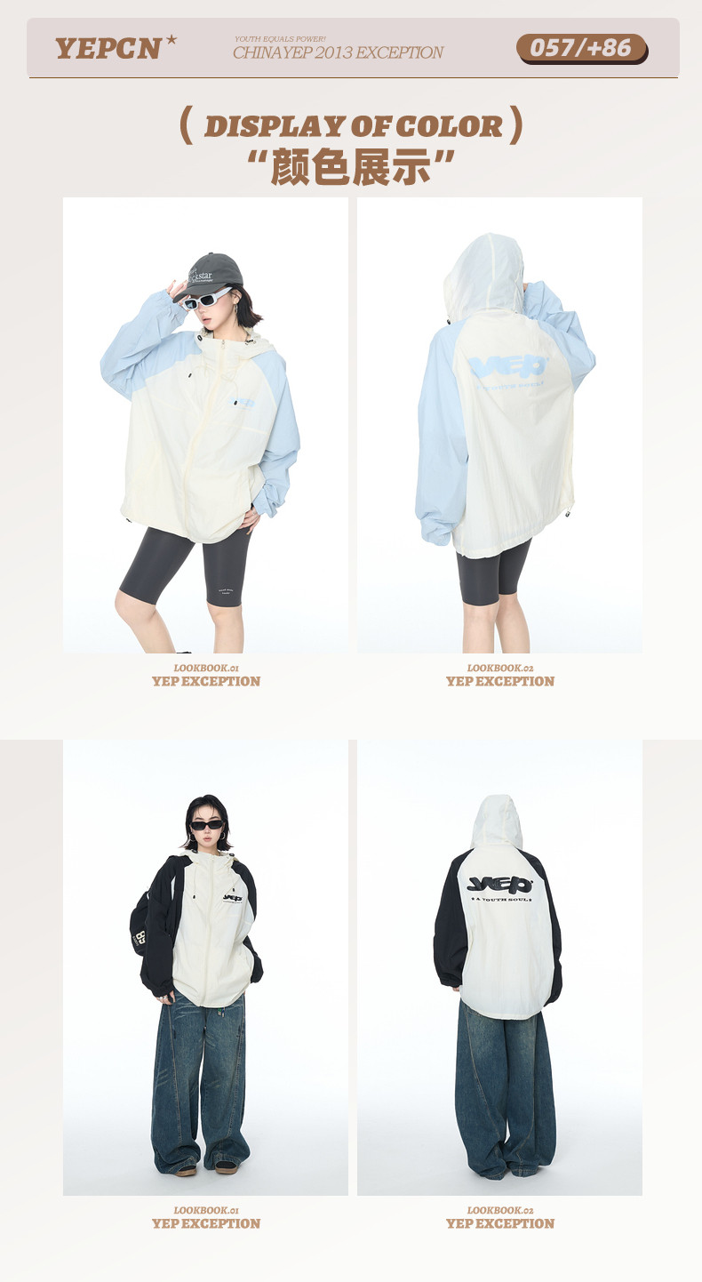 2025夏款upf50+潮流撞色連帽防曬衣男女同款透氣戶外寬鬆印花外套