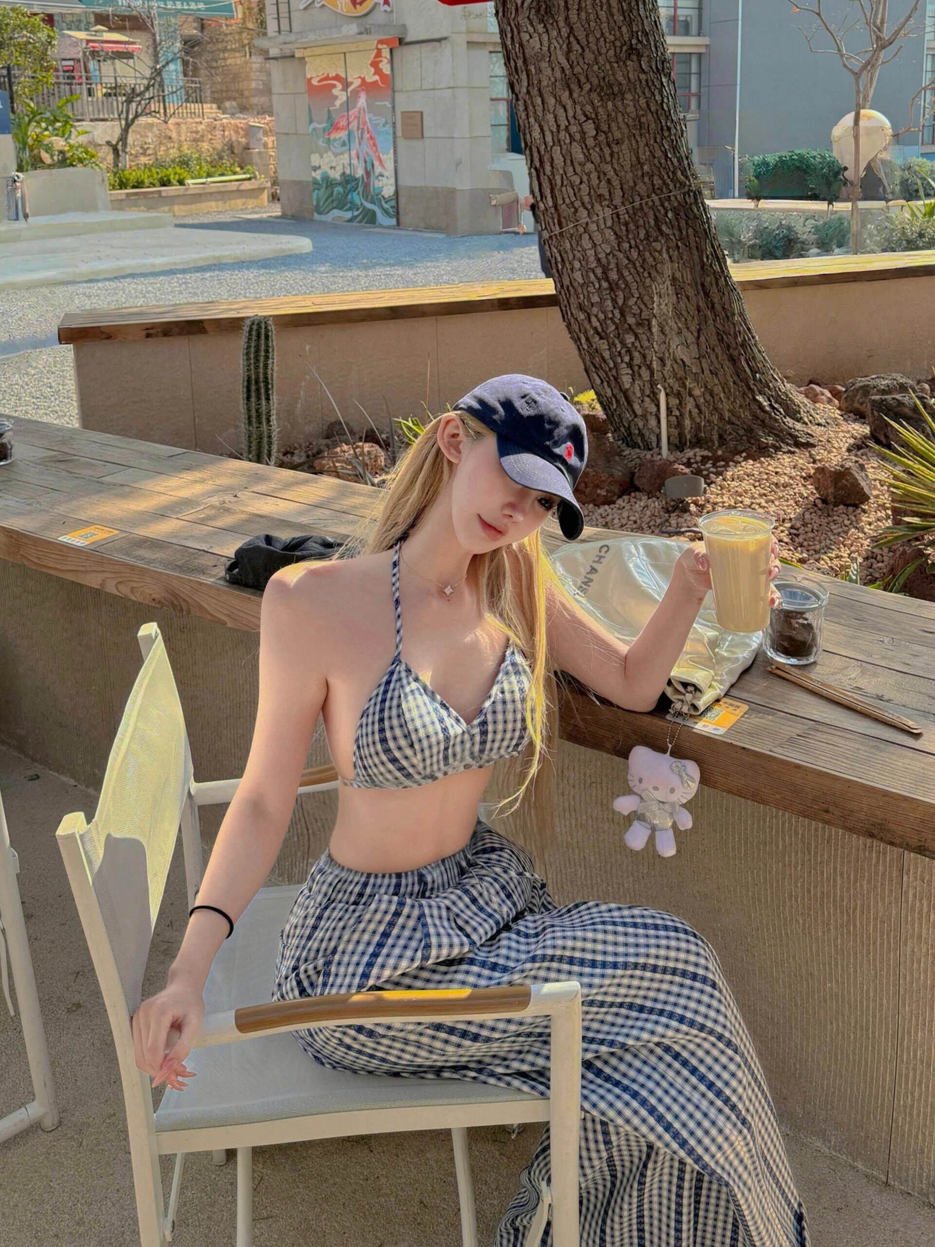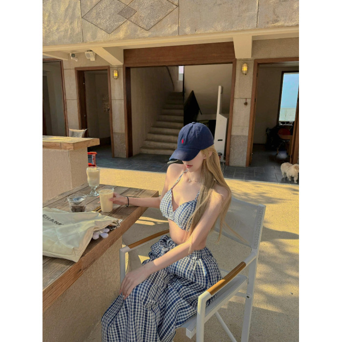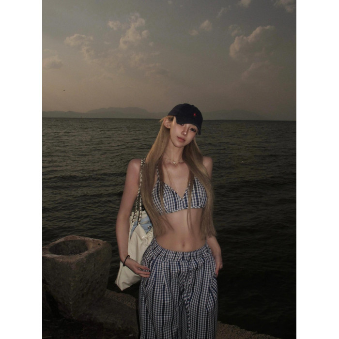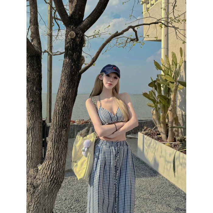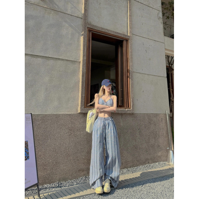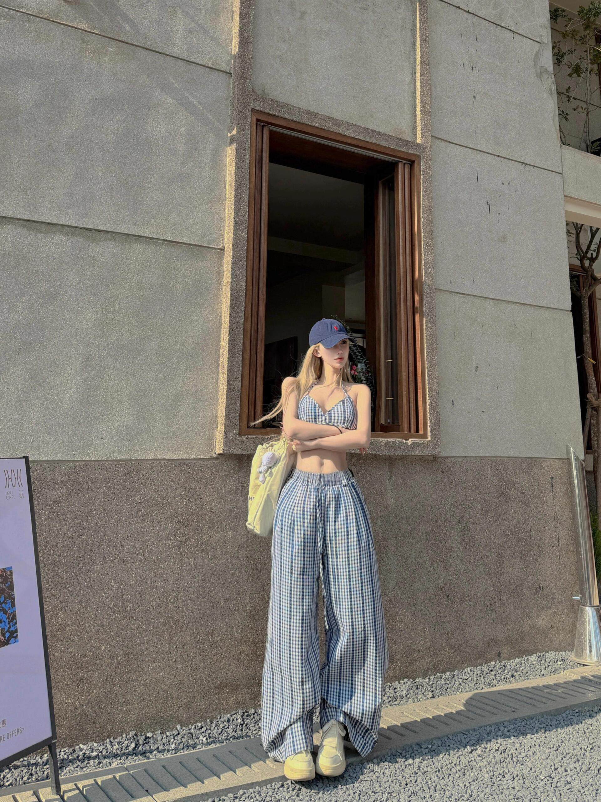 OUTFlT 歐美辣妹風性感格子掛脖背心2025新款休閒濶腿長褲兩件套