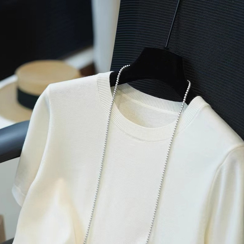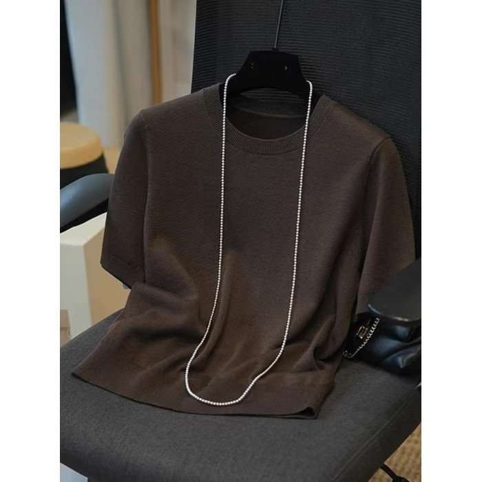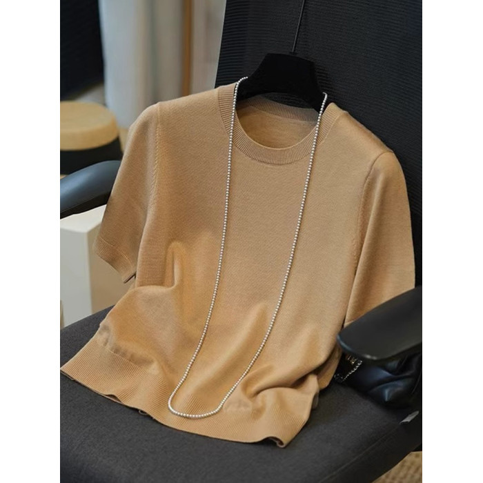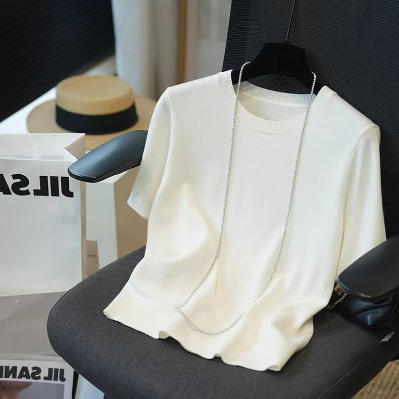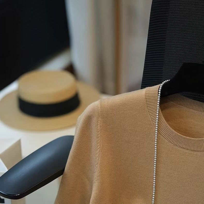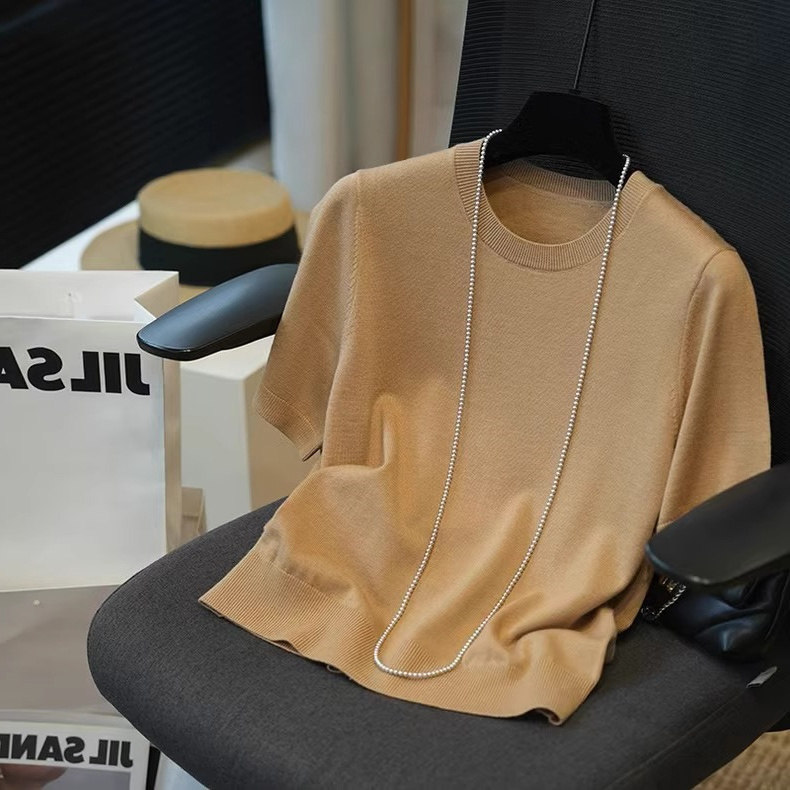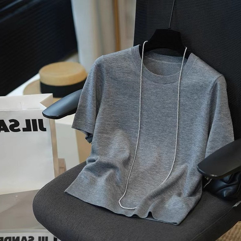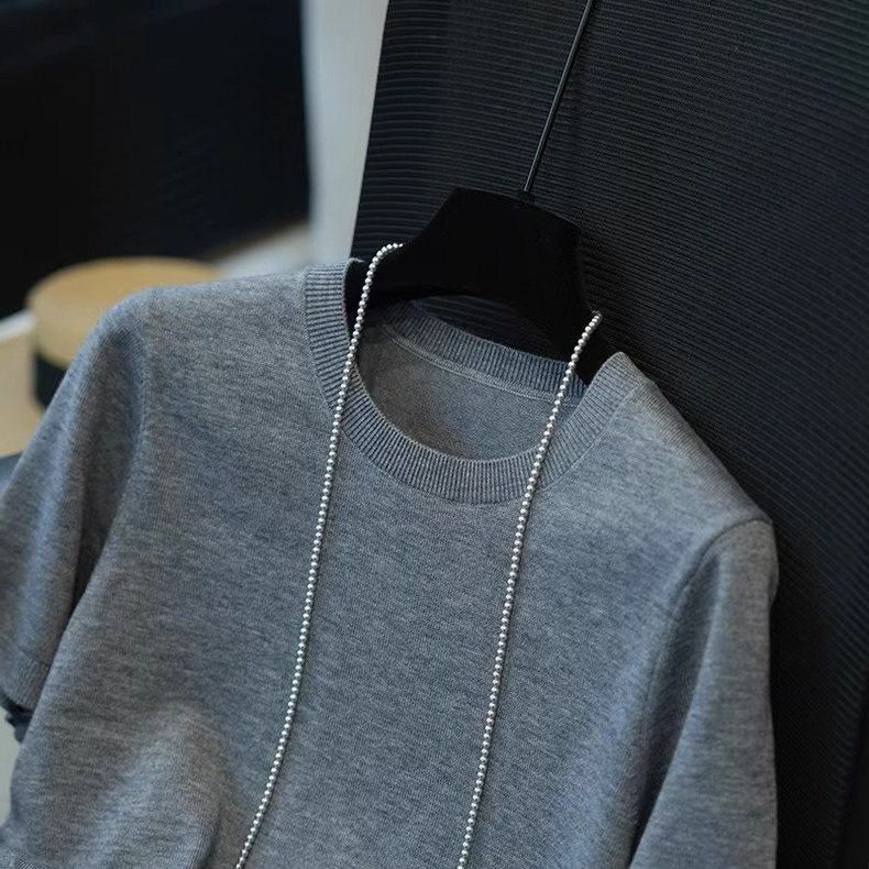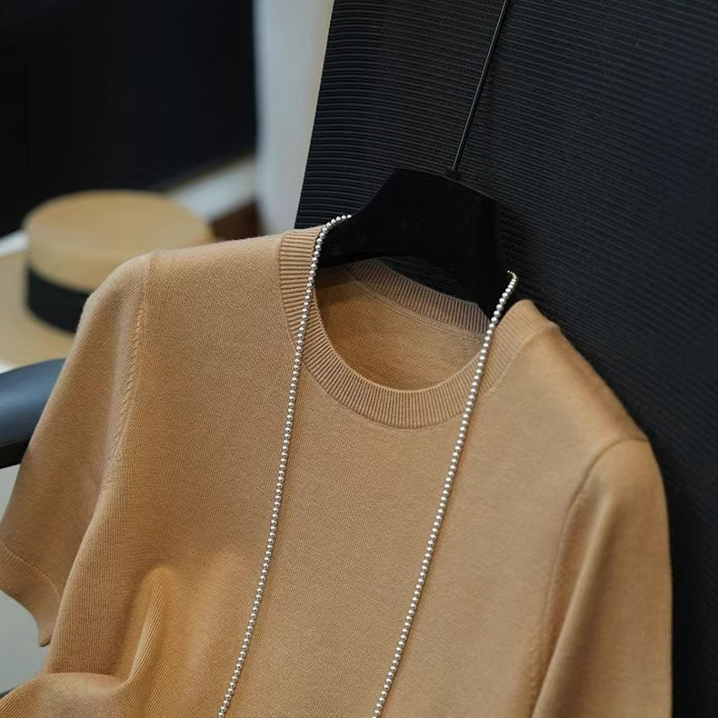 純色圓領冰絲短袖針織衫2025夏季精緻簡約寬鬆慵懶舒適正肩上衣女