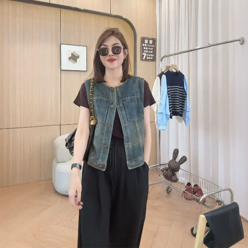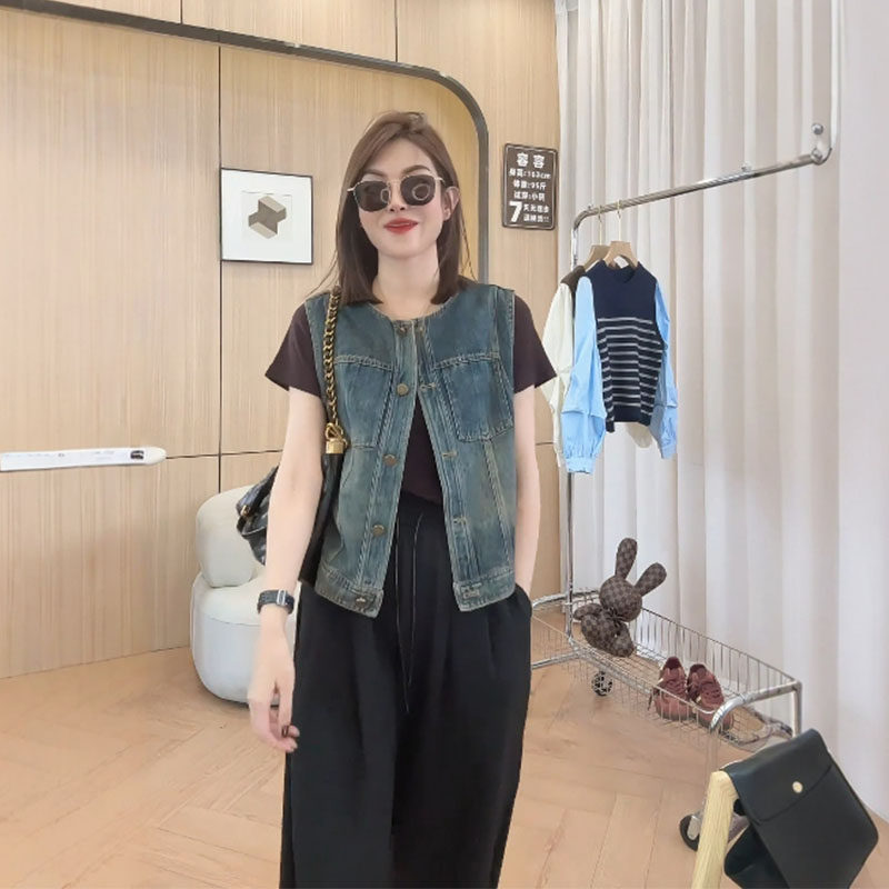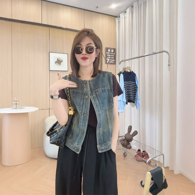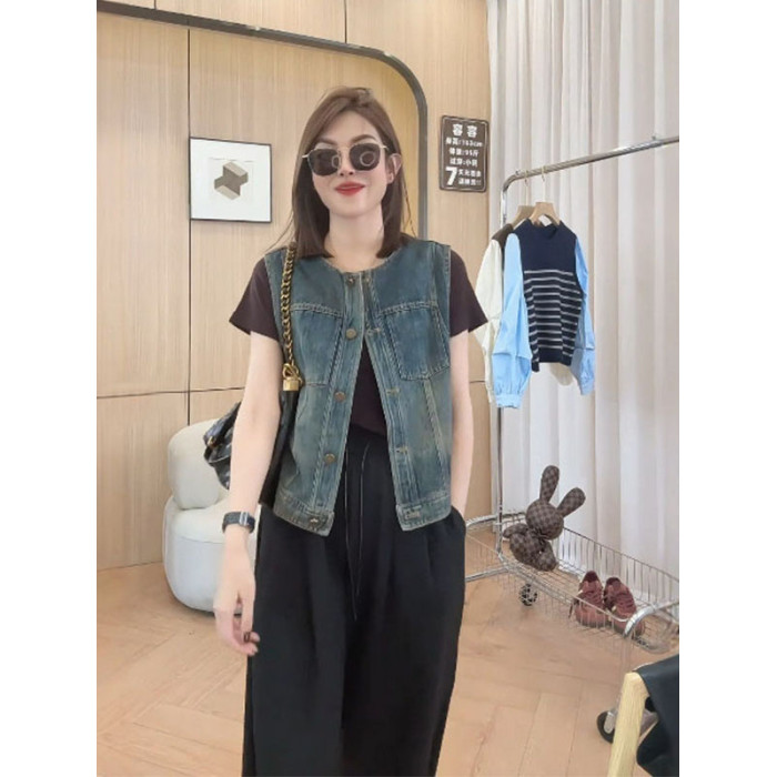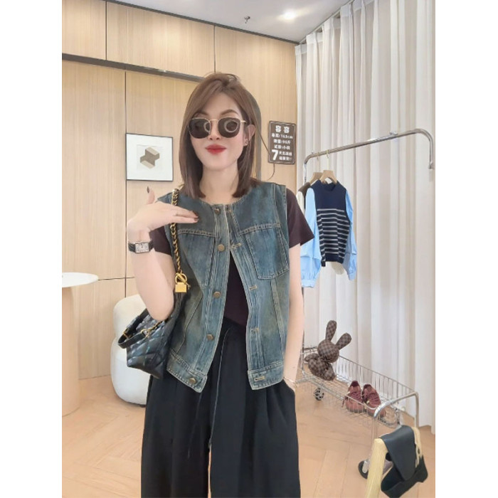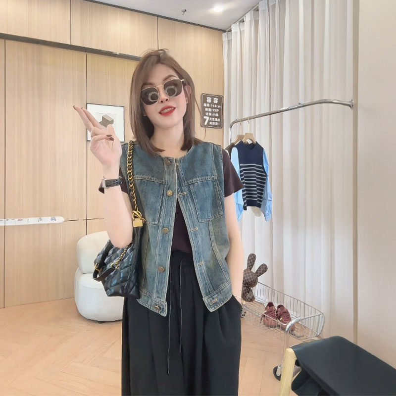 日韓出口剪標短款無袖背心牛仔外套女寬鬆百搭小個子曡穿上衣