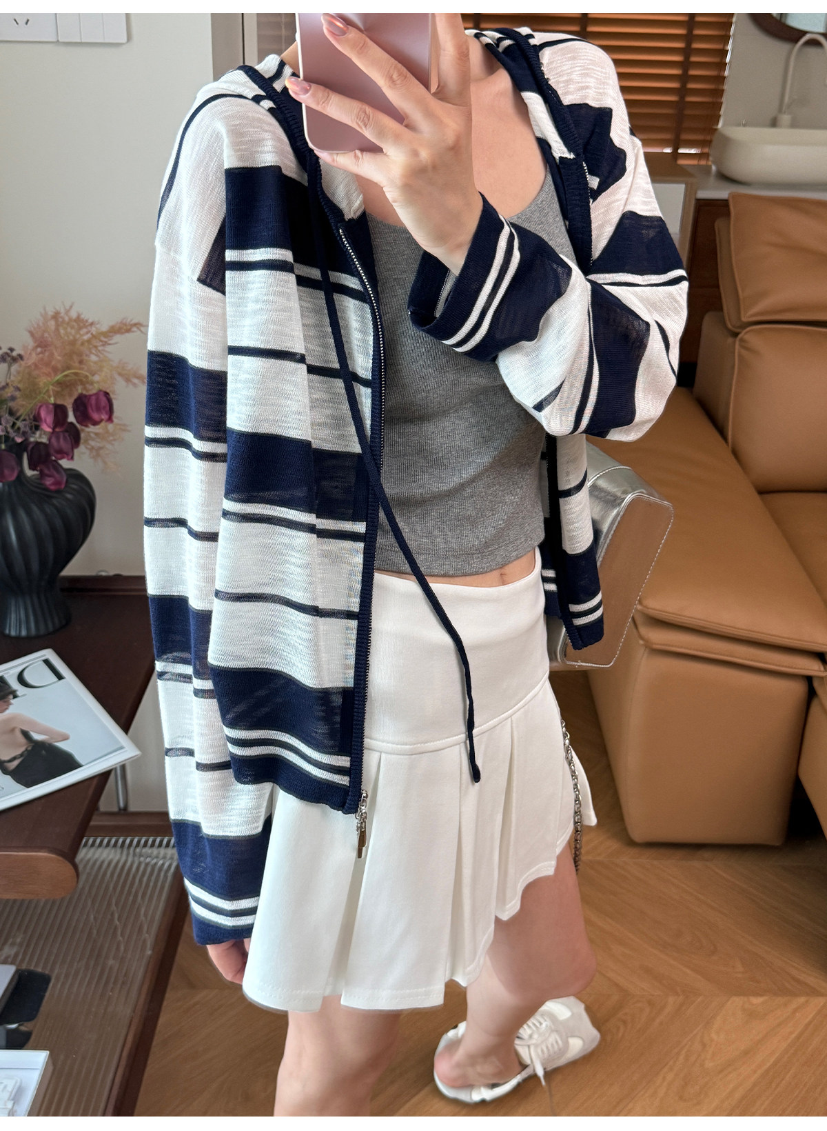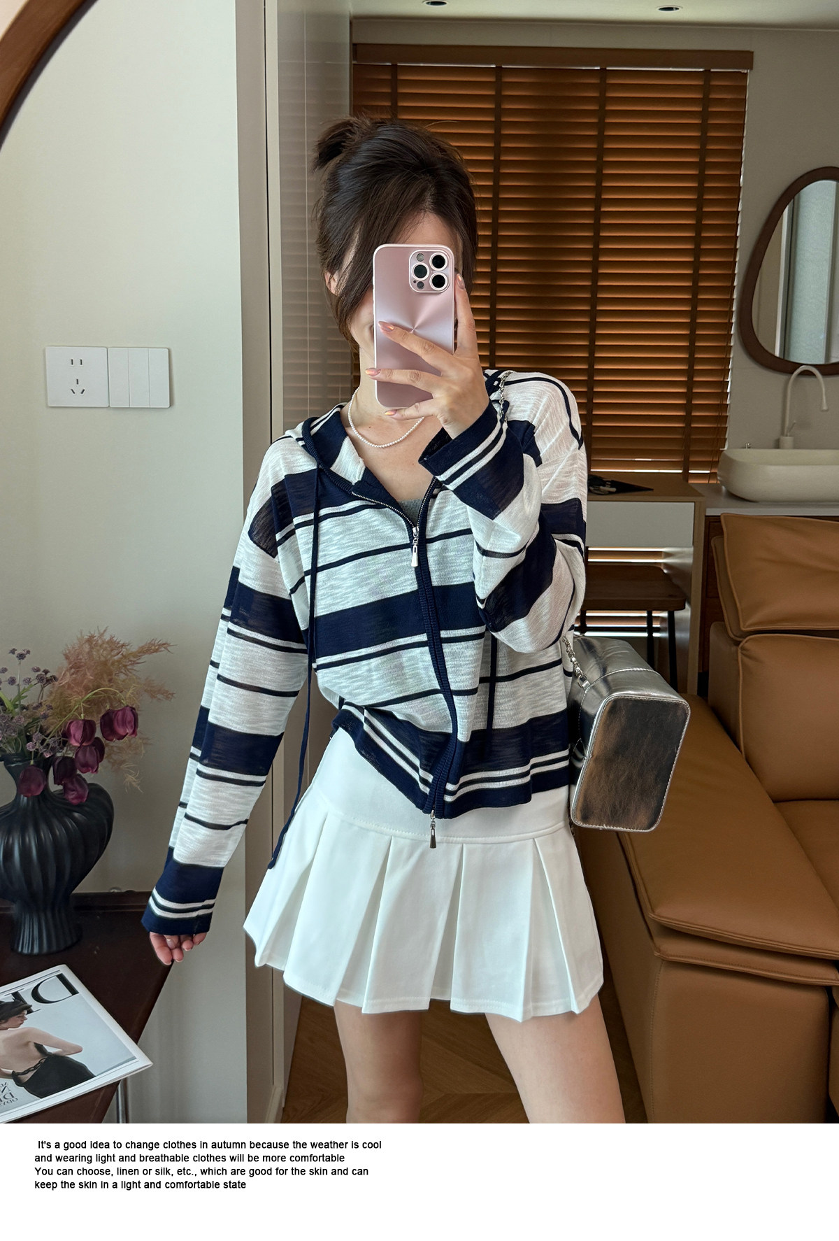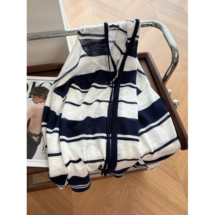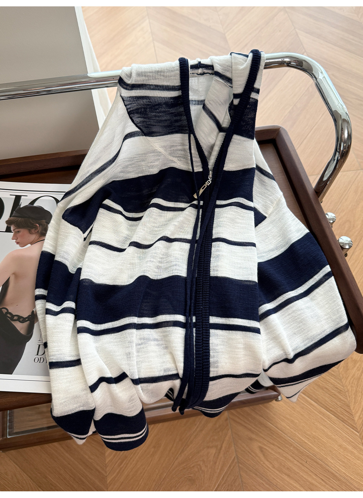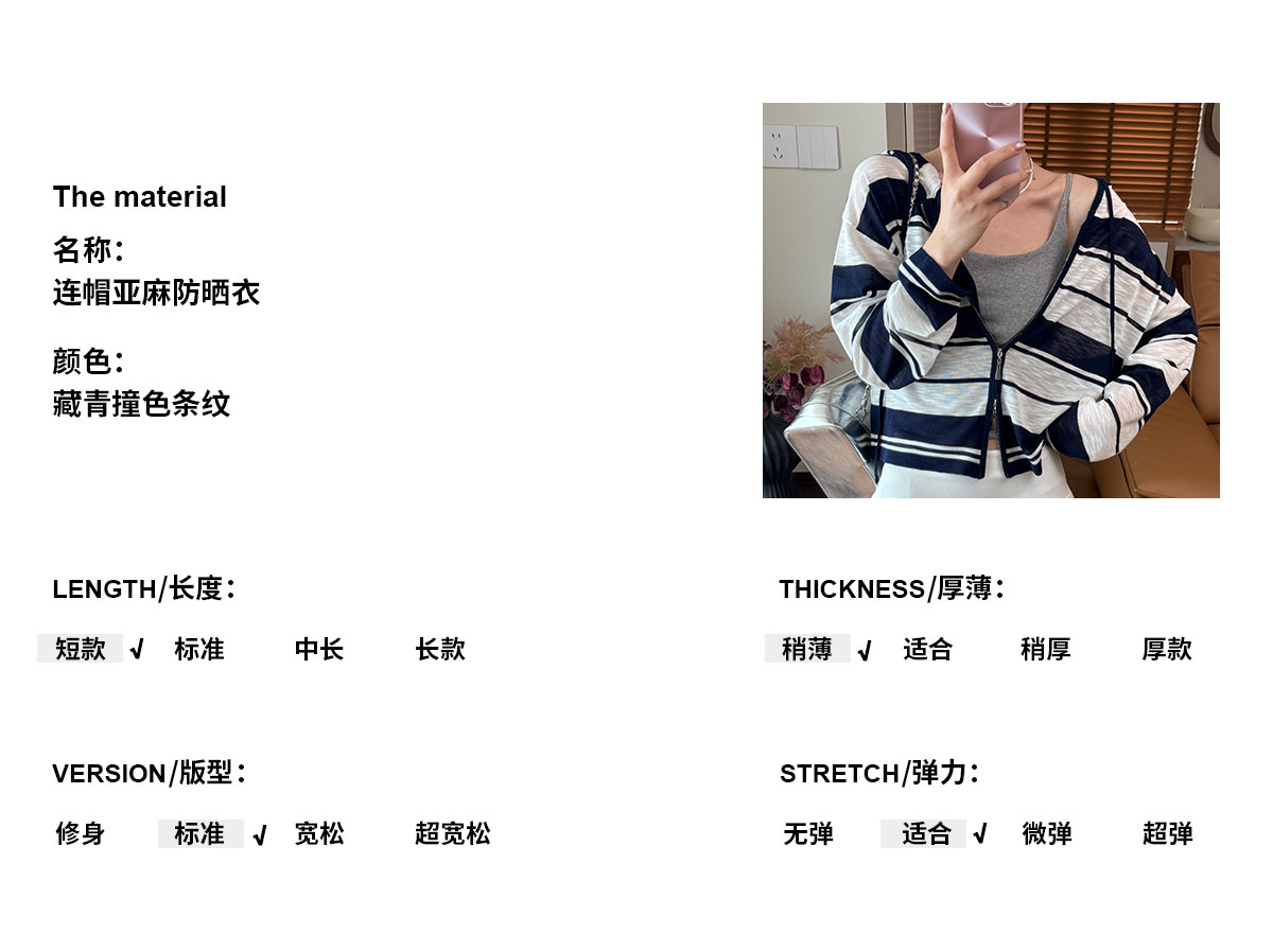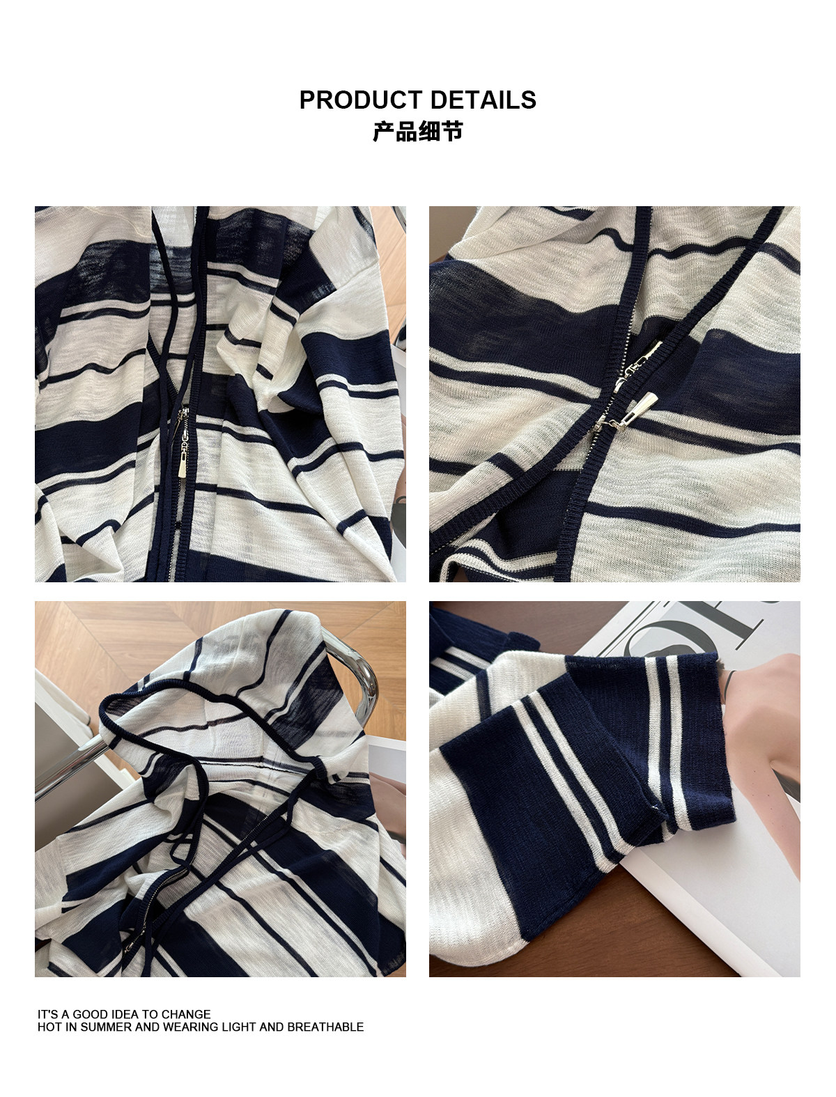 momo大姐姐條紋設計感連帽亞麻防曬衣女2025早秋新款百搭開衫上衣