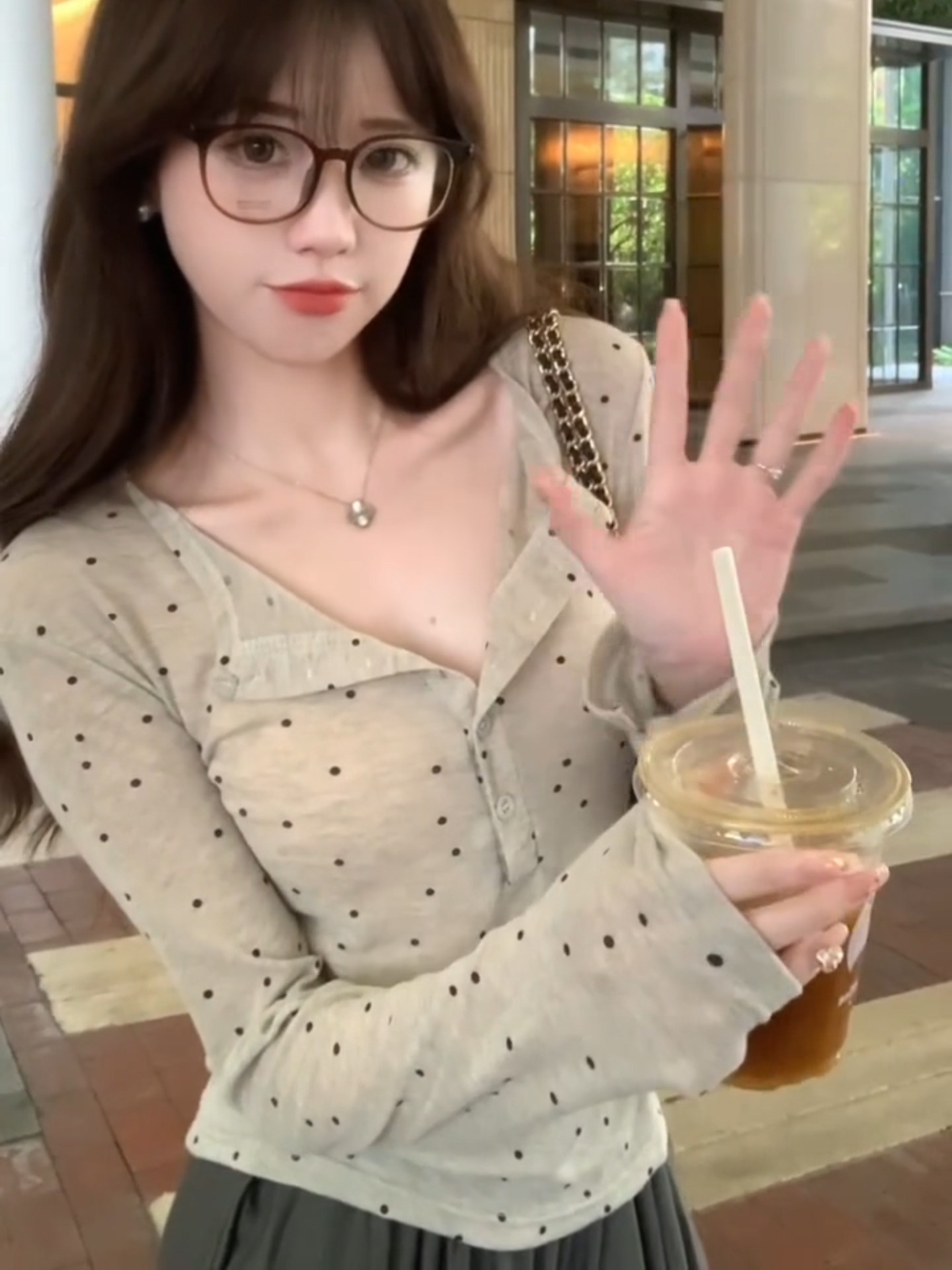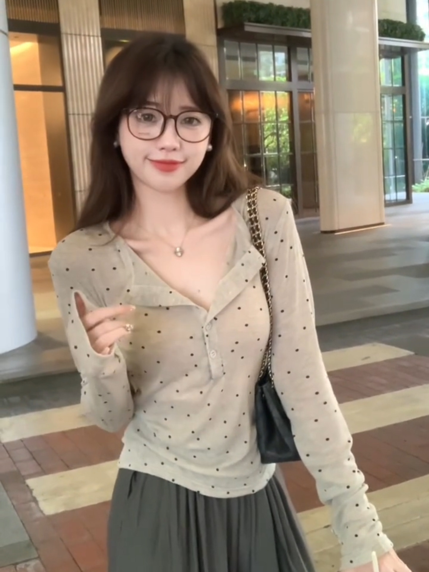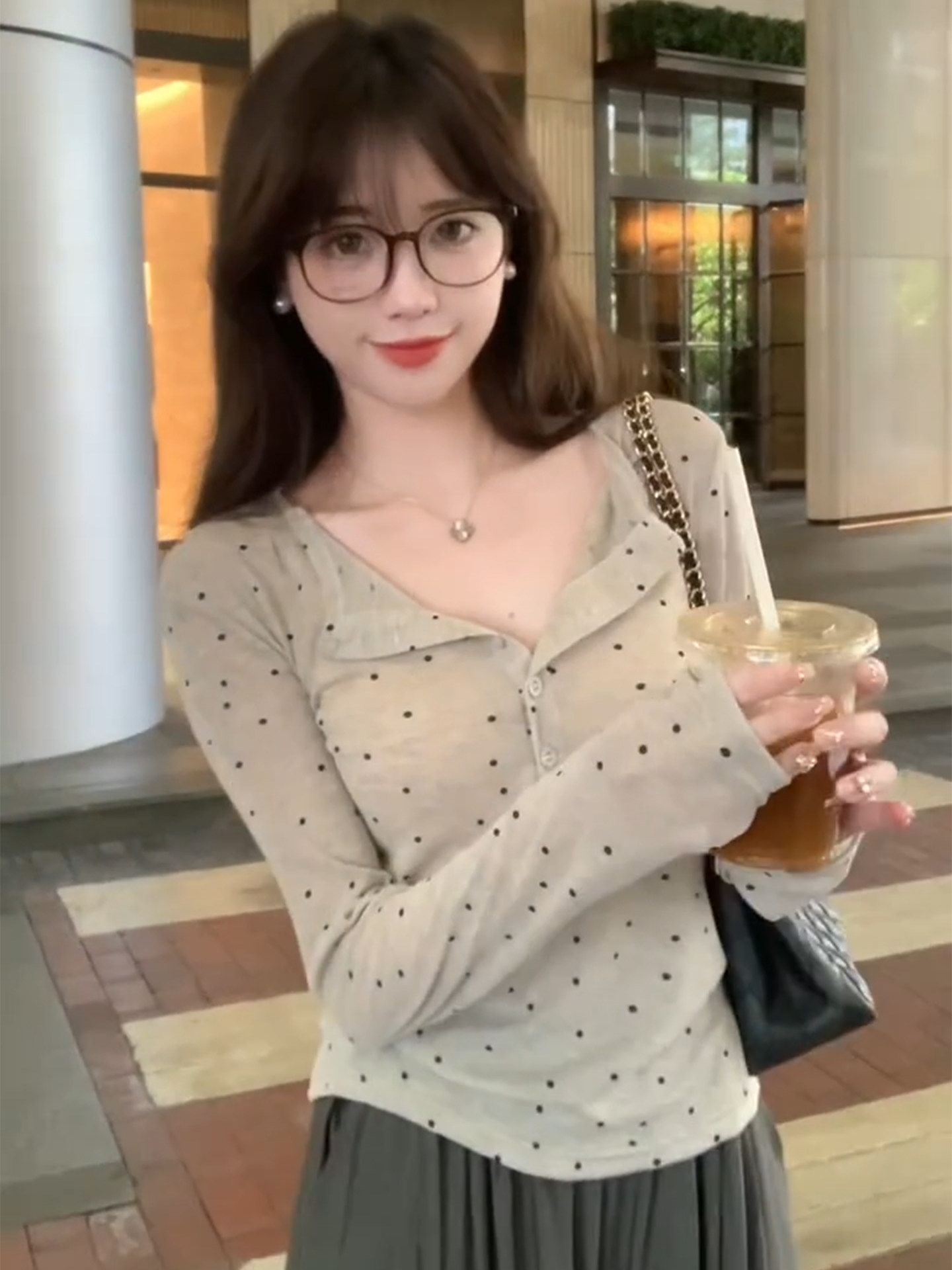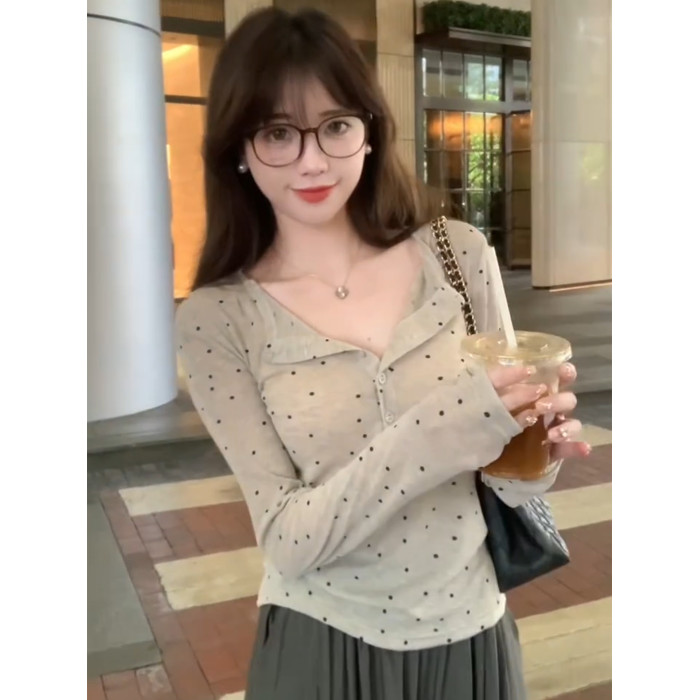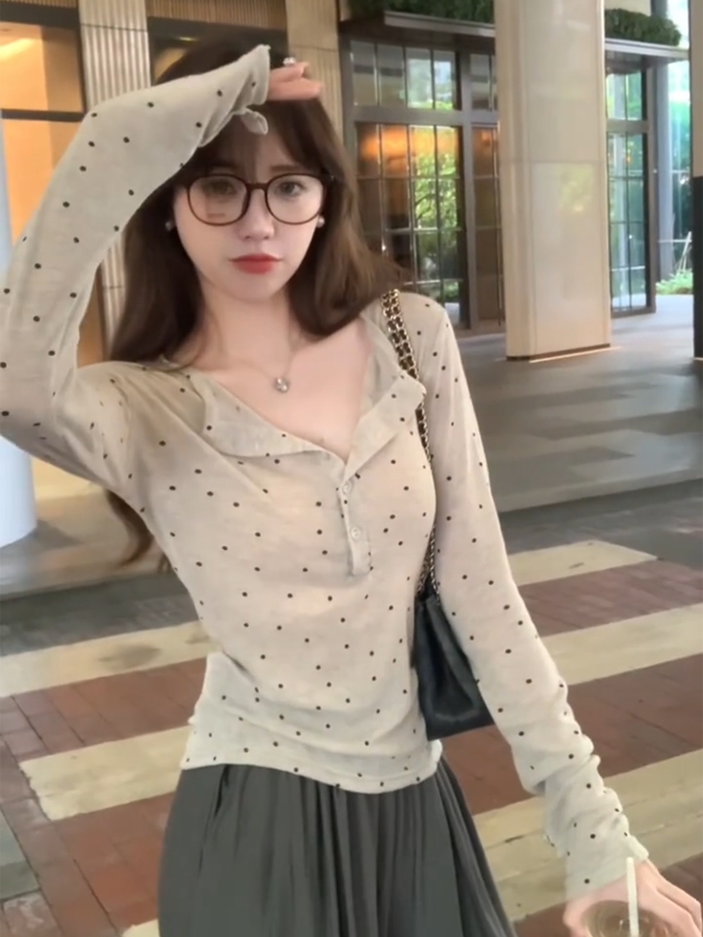 美式街頭波點正肩長袖T恤女夏季修身顯瘦辣妹微透薄款打底衫上衣