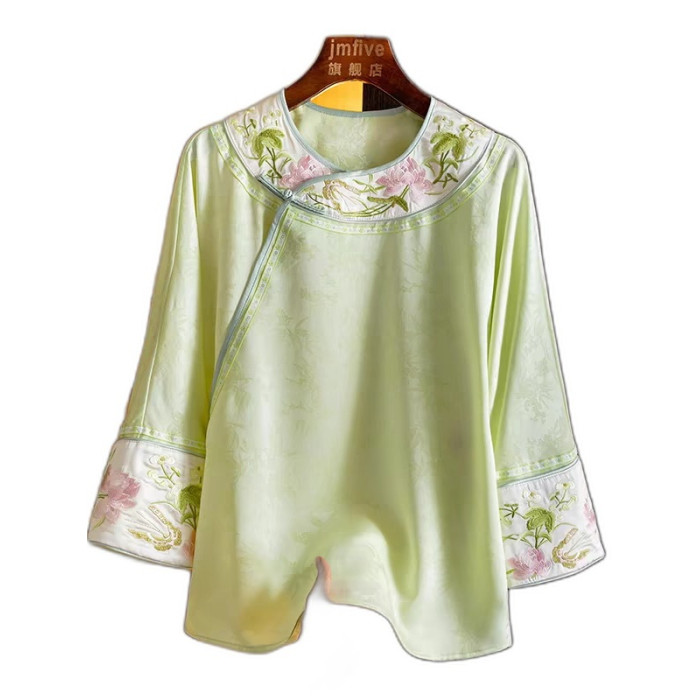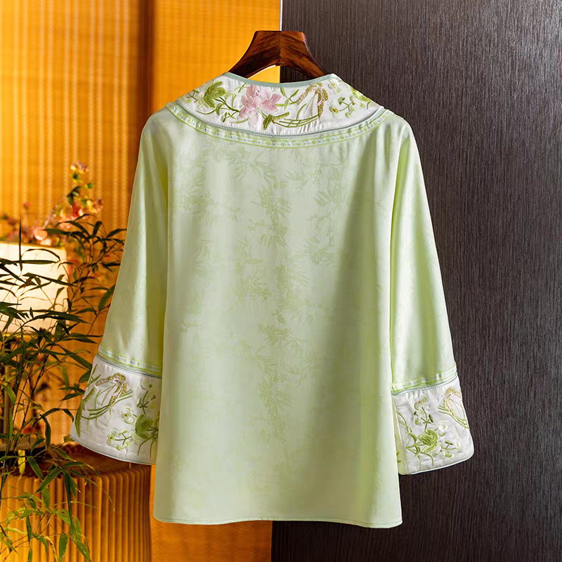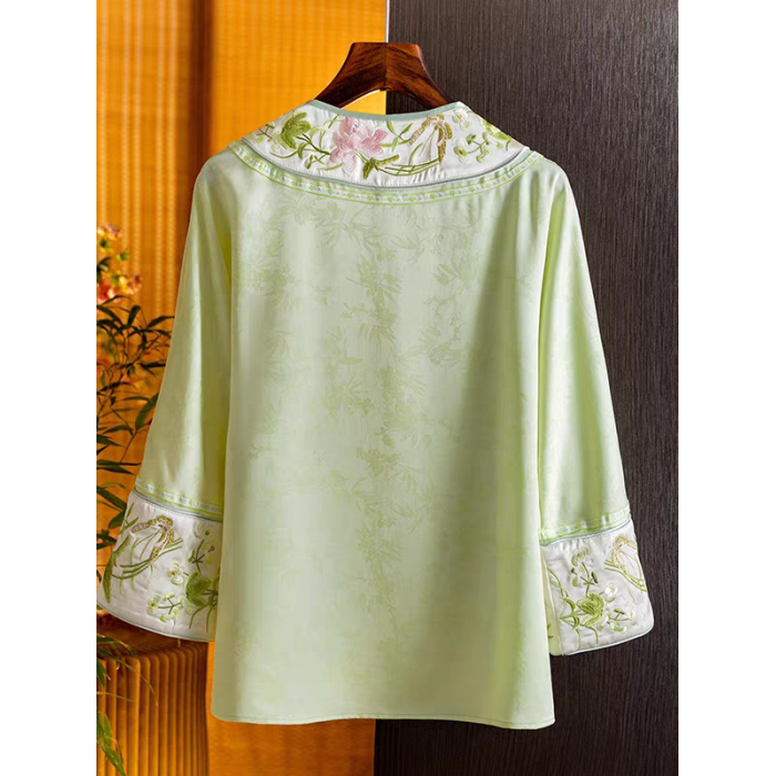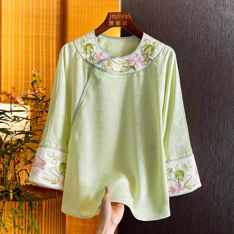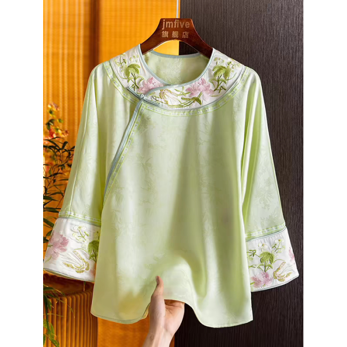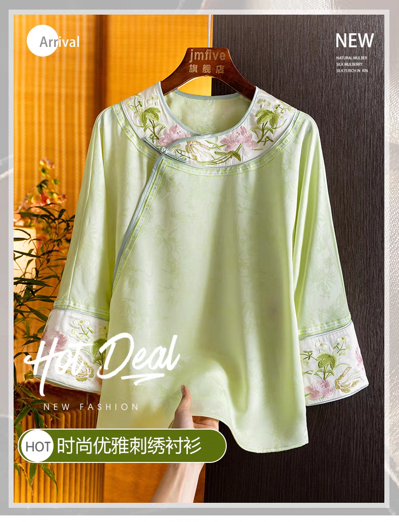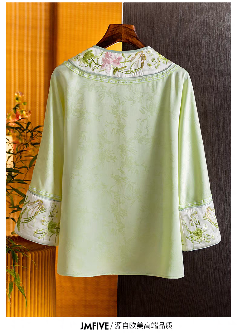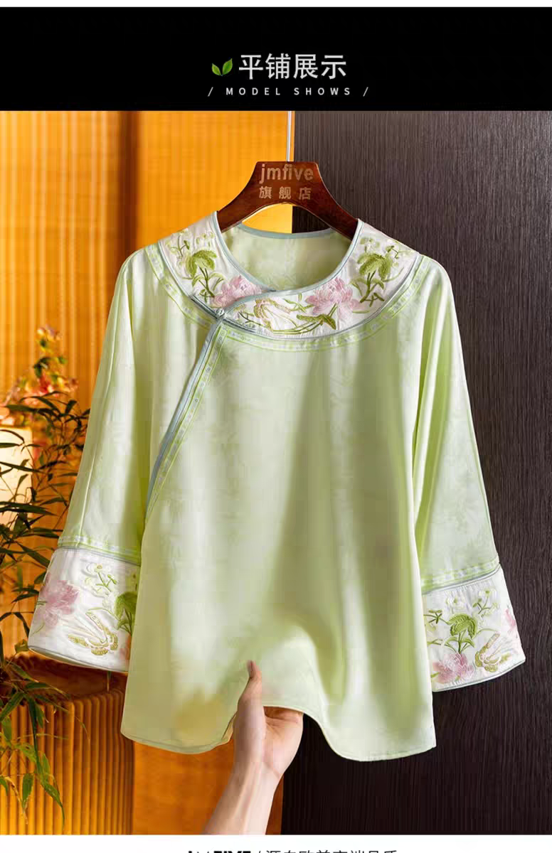 新中式醋酸花卉刺綉襯衫女2025夏季新品時尚優雅復古氣質上衣