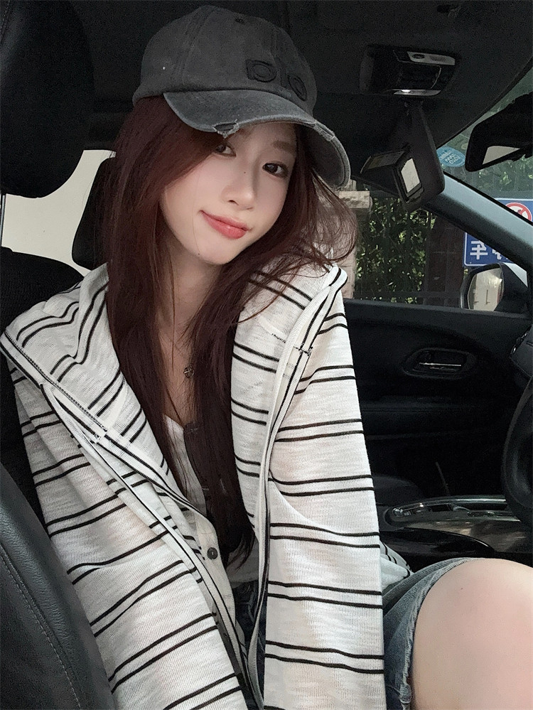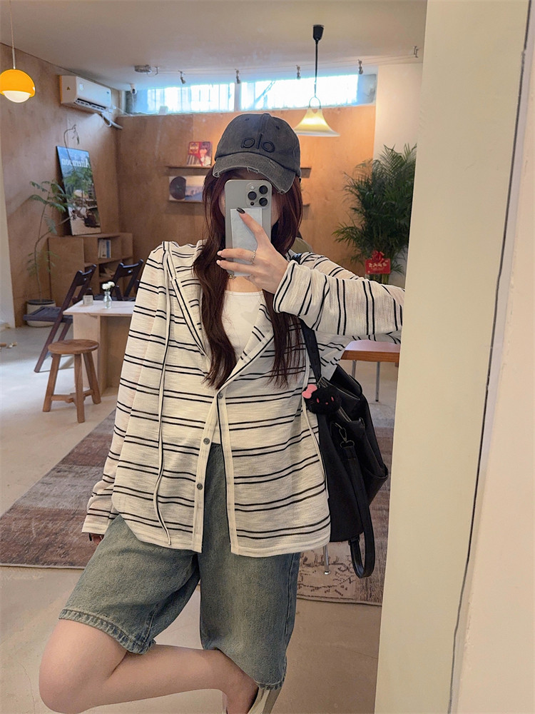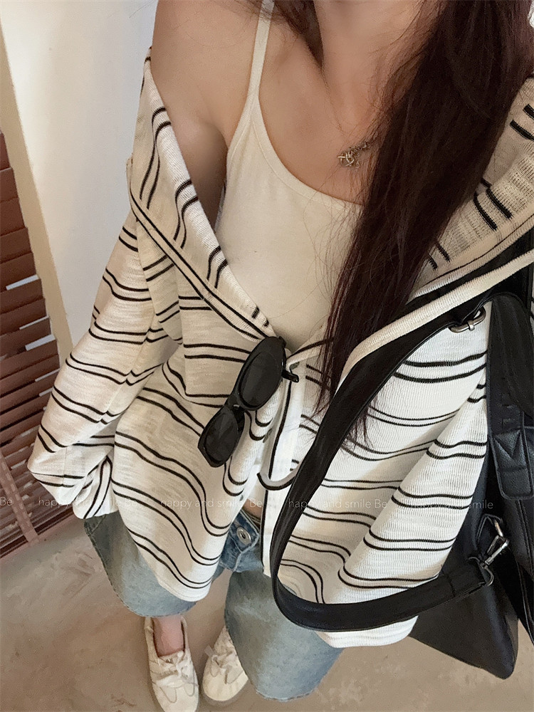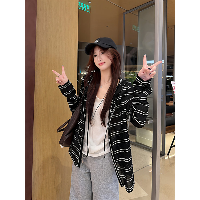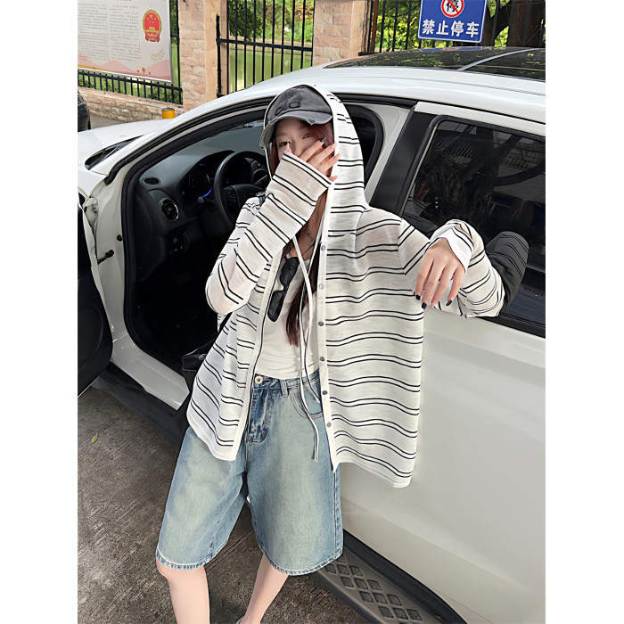 2026年新款春裝休閒風條紋長袖連帽開衫外套女夏季薄款防曬衫上衣
