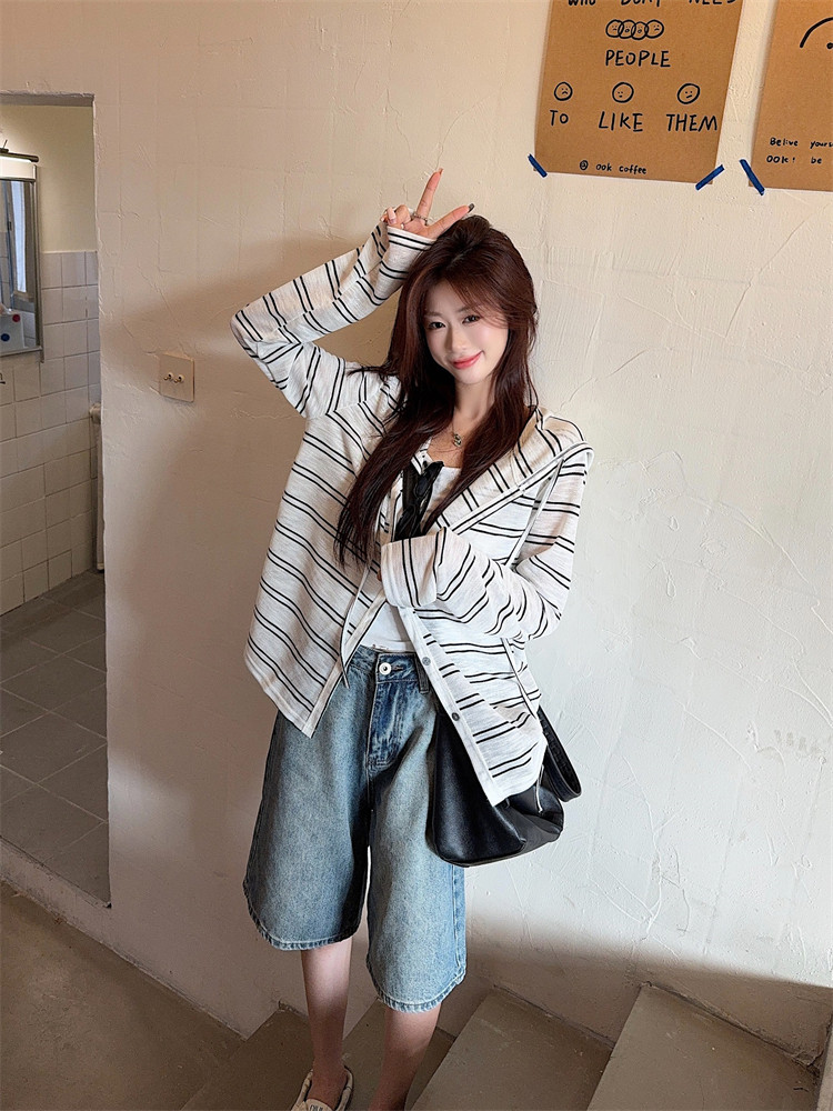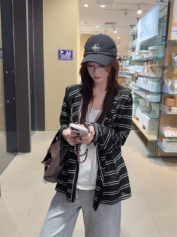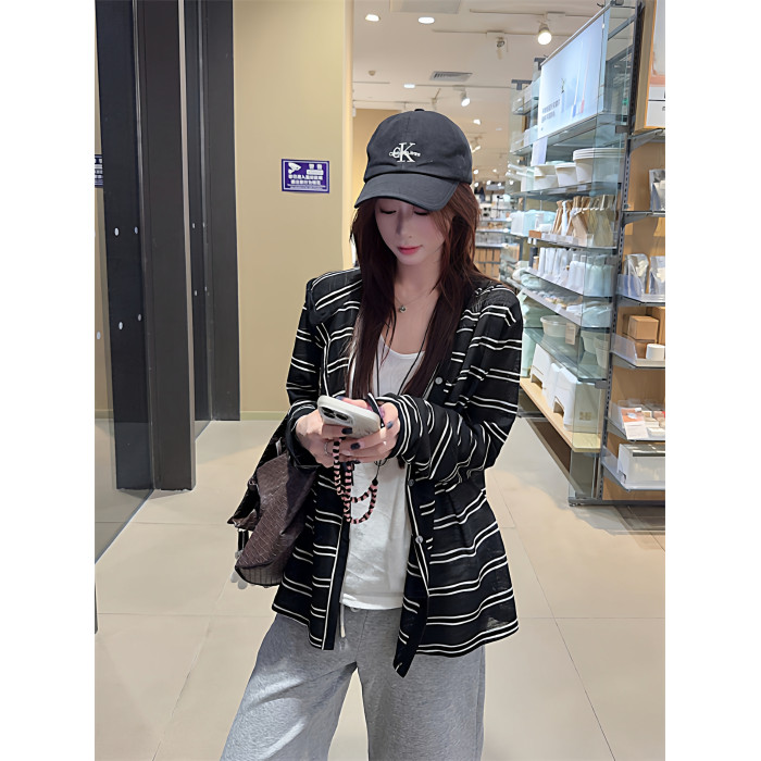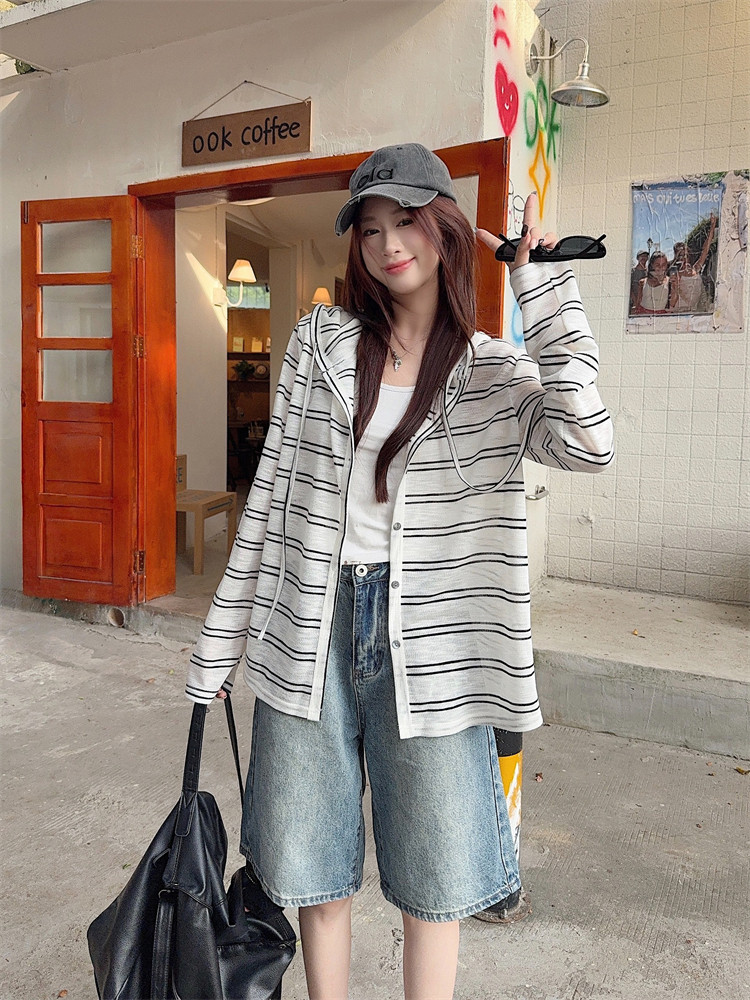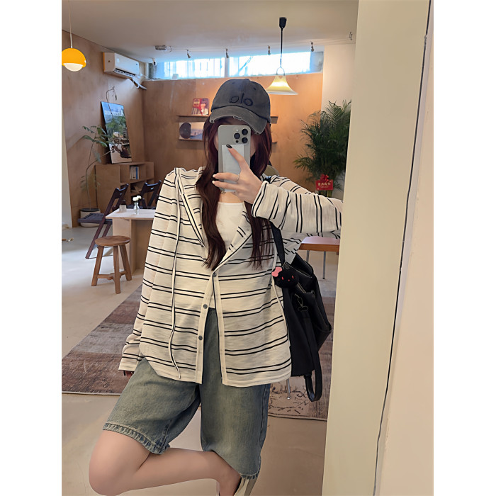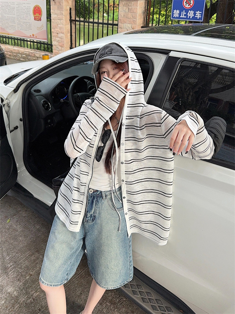 2026年新款春裝休閒風條紋長袖連帽開衫外套女夏季薄款防曬衫上衣