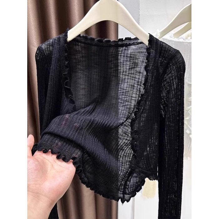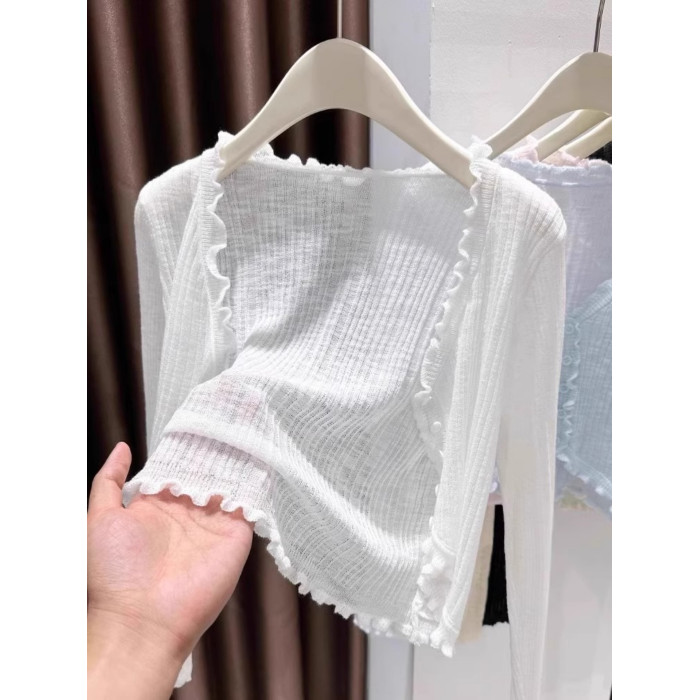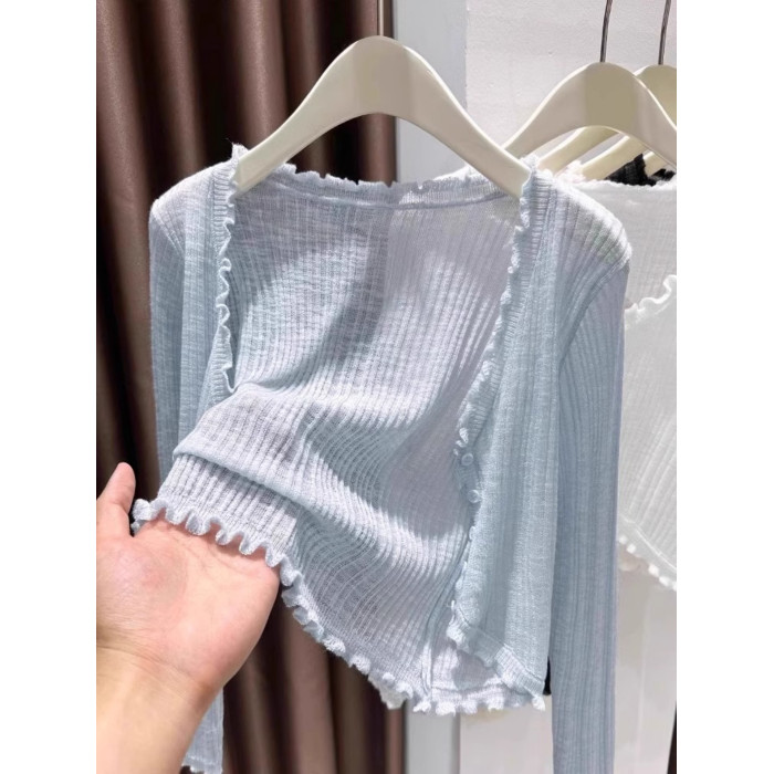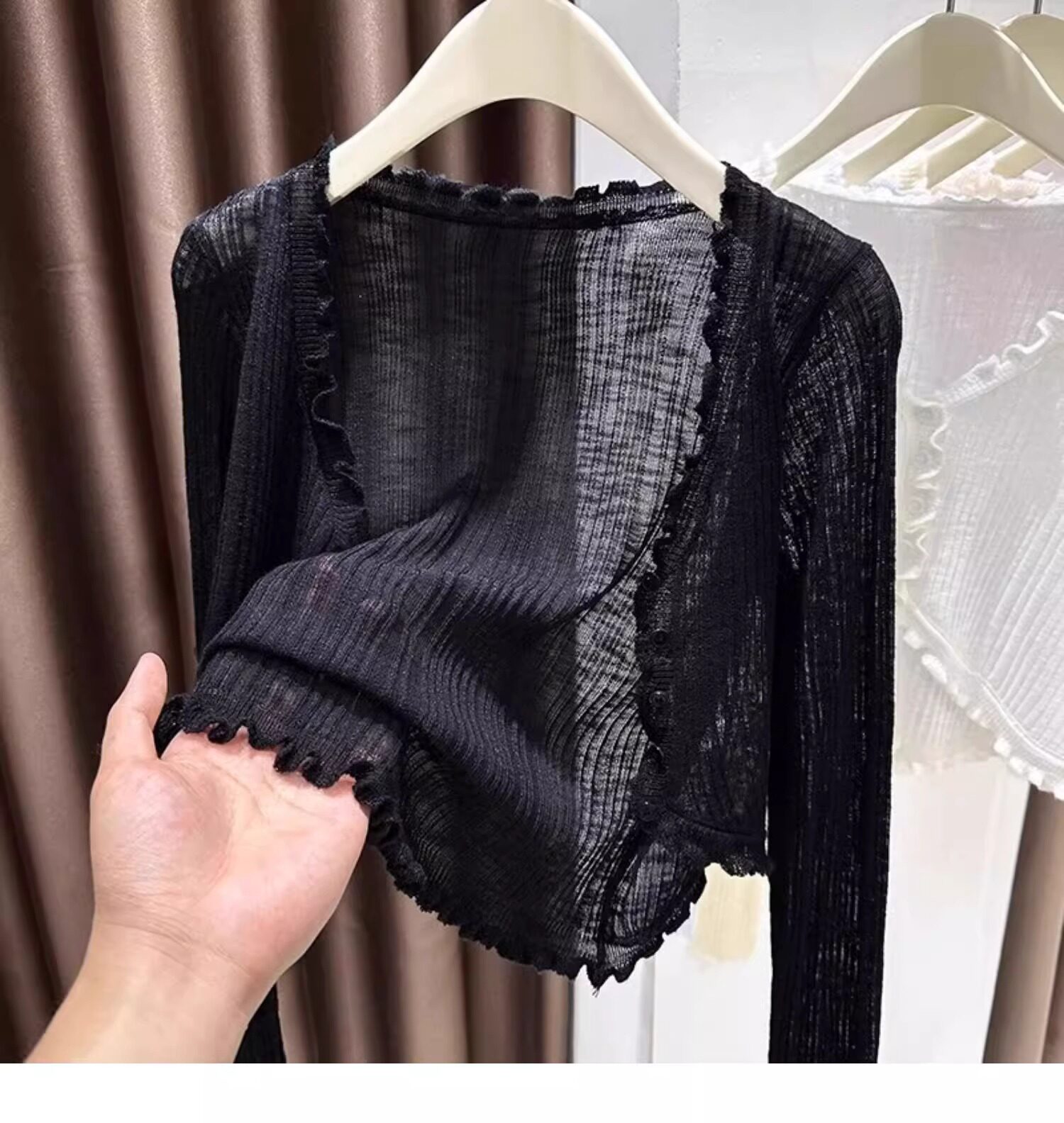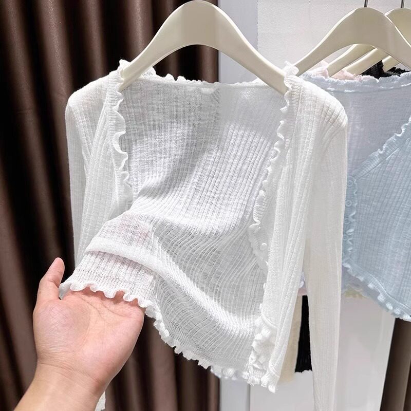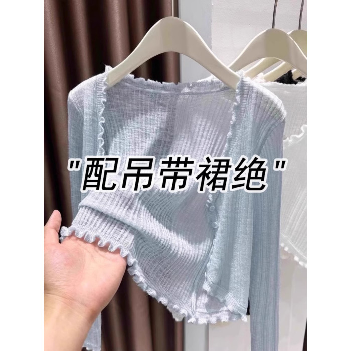 花邊藍色冰絲針織開衫女薄款夏配吊帶裙外搭薄款微透披肩V領罩衫