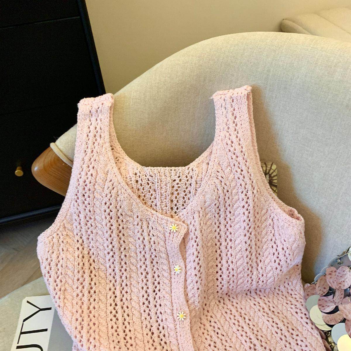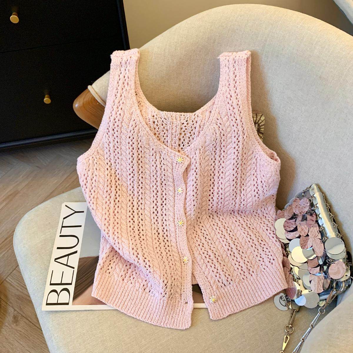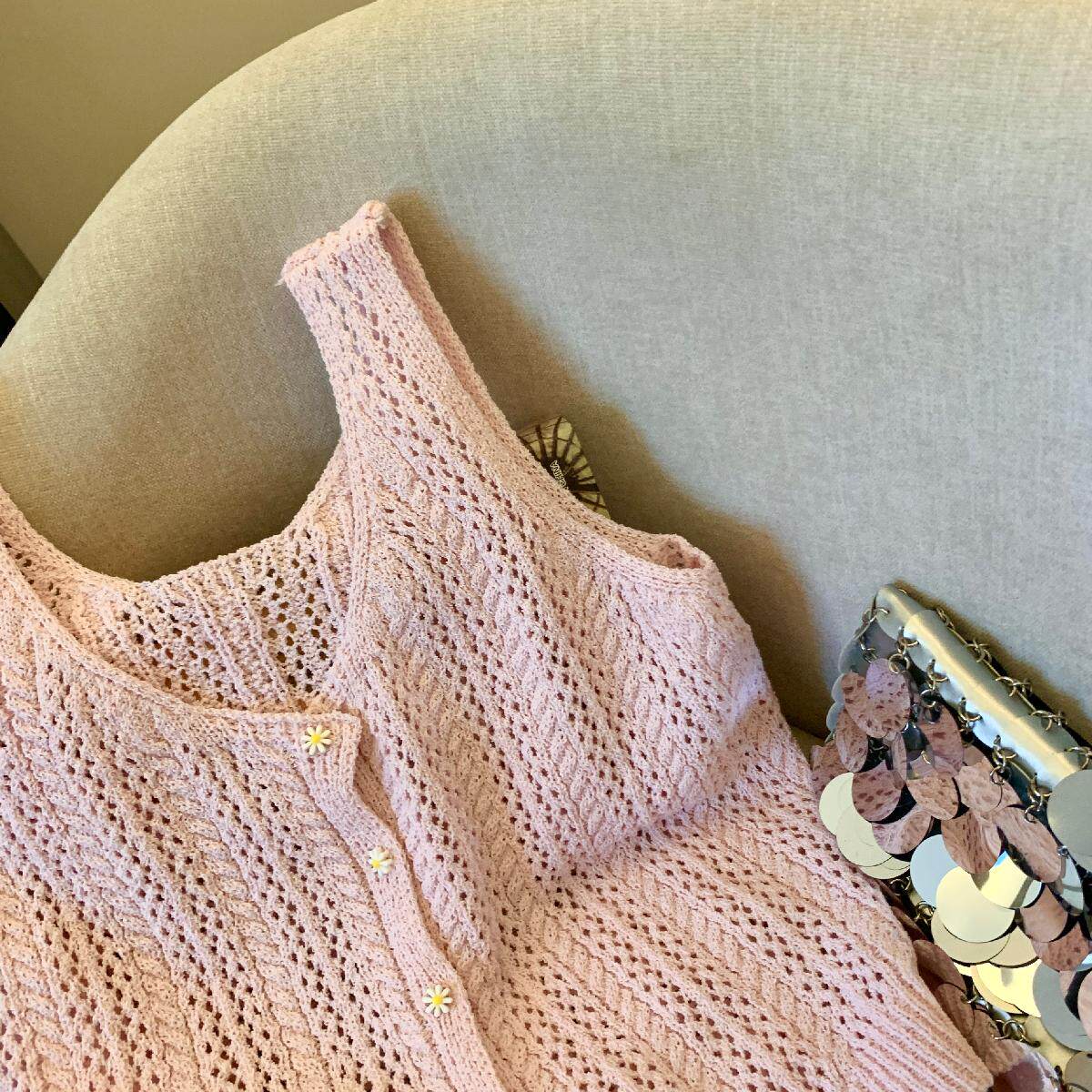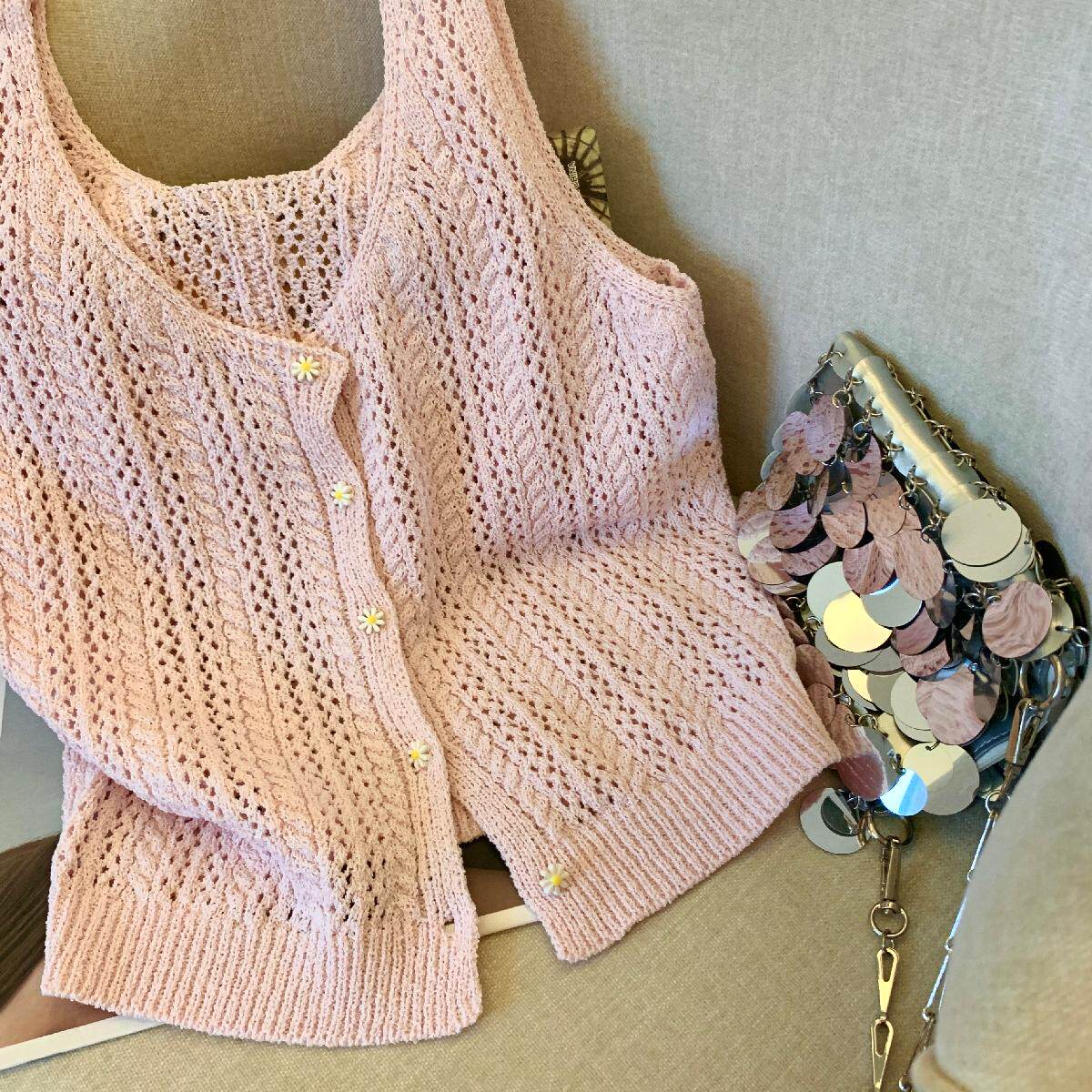 四季青女裝~復古鉤花慵懶風針織衫女寬鬆短款單排釦吊帶鏤空背心