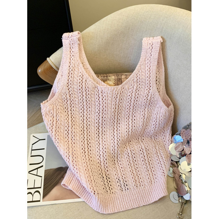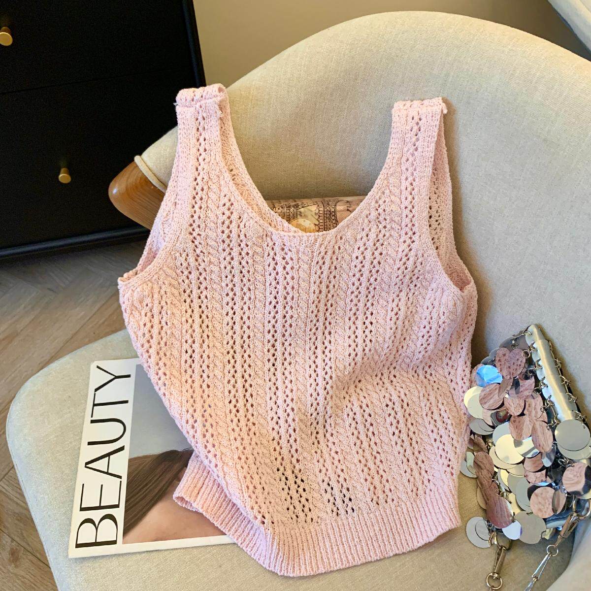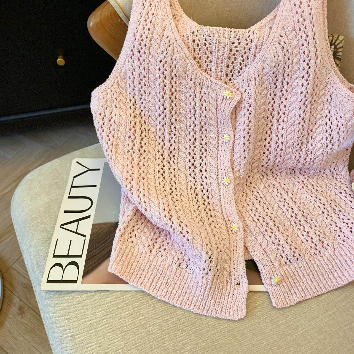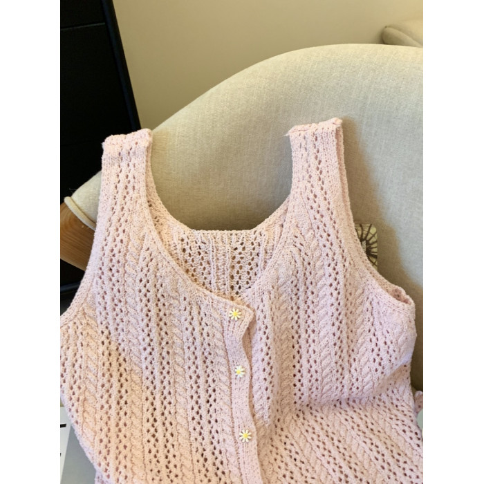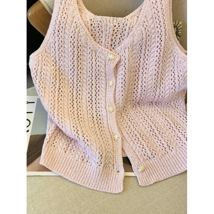 四季青女裝~復古鉤花慵懶風針織衫女寬鬆短款單排釦吊帶鏤空背心