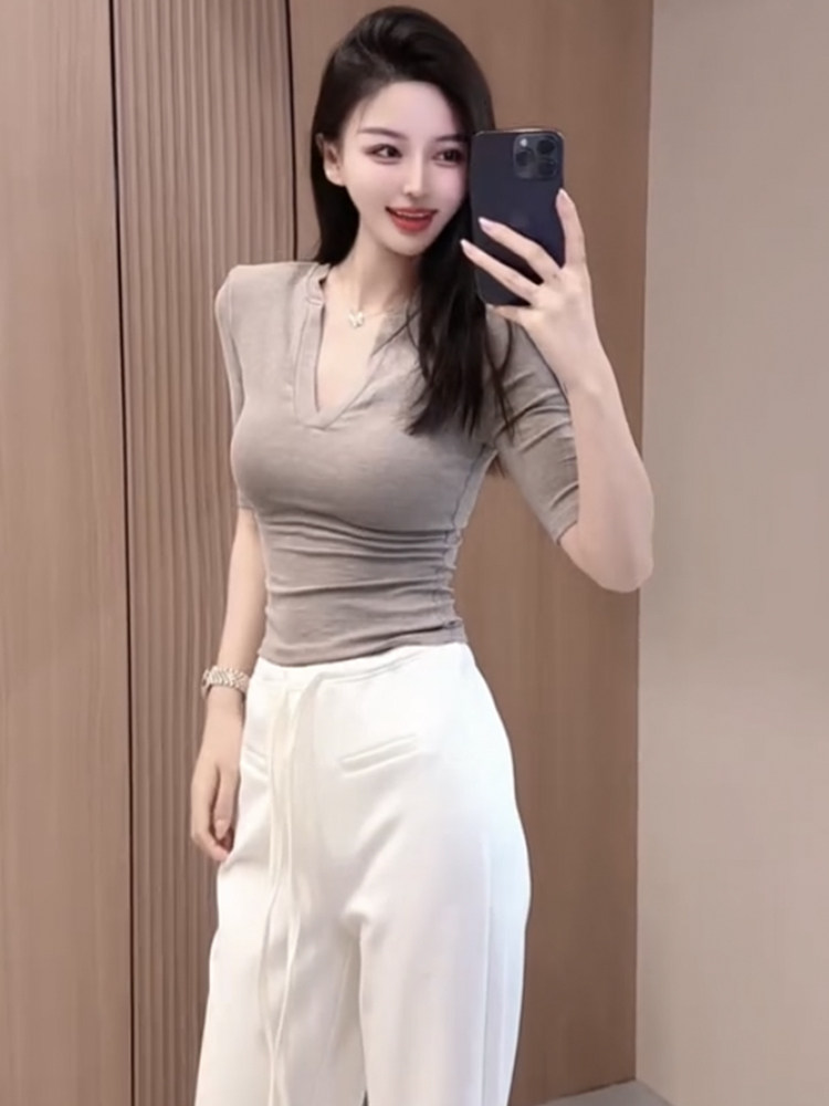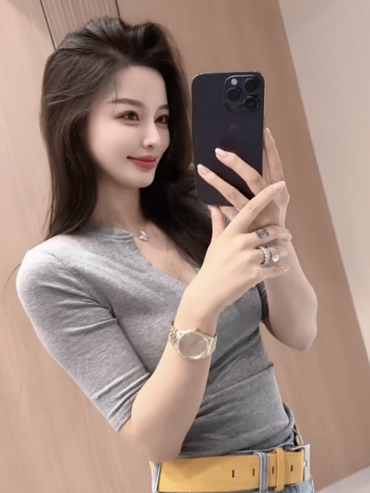 性感辣妹半開領正肩五分袖T恤女2025夏季新款設計感顯瘦短款上衣