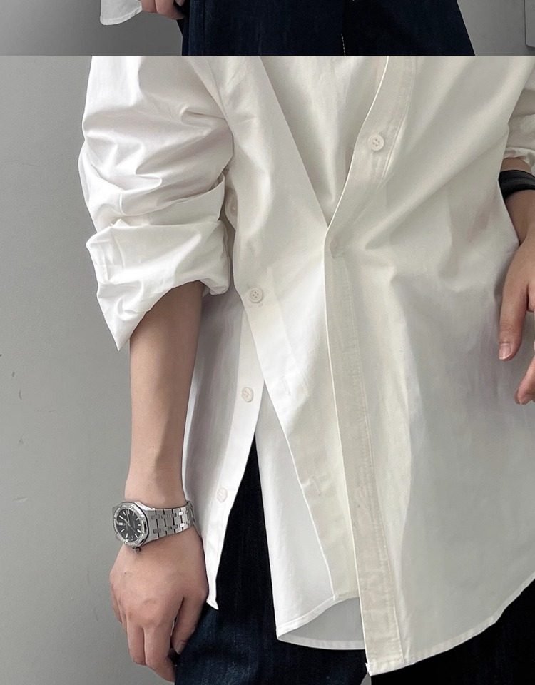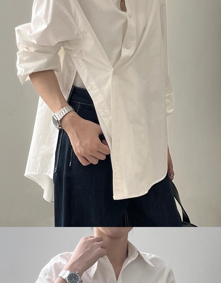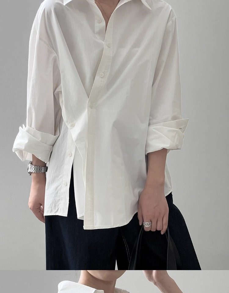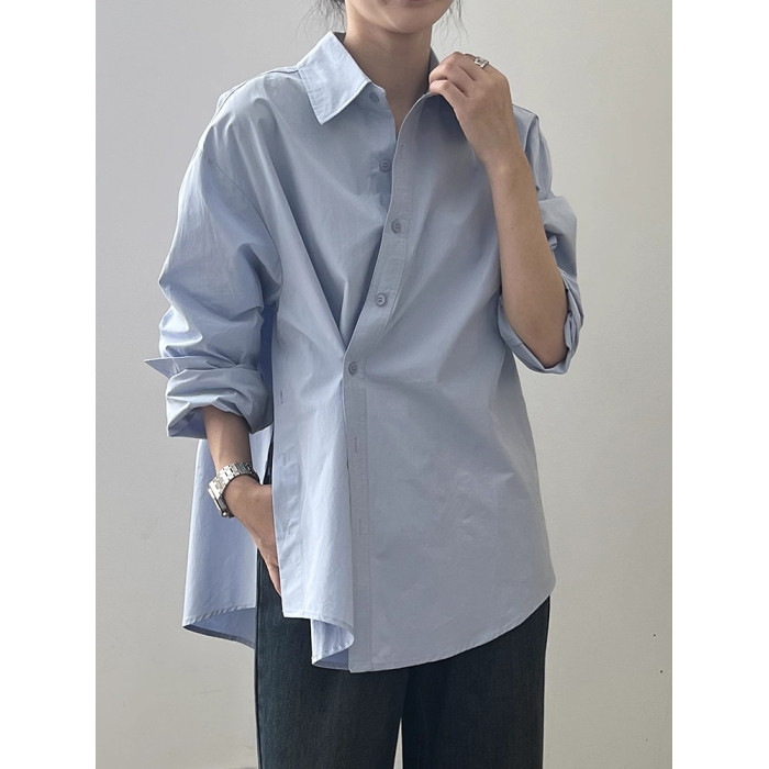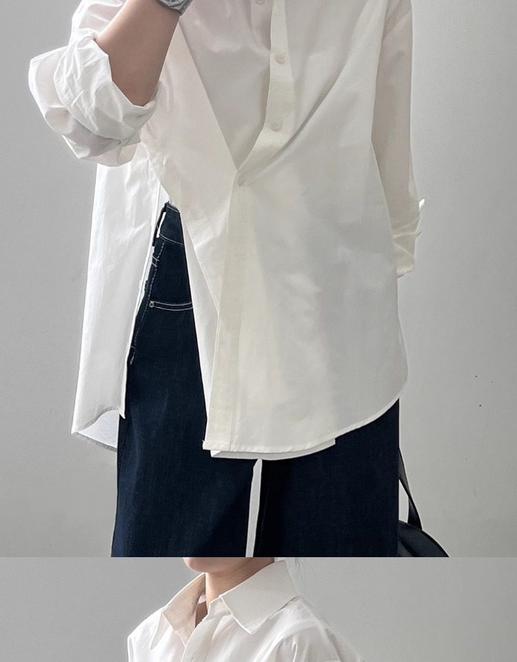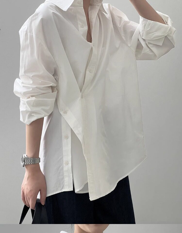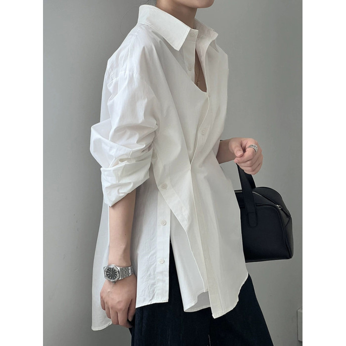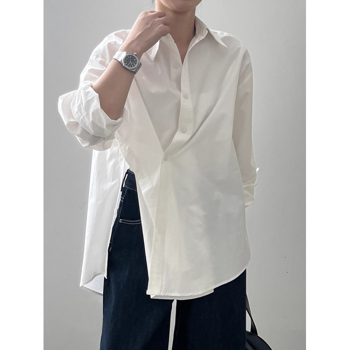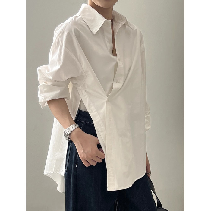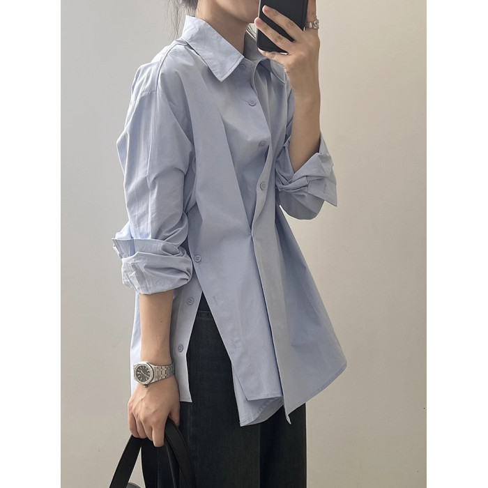 韓版高級感不規則側開叉白色長袖襯衫女寬鬆休閒簡約時尚防曬襯衣