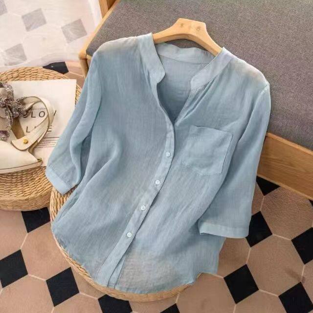 文藝復古夏季薄款棉麻襯衫女寬鬆V領襯衣外套休閒小衫中袖上衣女