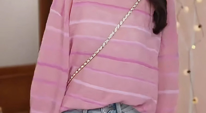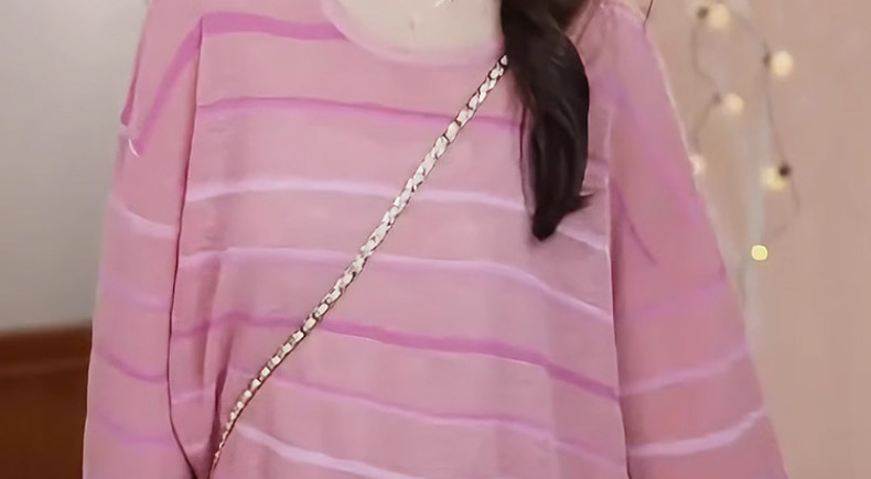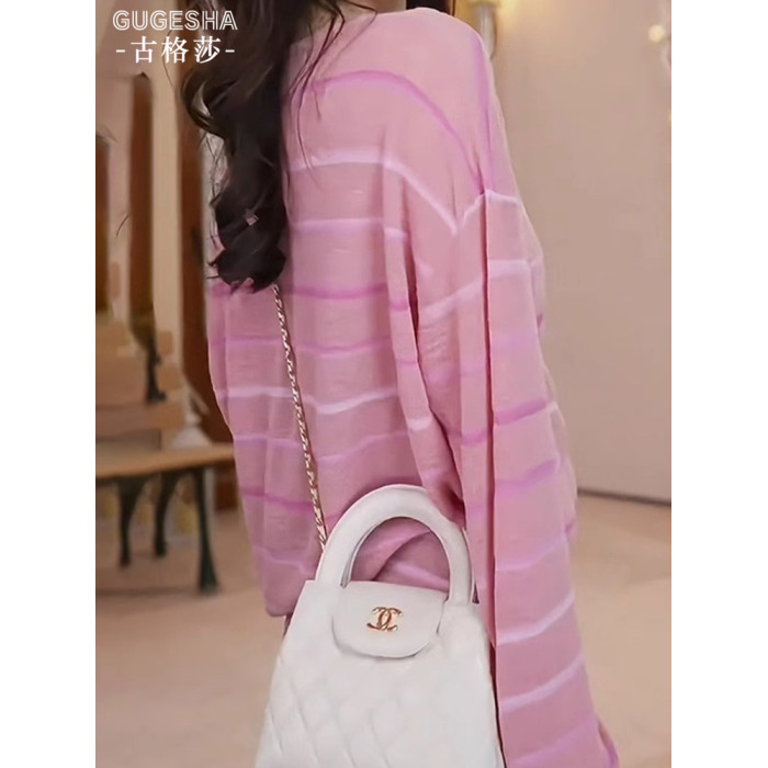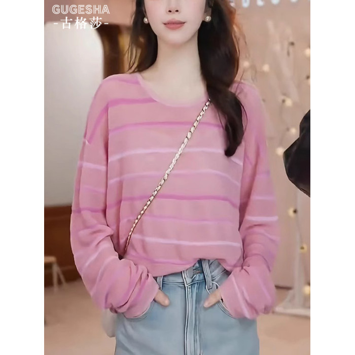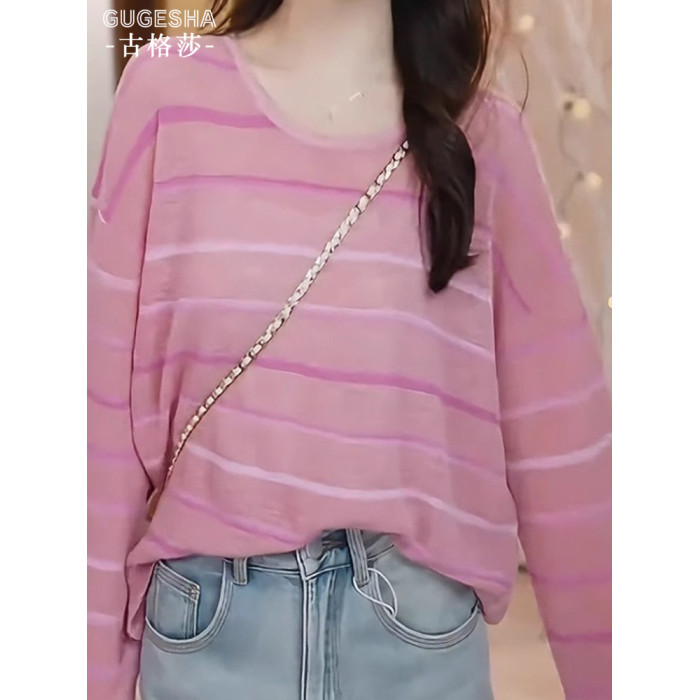 韓系小清新漸變條紋圓領長袖上衣女夏季款休閒慵懶風寬鬆防曬罩衫