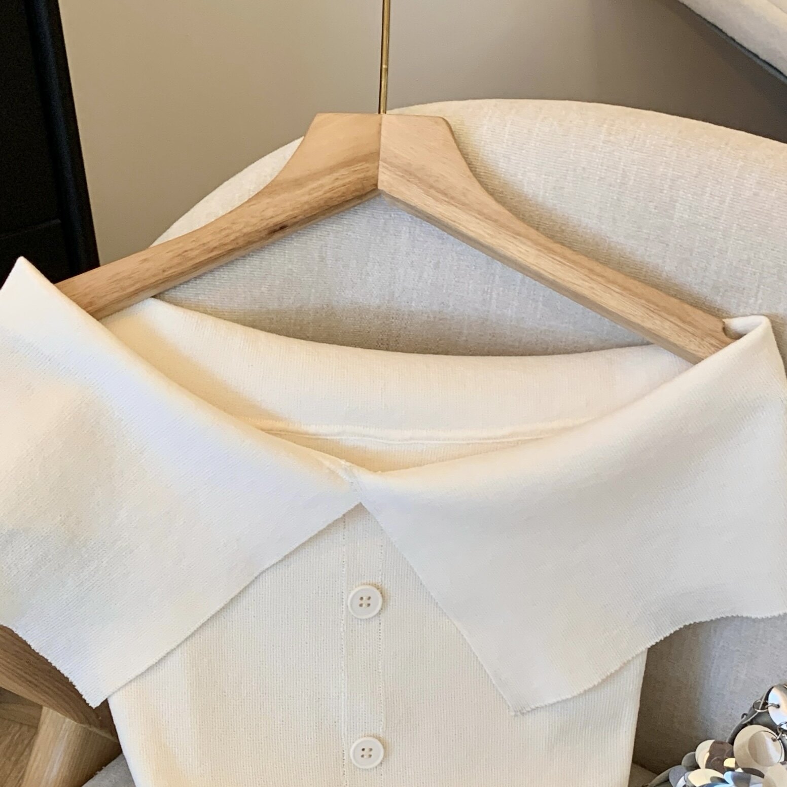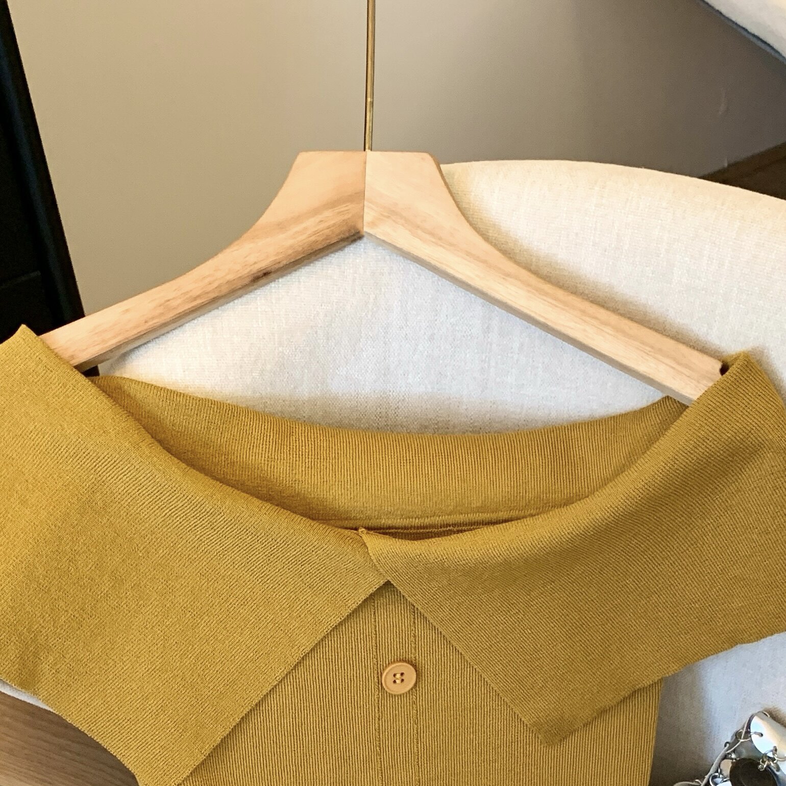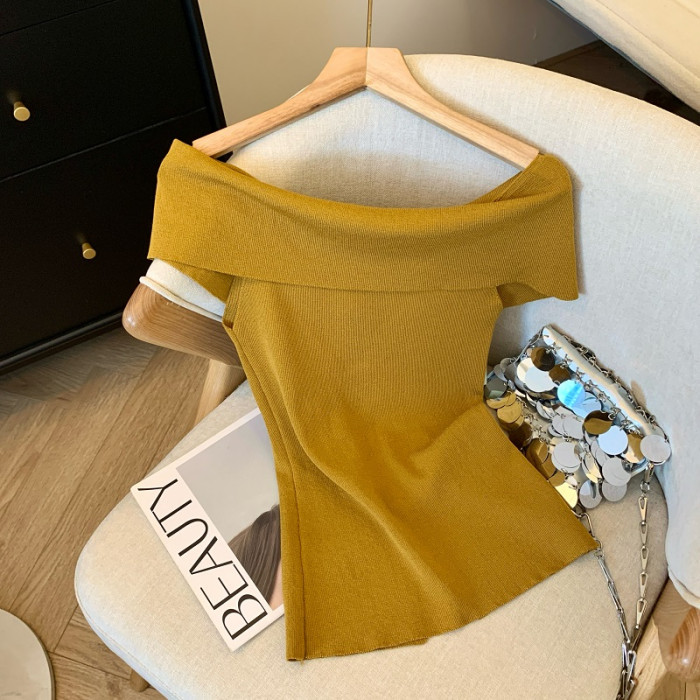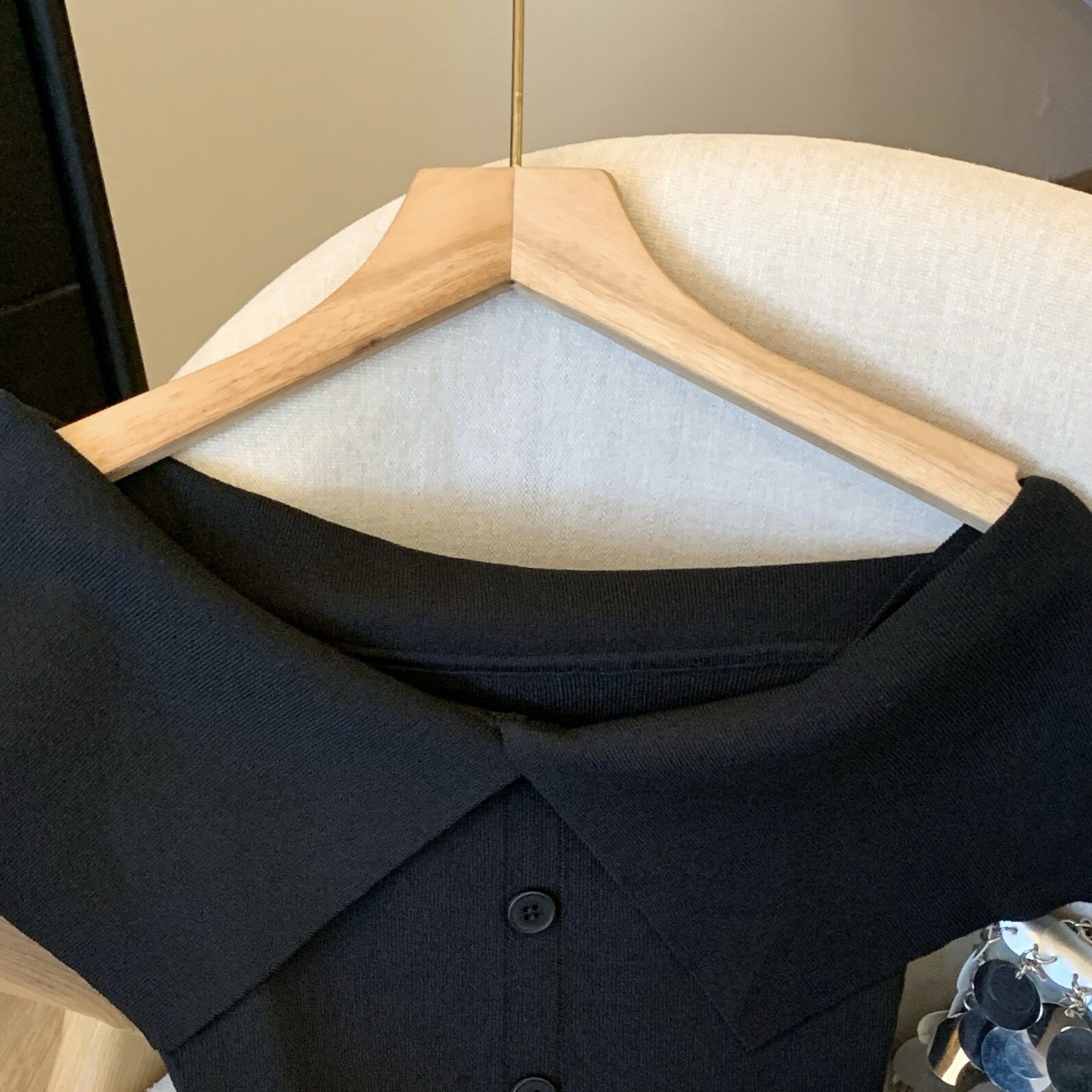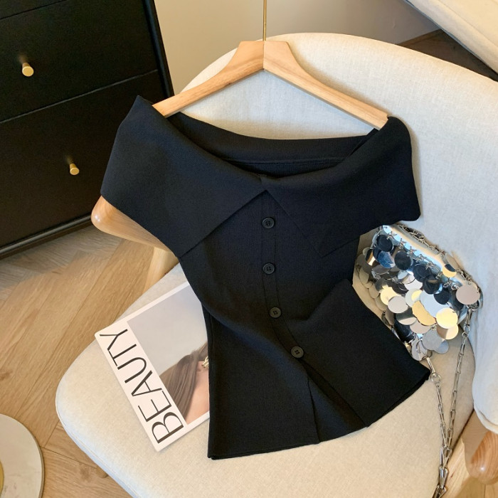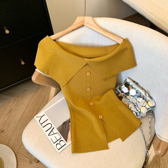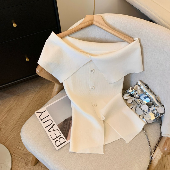專櫃撤廻剪標法式氣質一字領露肩針織衫女夏季新款單排釦顯瘦上衣