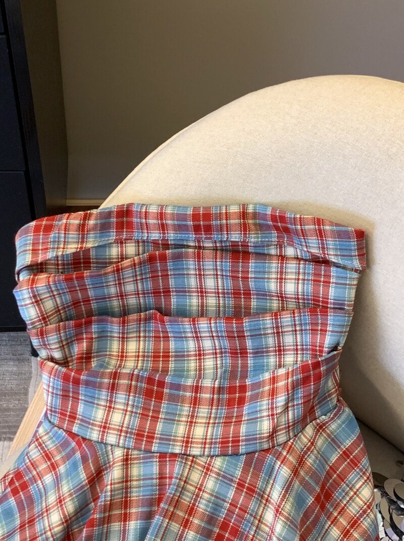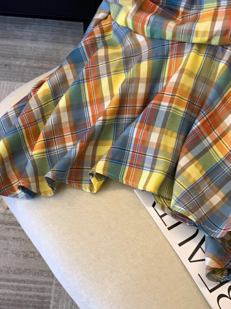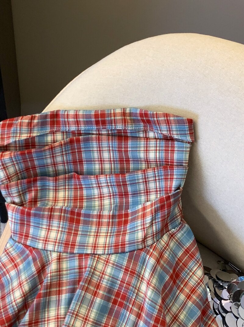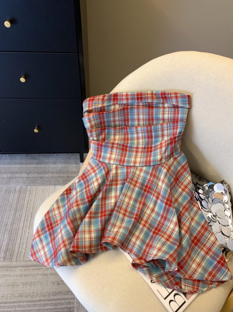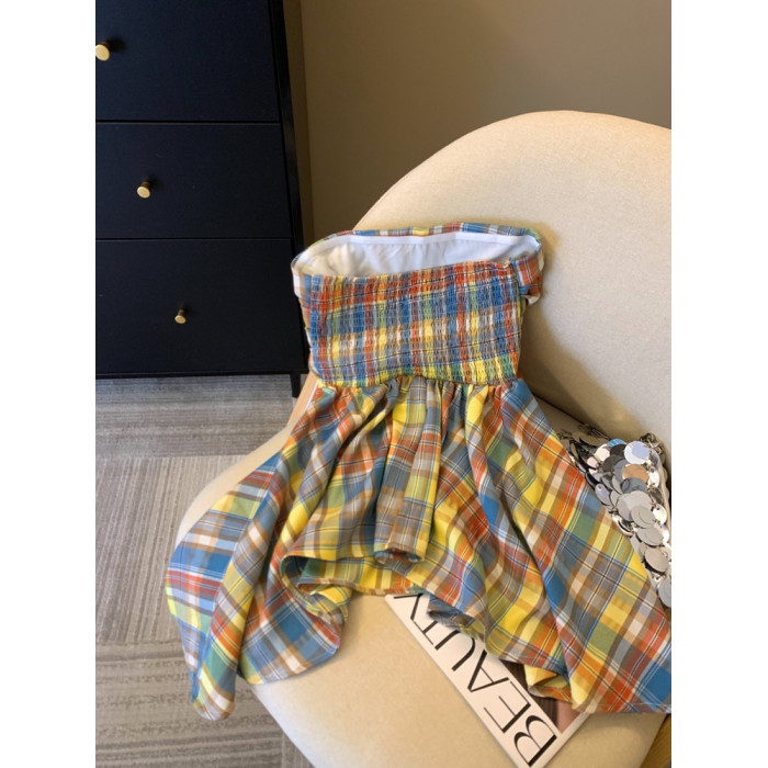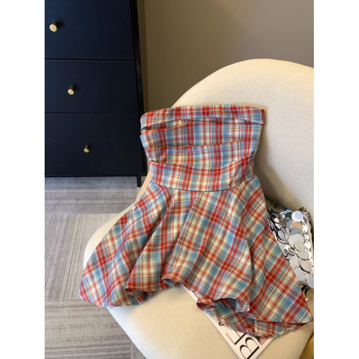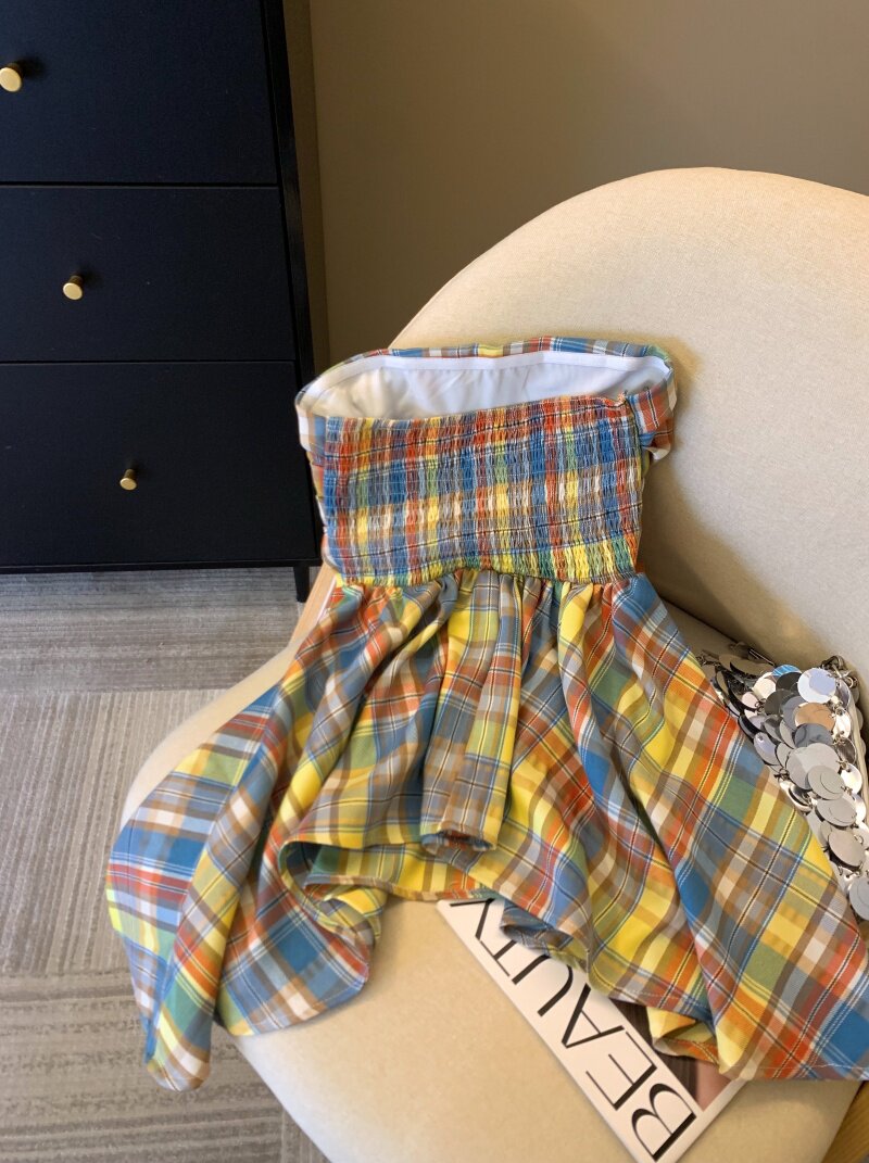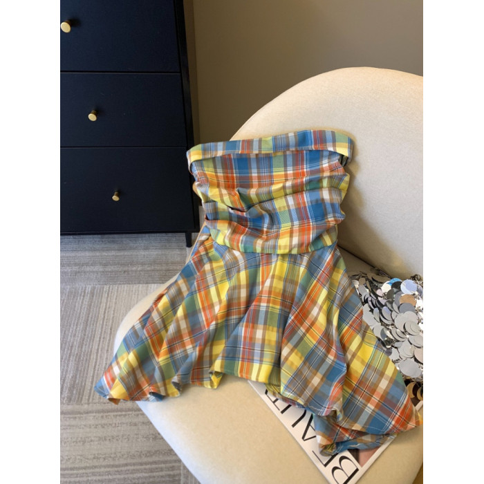 專櫃撤廻剪標多巴胺彩色格子抹胸背心女夏季不規則荷葉邊裙擺上衣