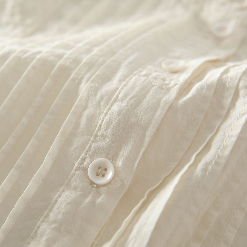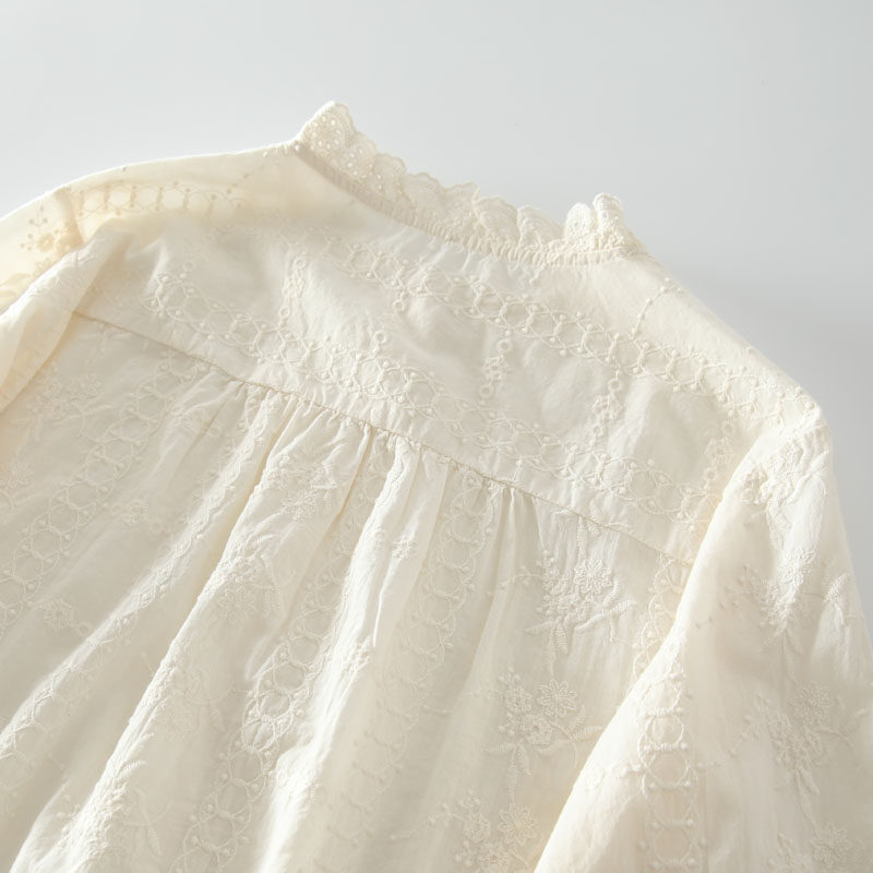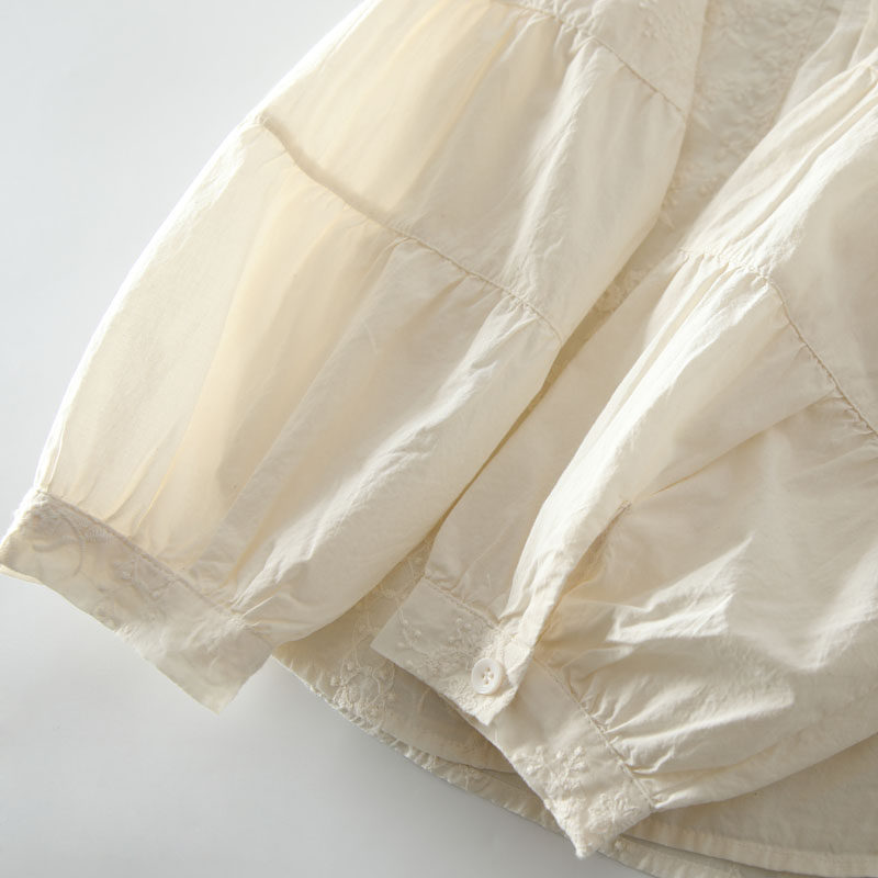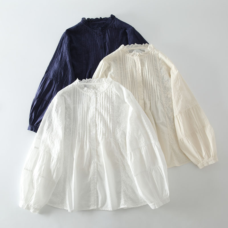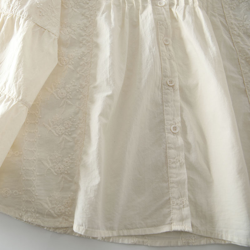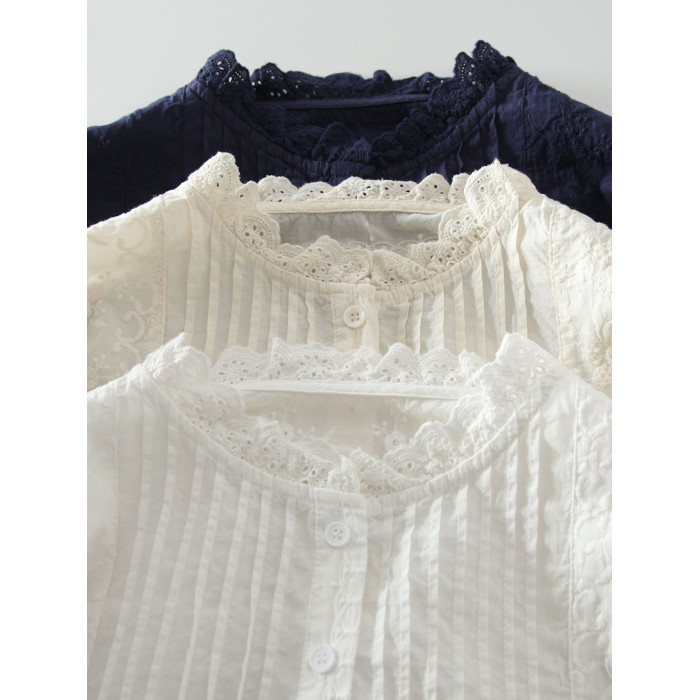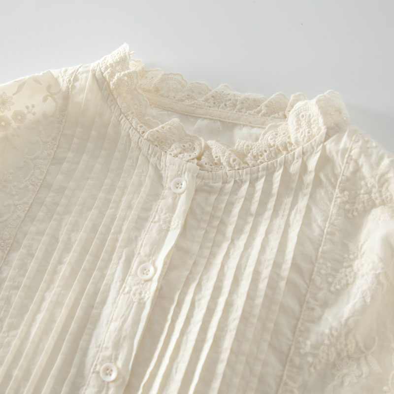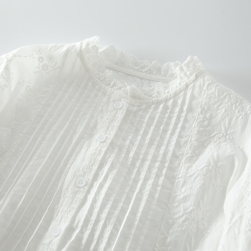 春季新款甜美風花邊領風琴褶拼接純棉刺綉長袖襯衫女百搭減齡襯衣