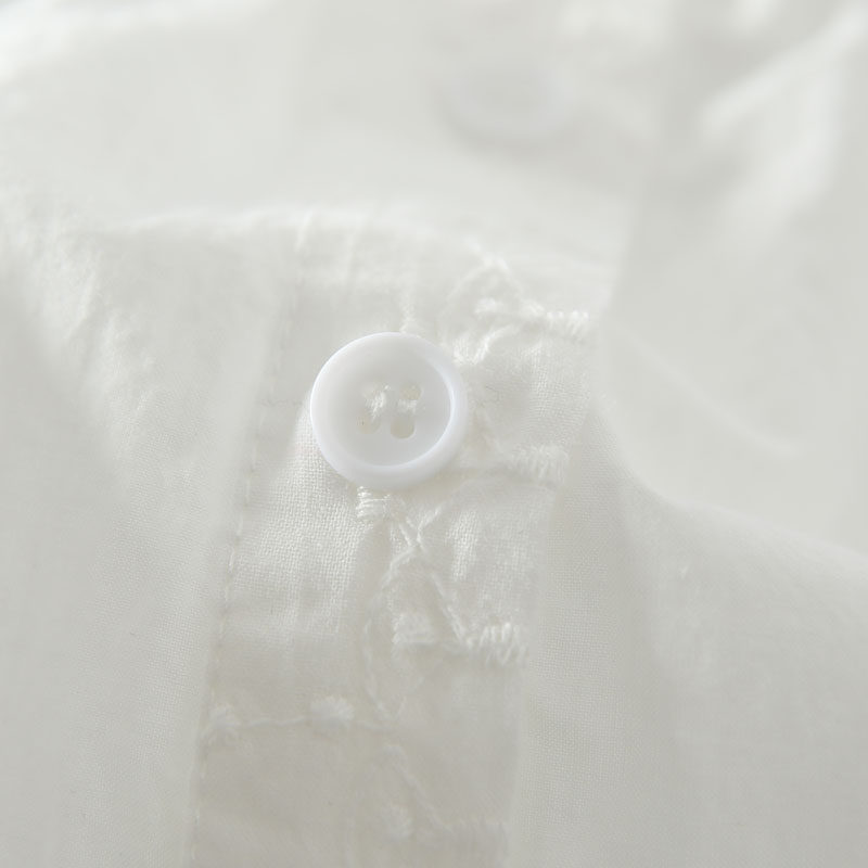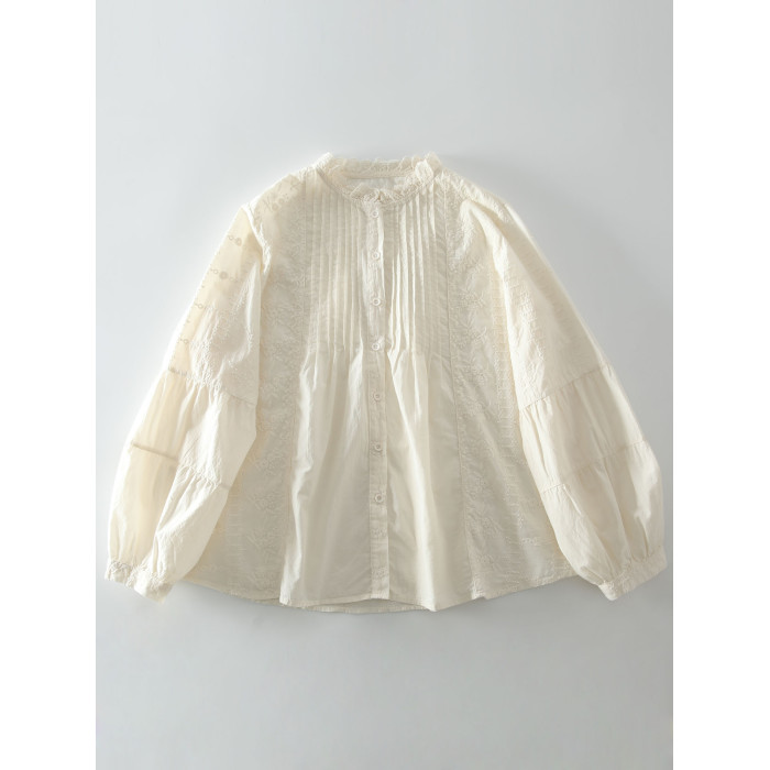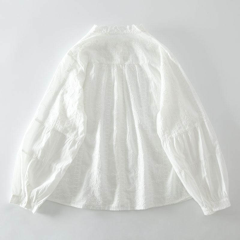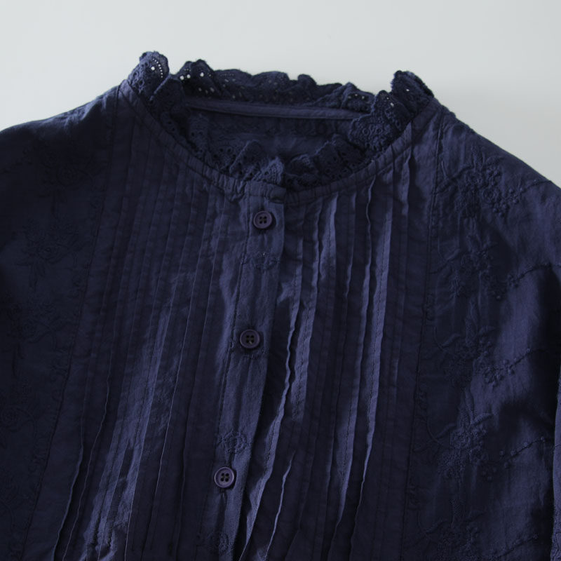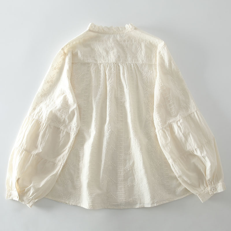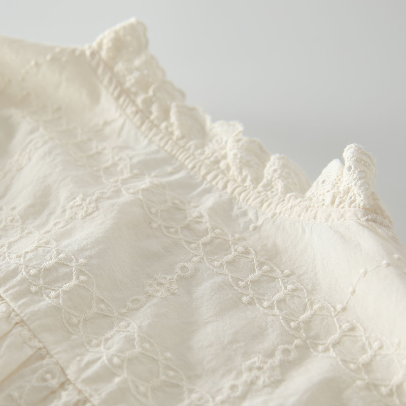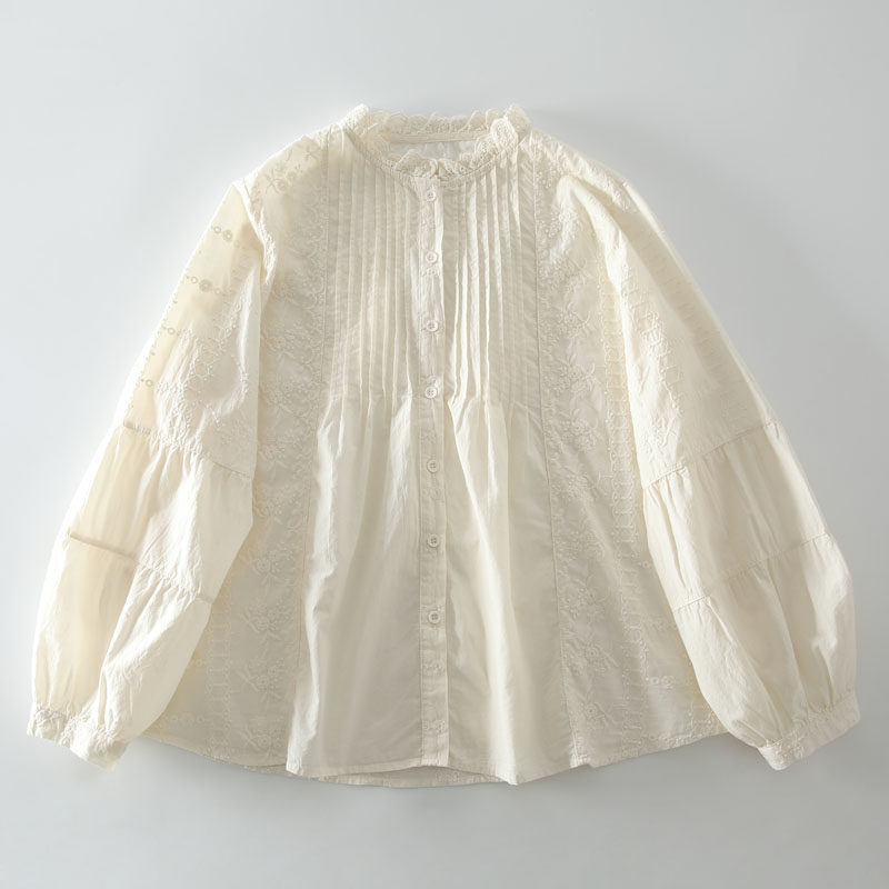 春季新款甜美風花邊領風琴褶拼接純棉刺綉長袖襯衫女百搭減齡襯衣