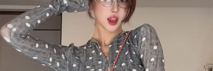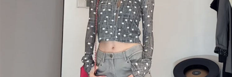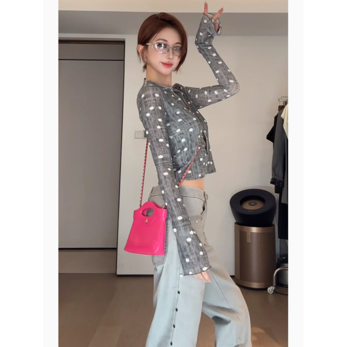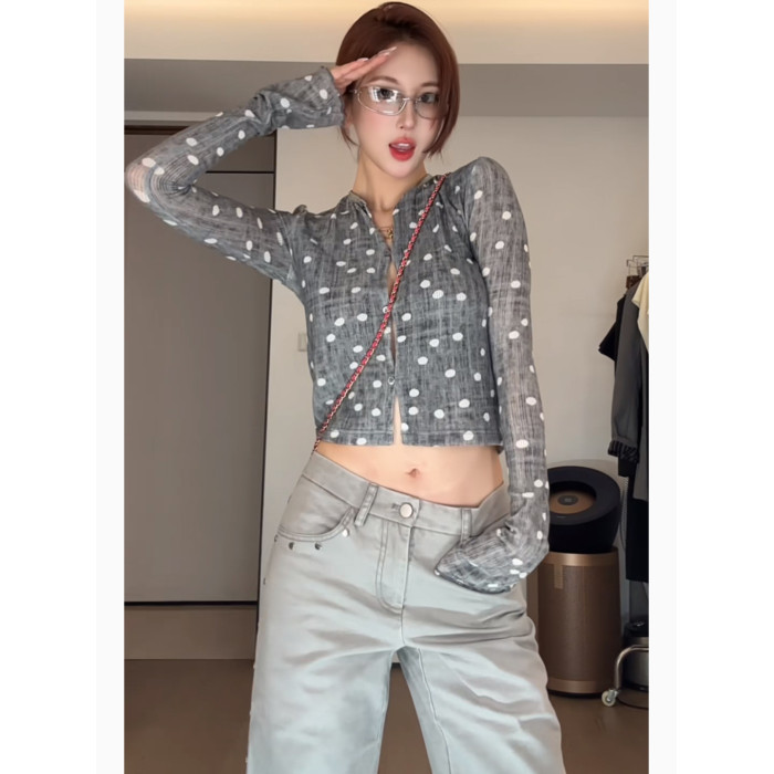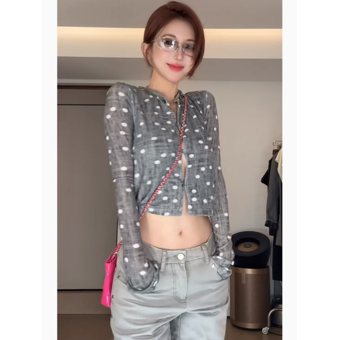 復古辣妹設計感短款露臍波點印花長袖針織開衫女早秋修身收腰上衣