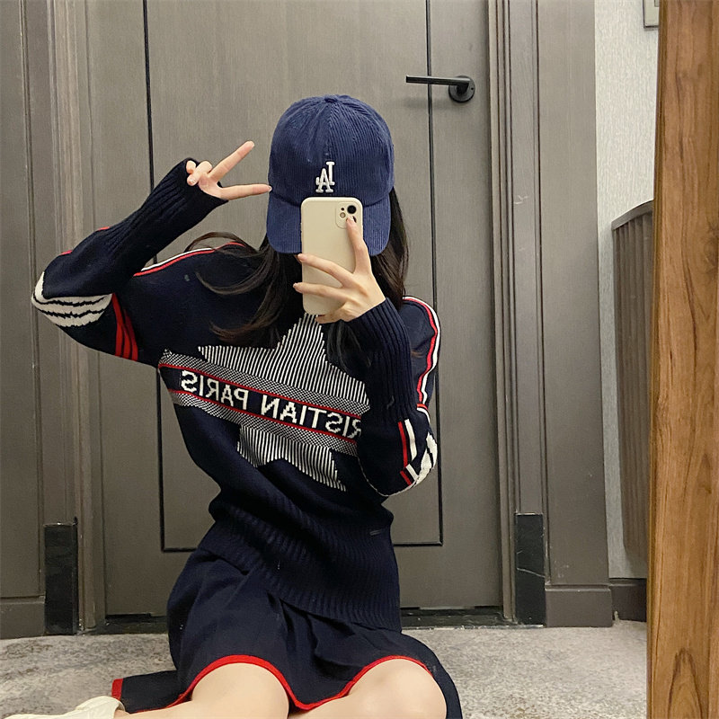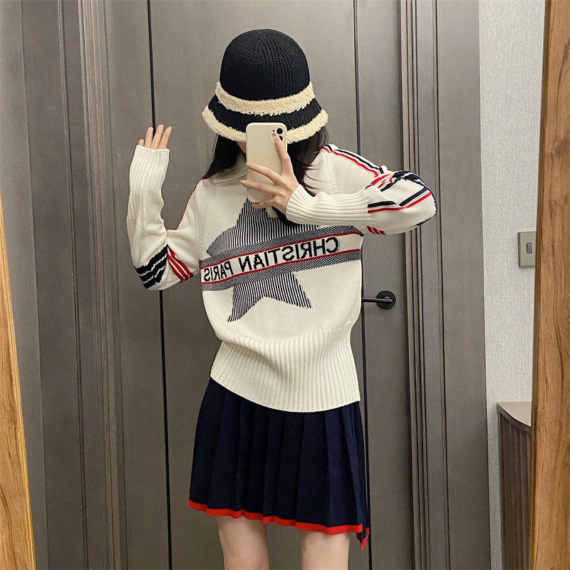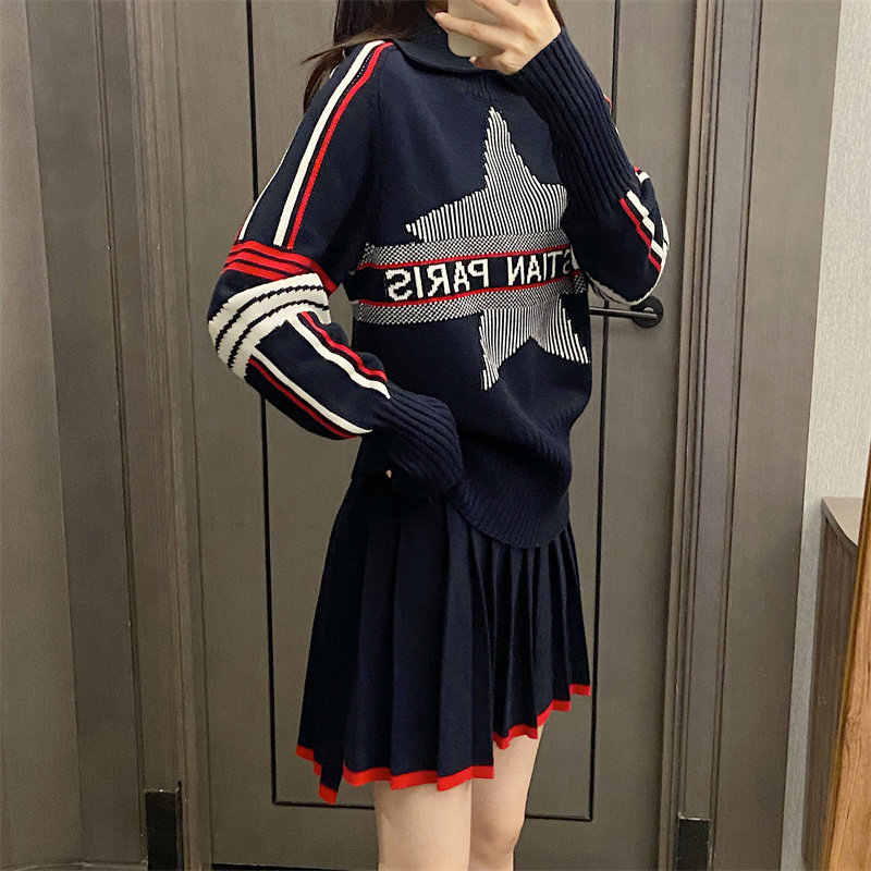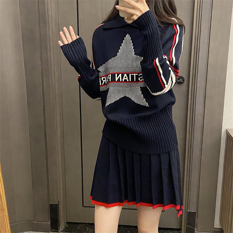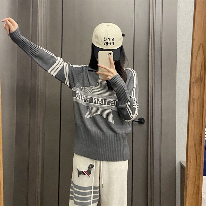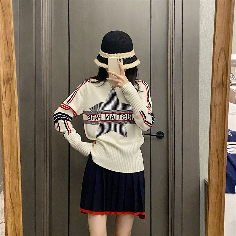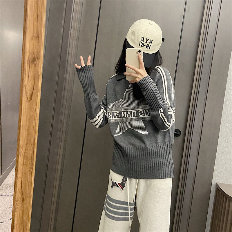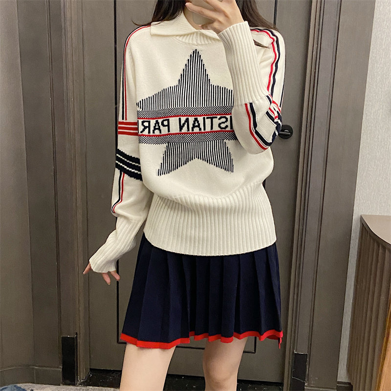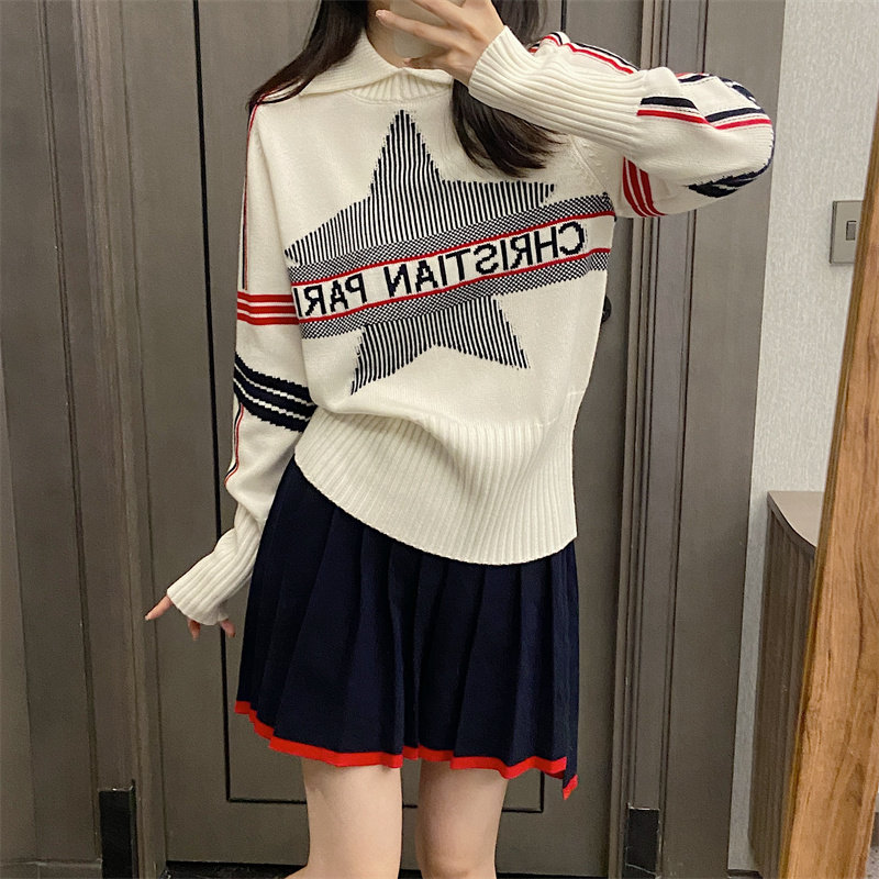25秋冬法式繙領小衆設計感打底衫毛衣五角星字母提花針織上衣百搭