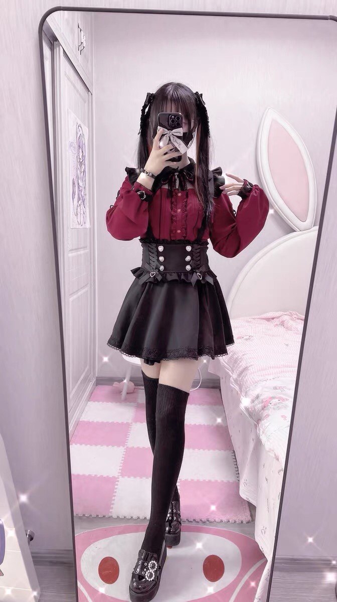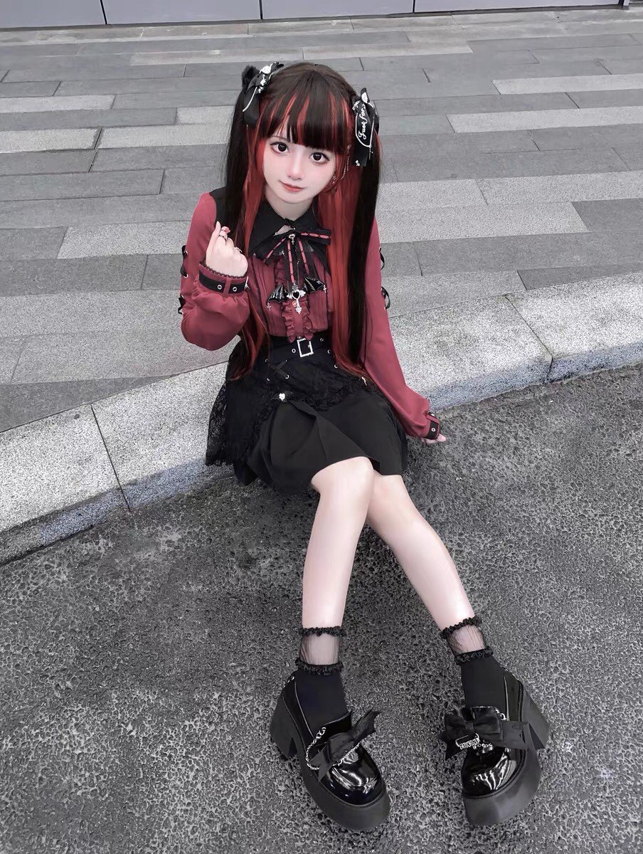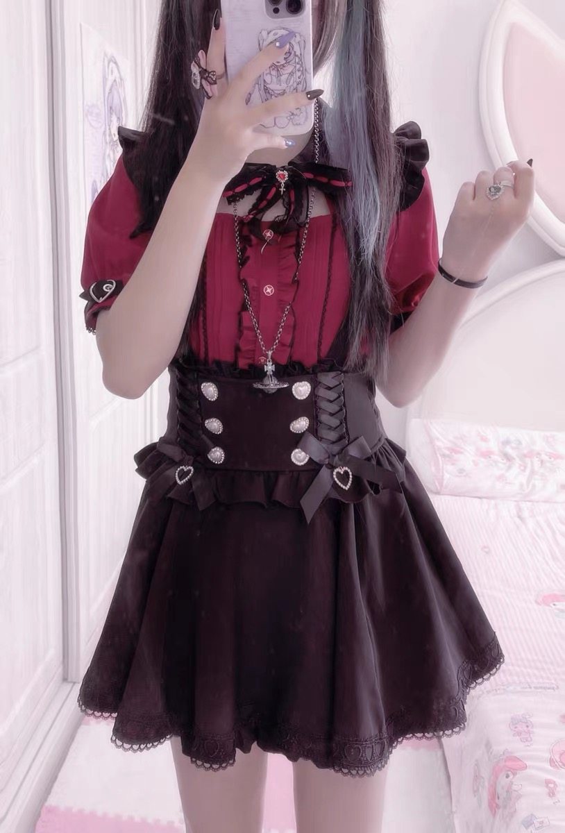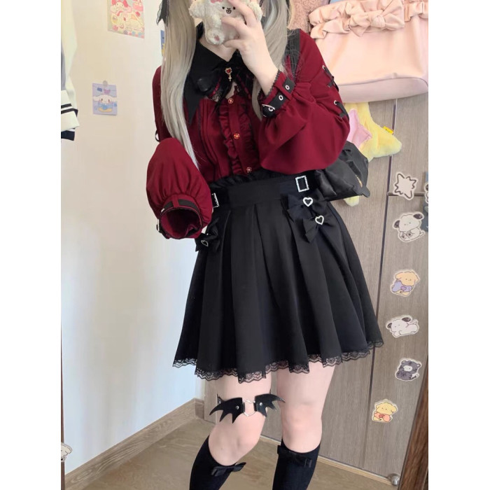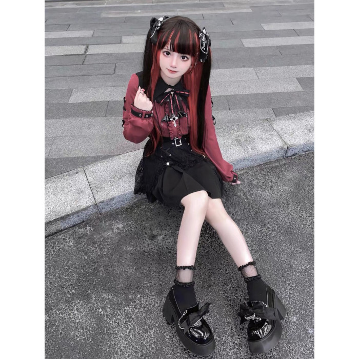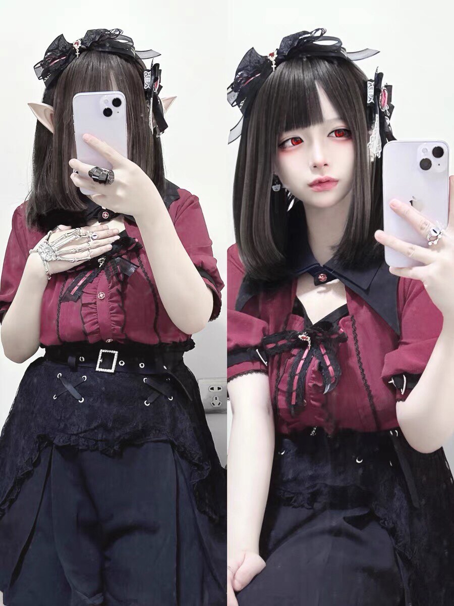 暗黑萬聖節吸血姬甜酷蝙蝠蕾絲領子黑紅色長短袖襯衫上衣