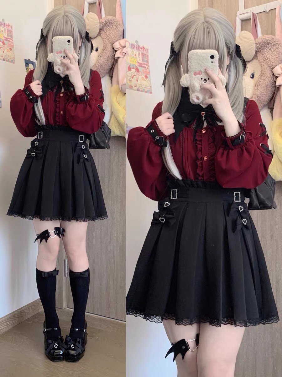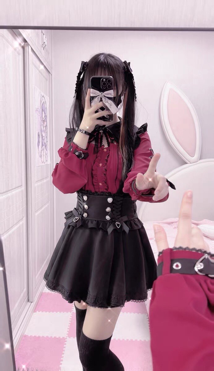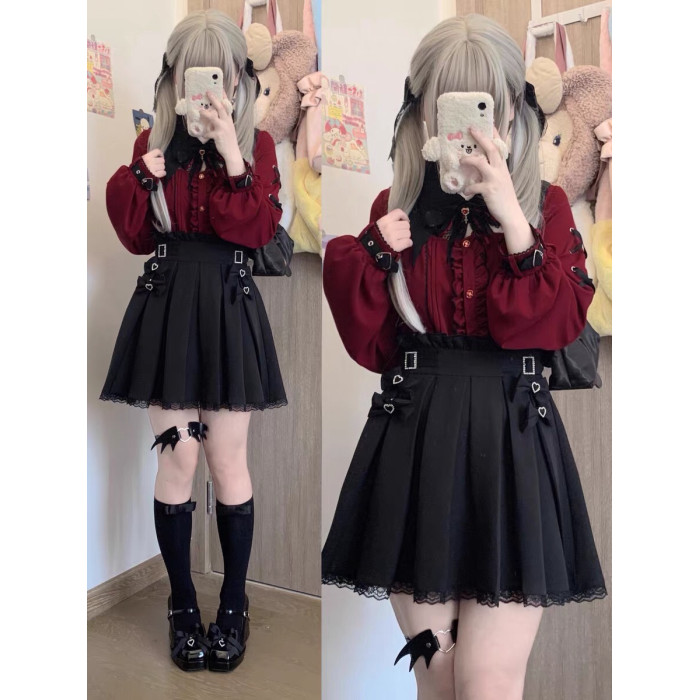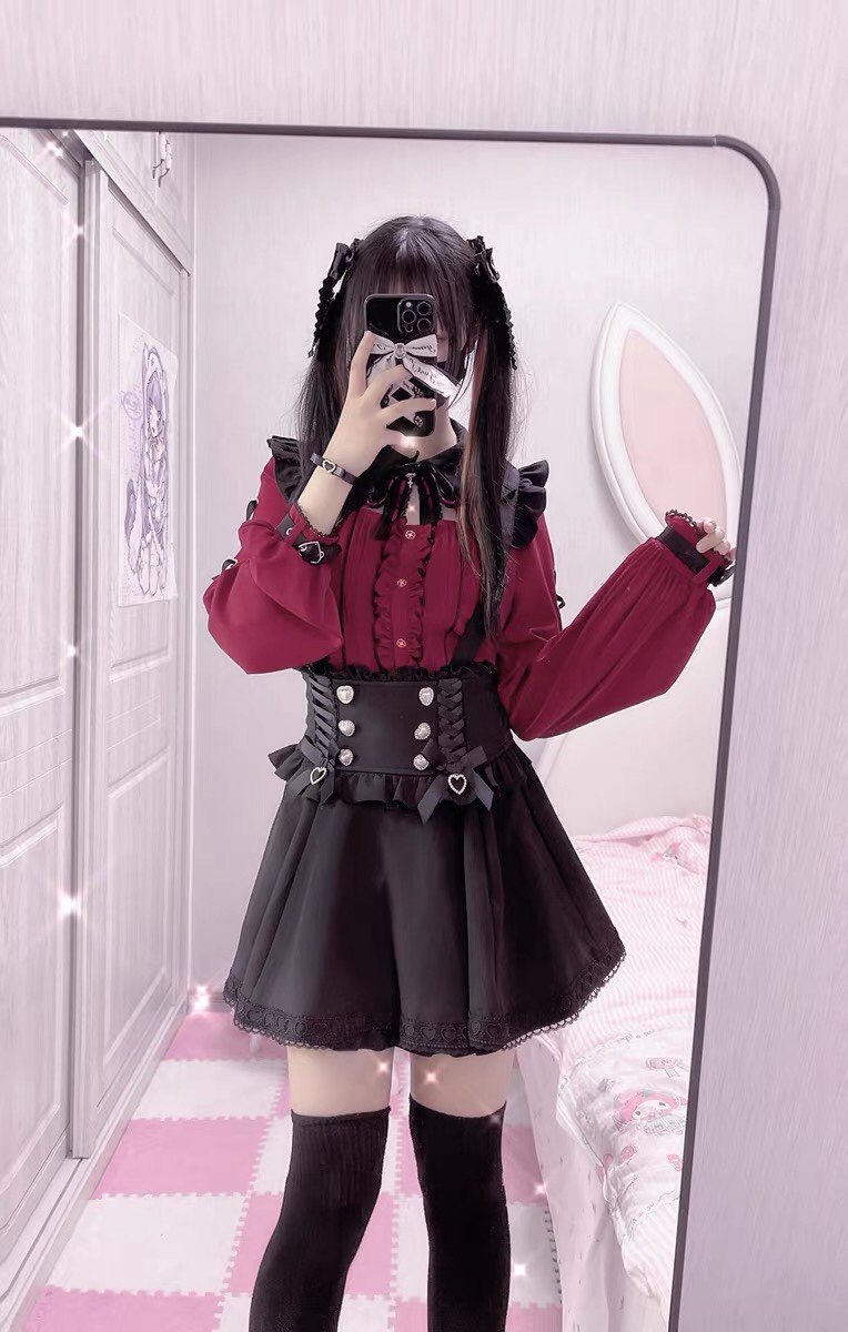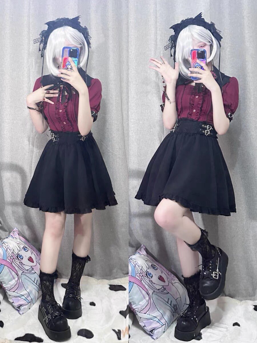 暗黑萬聖節吸血姬甜酷蝙蝠蕾絲領子黑紅色長短袖襯衫上衣