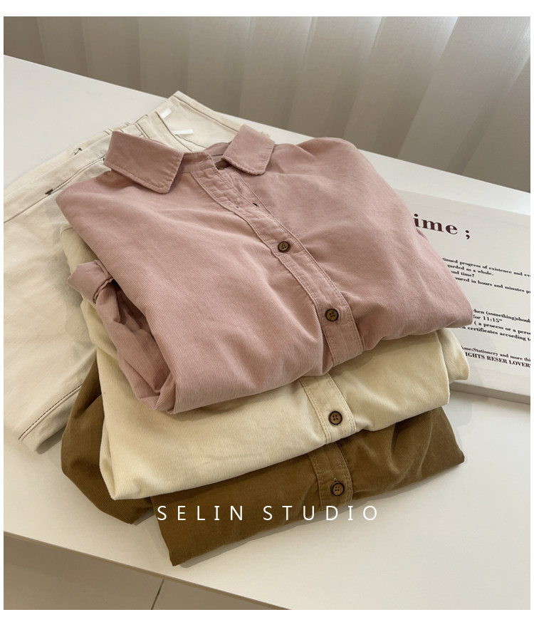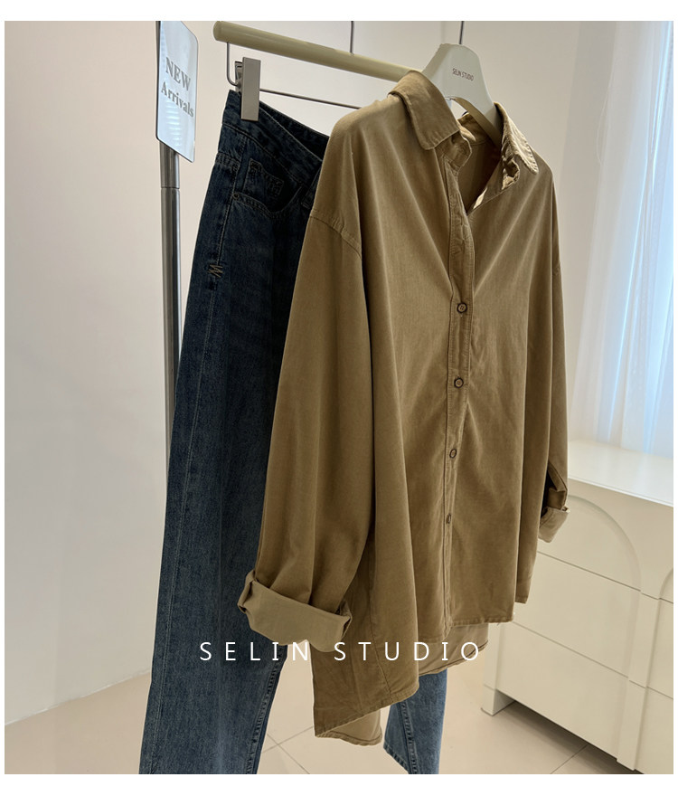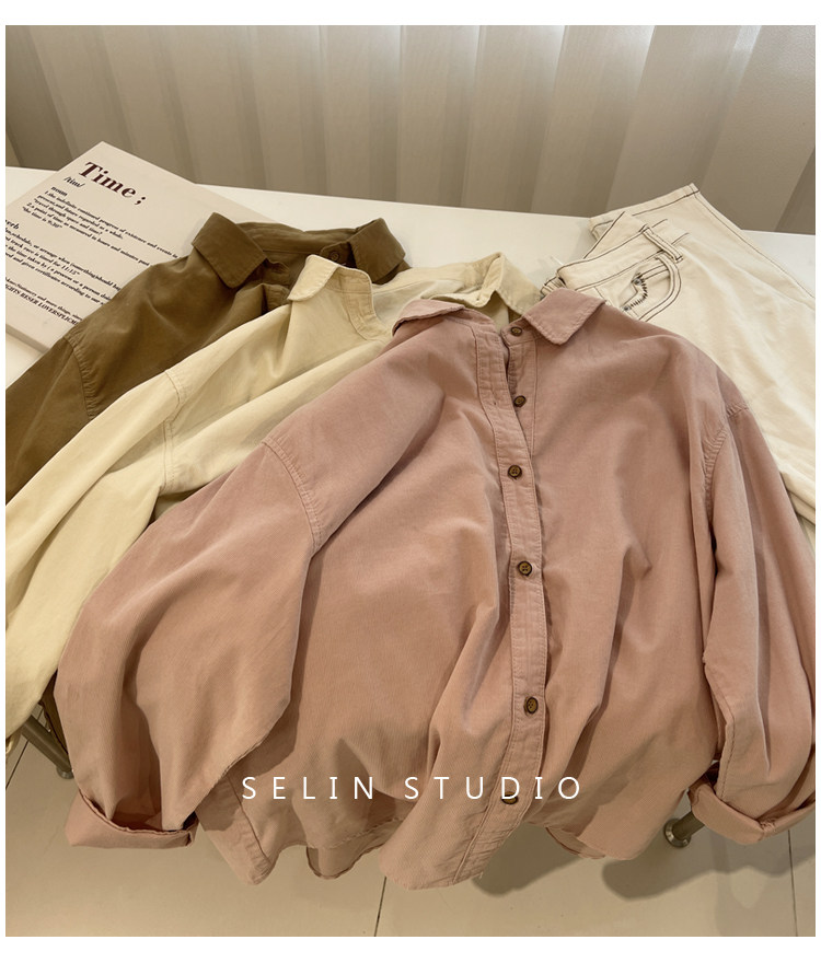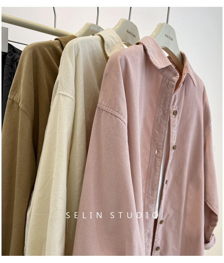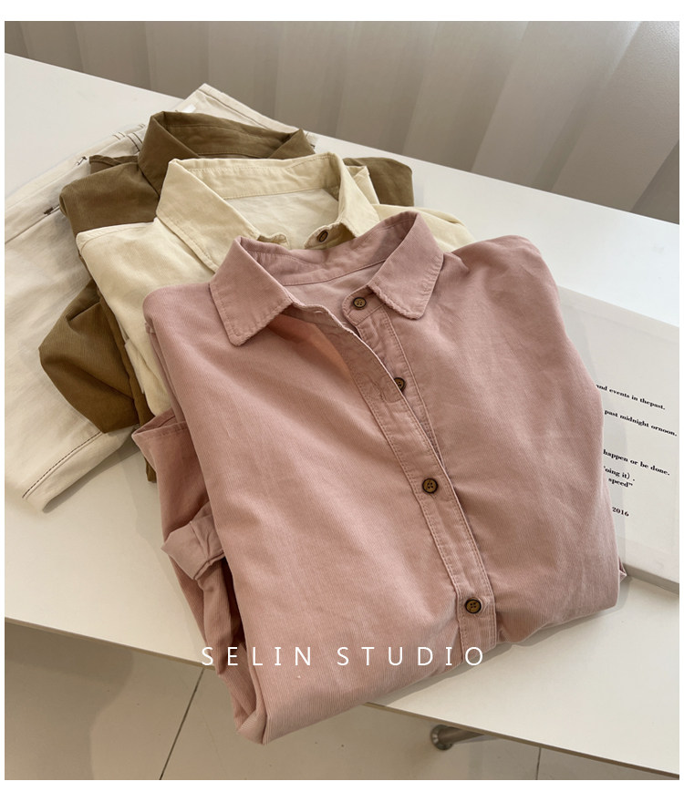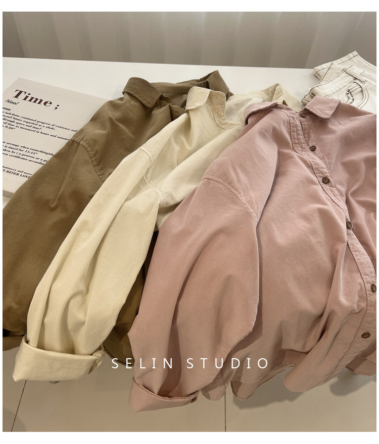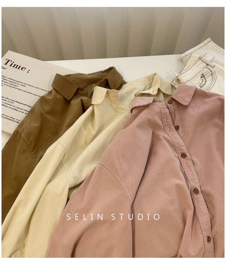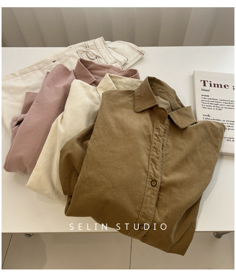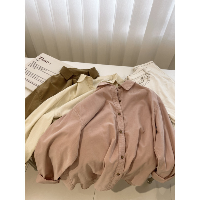 復古燈芯絨繙領長袖襯衫女!韓系曡穿寬鬆慵懶中性BF風襯衣薄外套