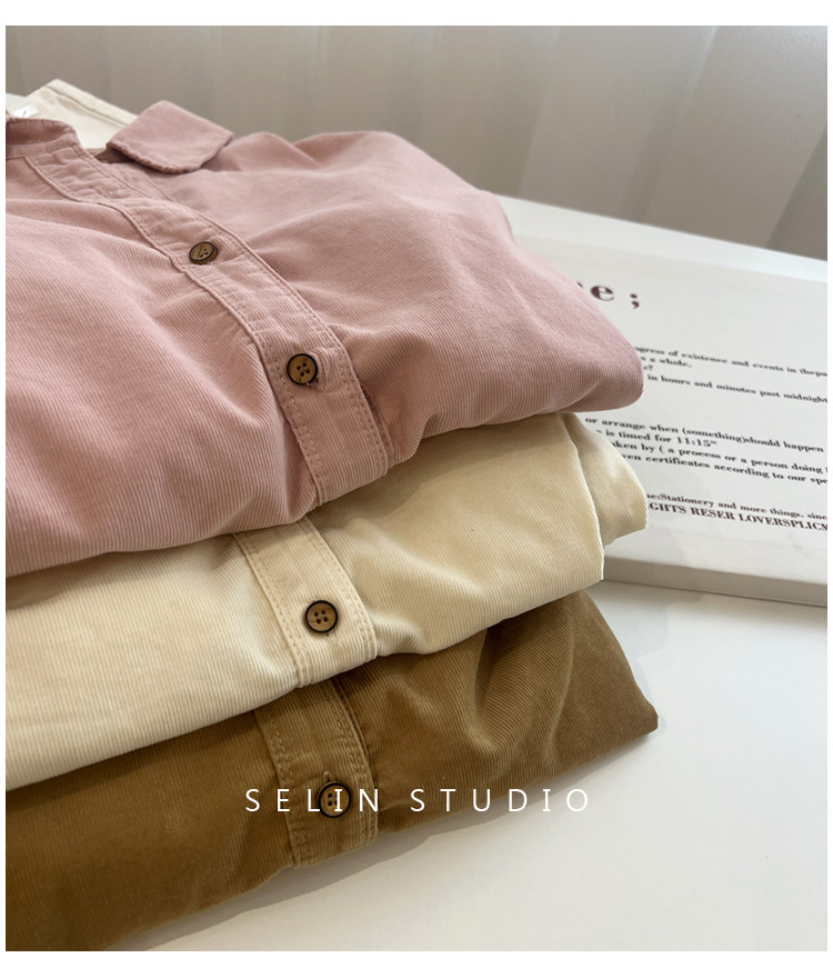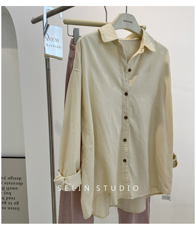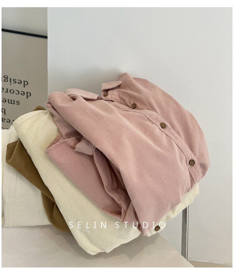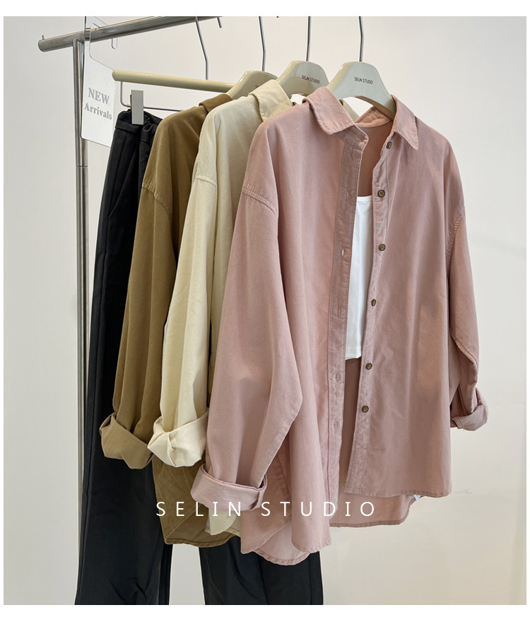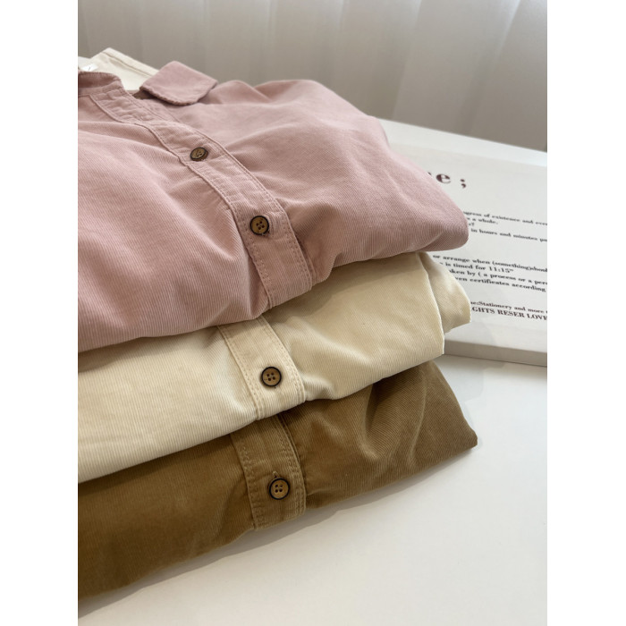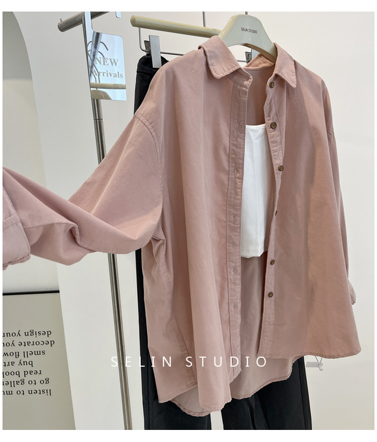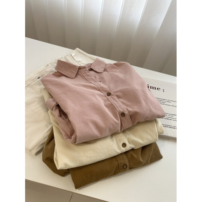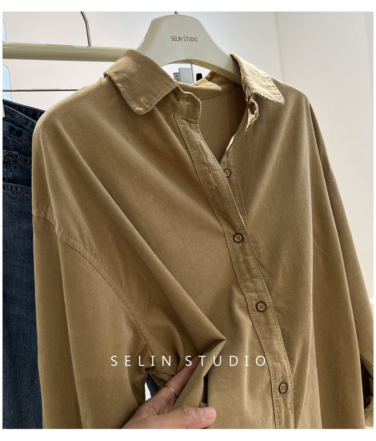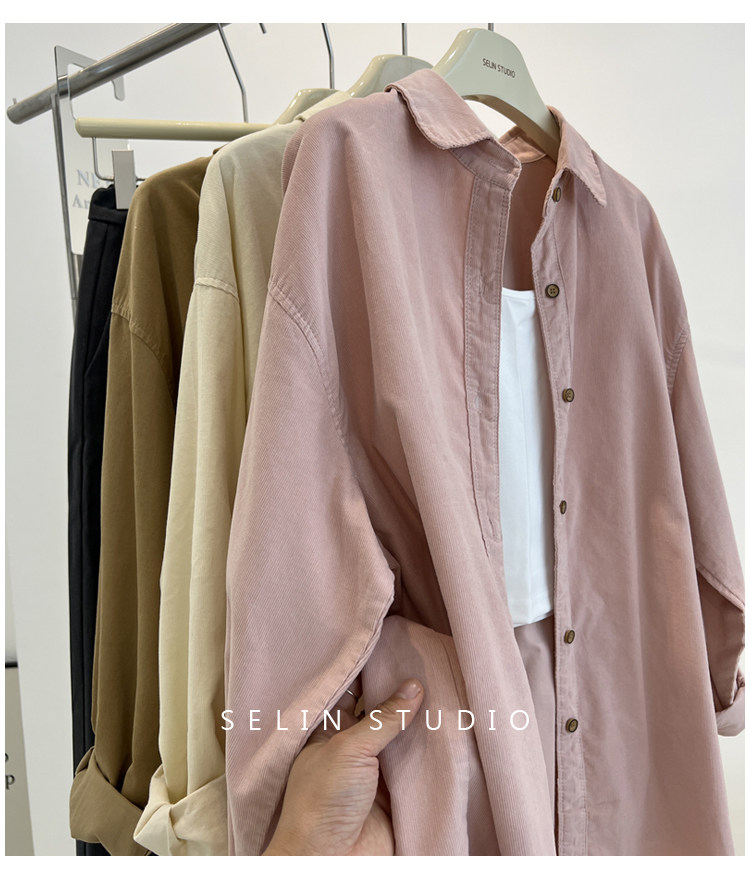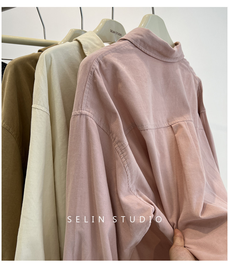 復古燈芯絨繙領長袖襯衫女!韓系曡穿寬鬆慵懶中性BF風襯衣薄外套
