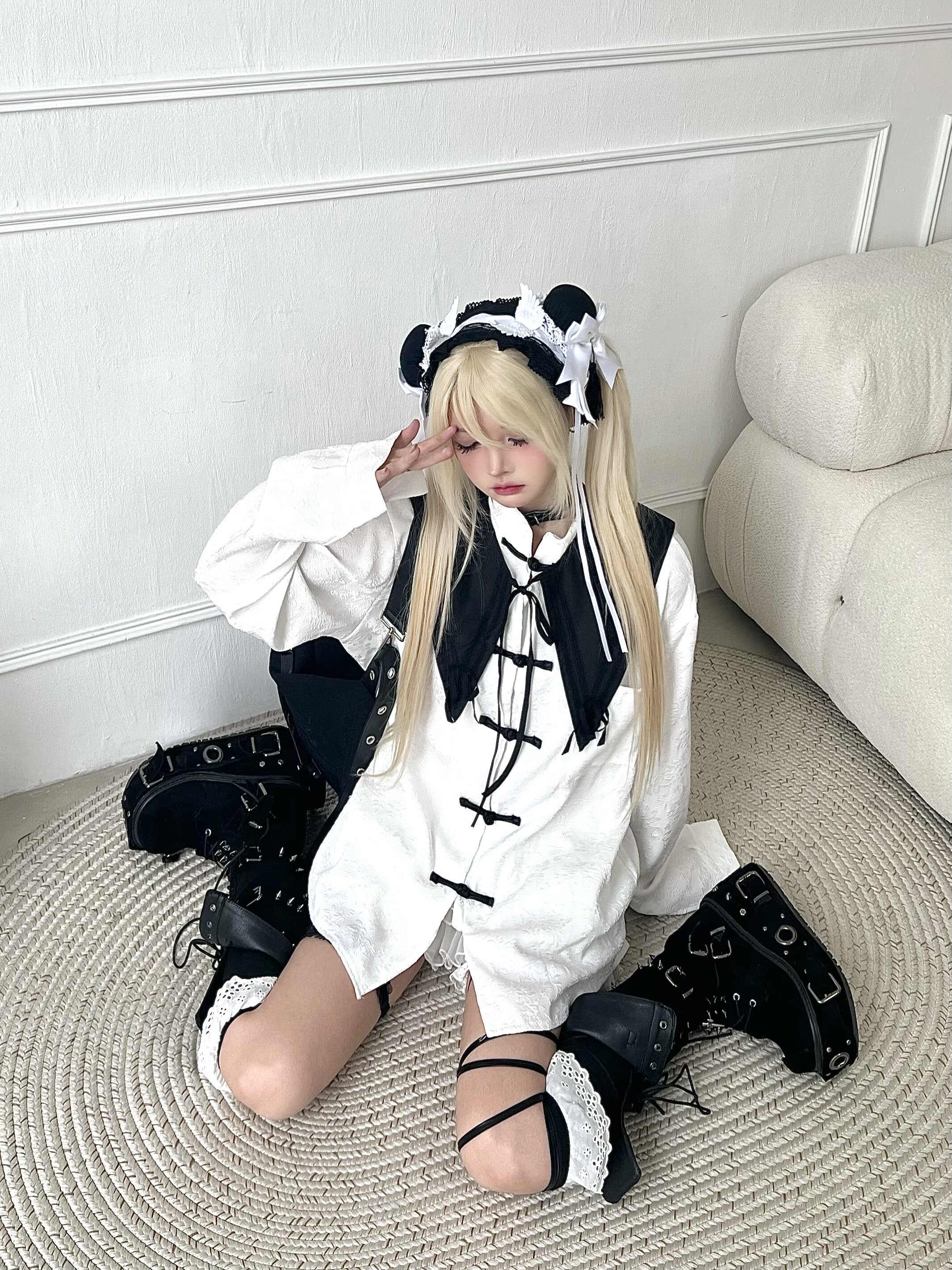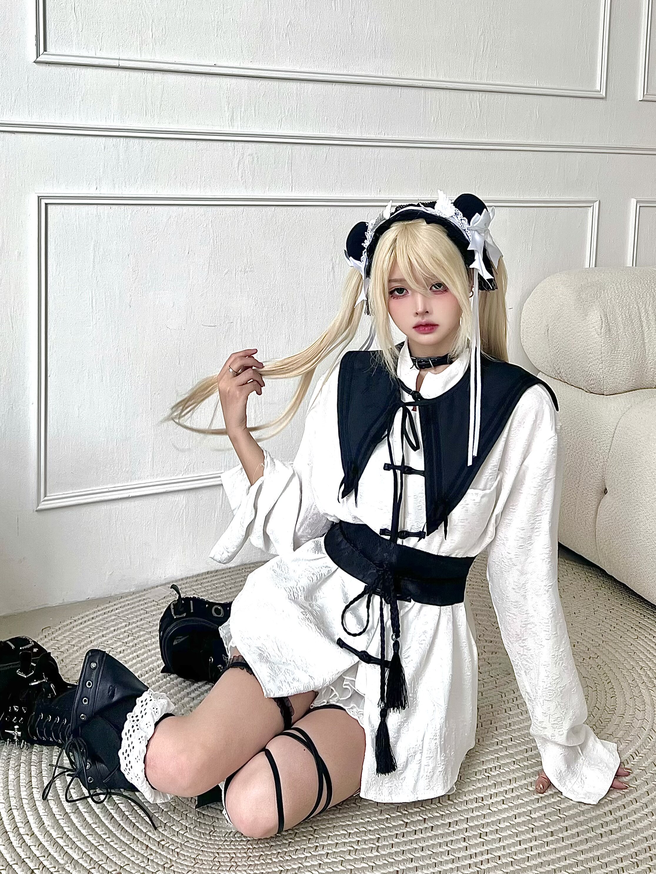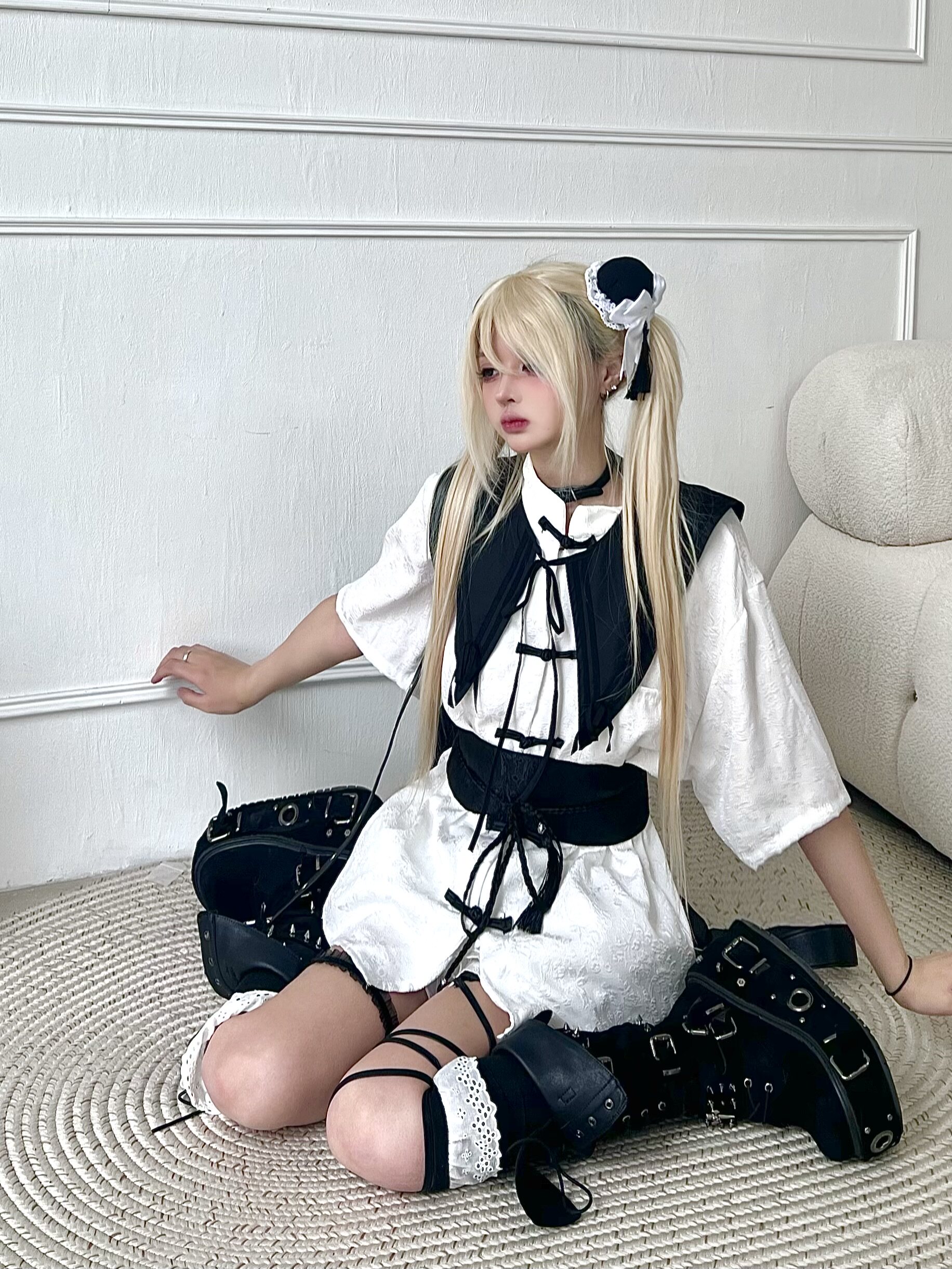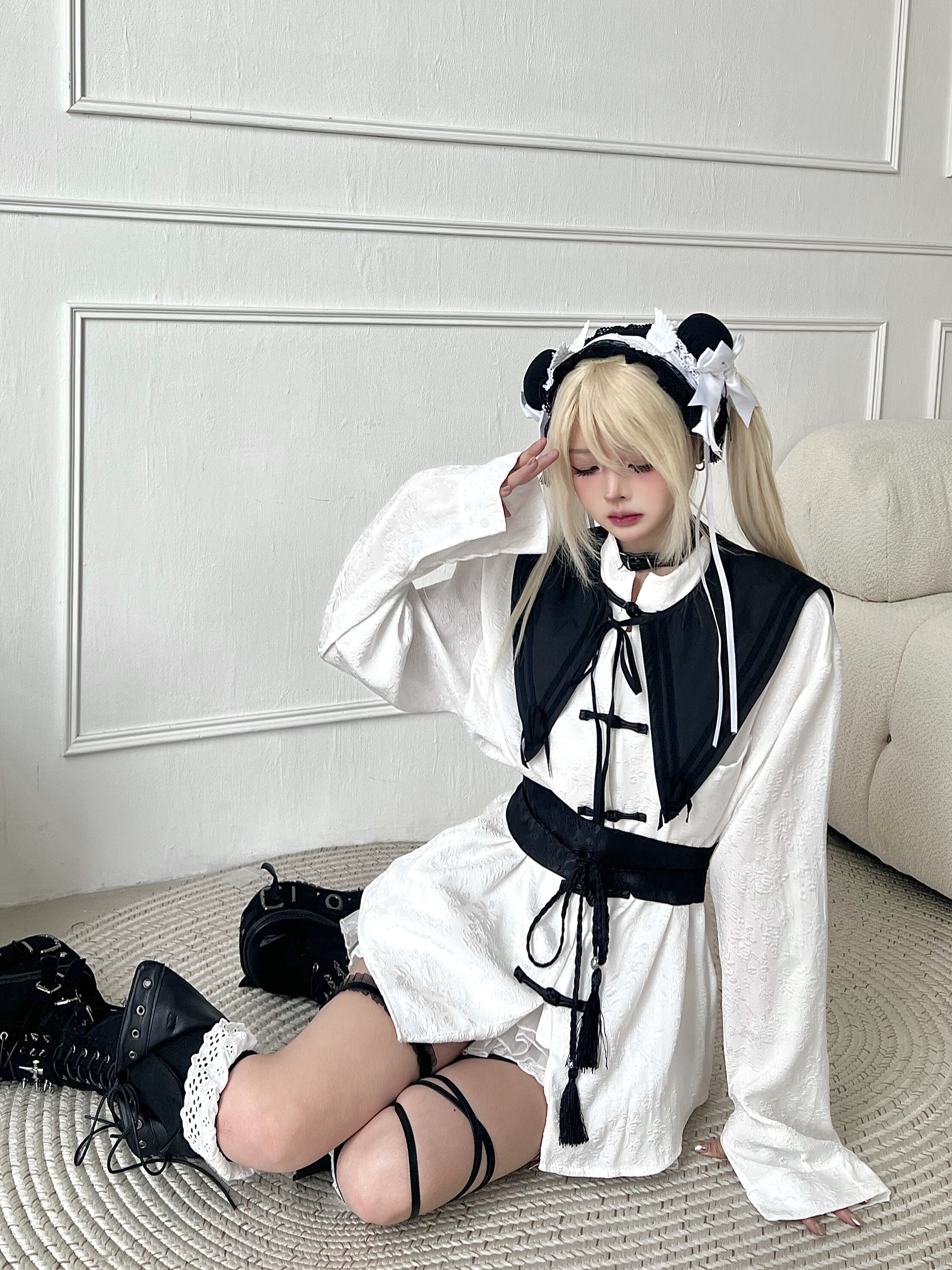 次時代/原創 黑白新中式暗紋少女長短袖寬鬆盤釦腰帶收腰襯衫