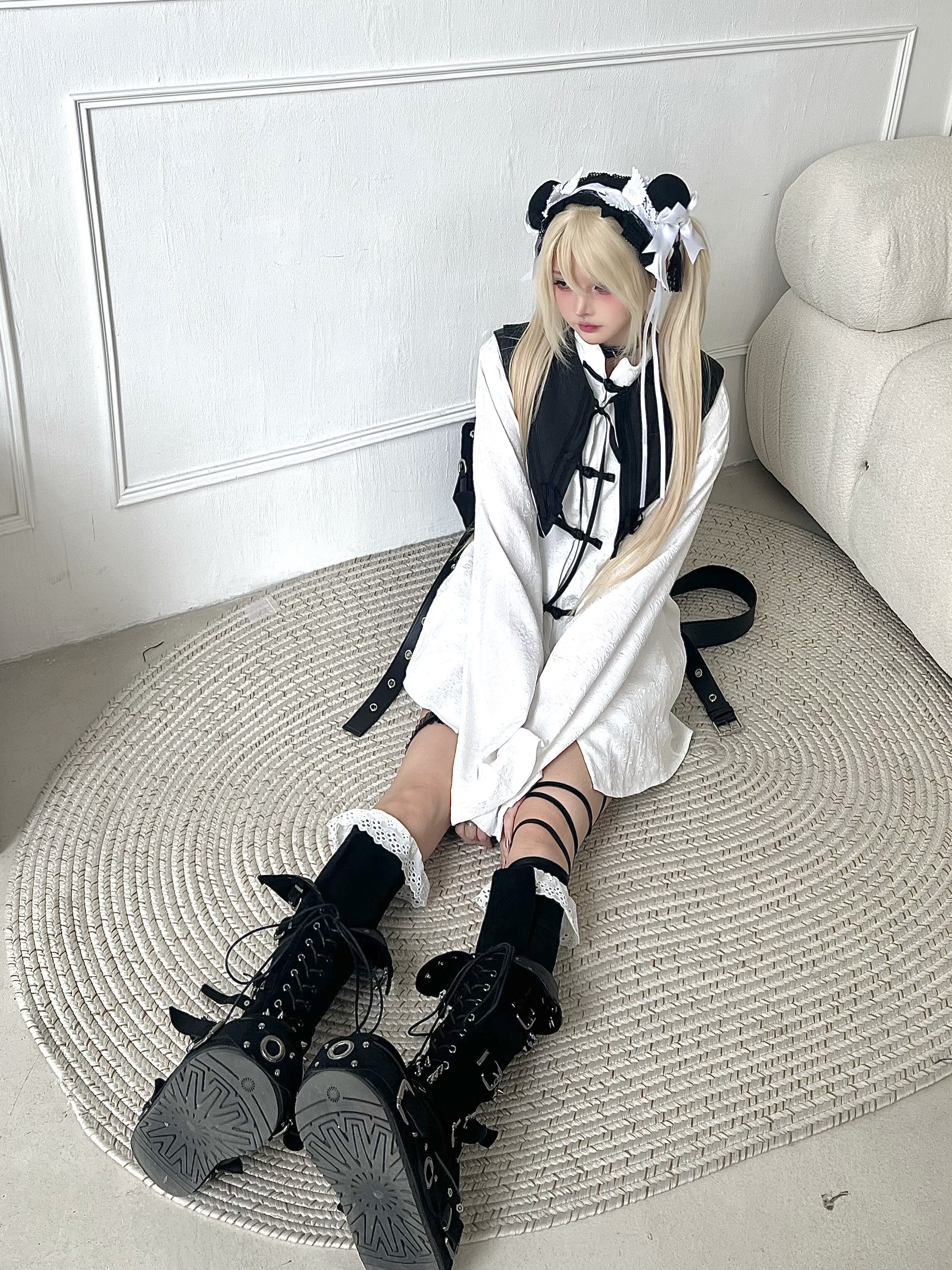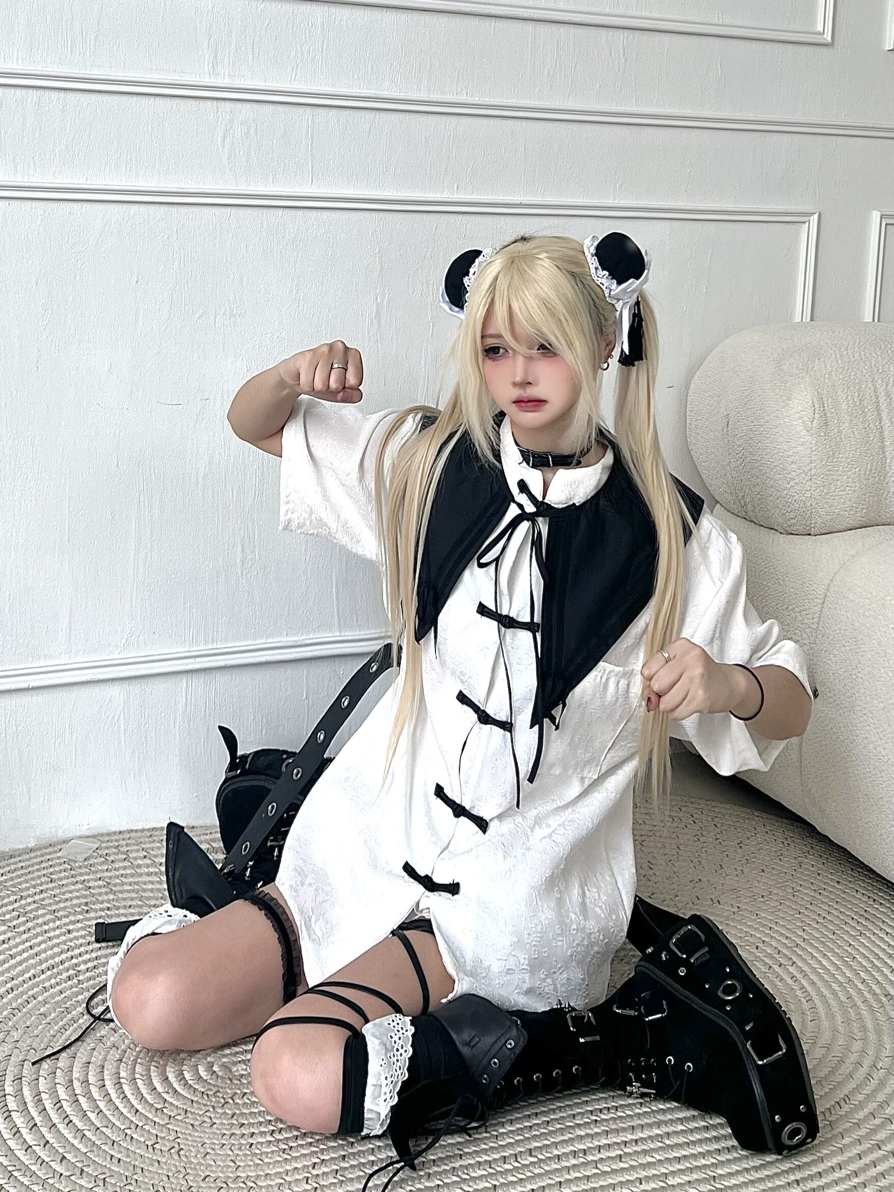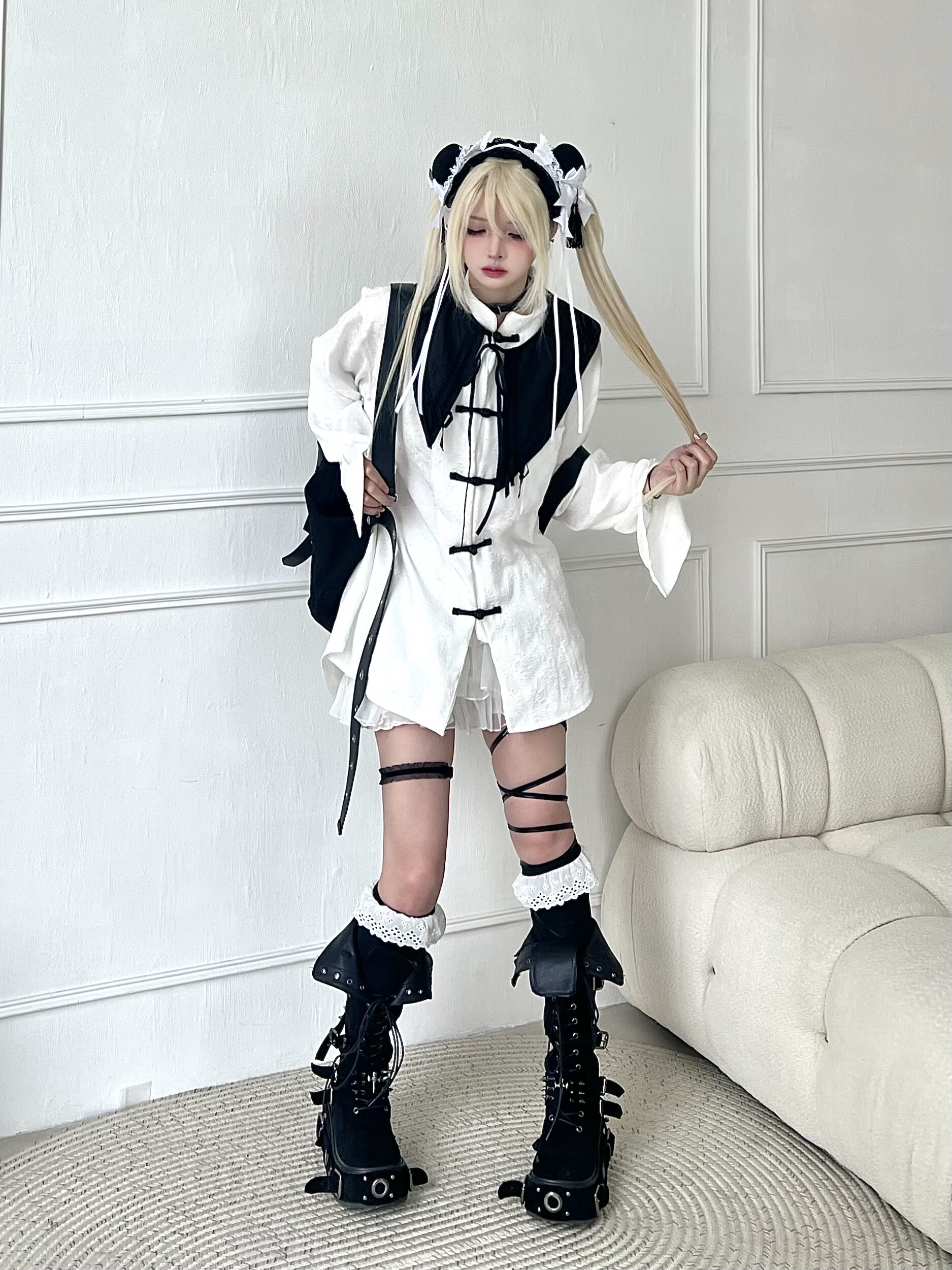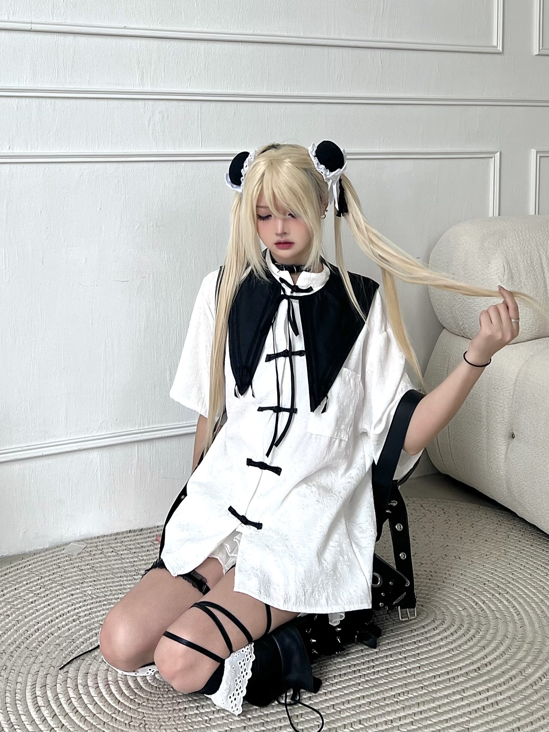 次時代/原創 黑白新中式暗紋少女長短袖寬鬆盤釦腰帶收腰襯衫