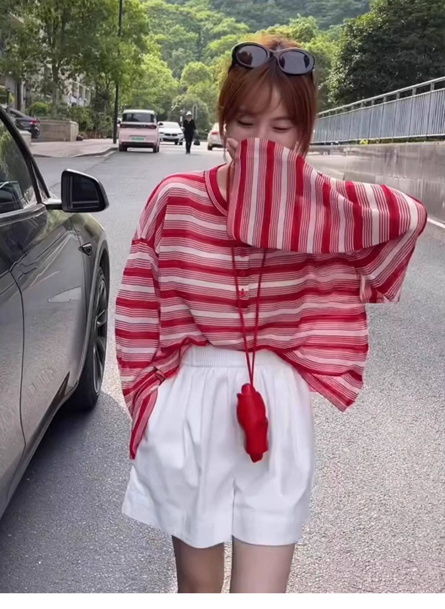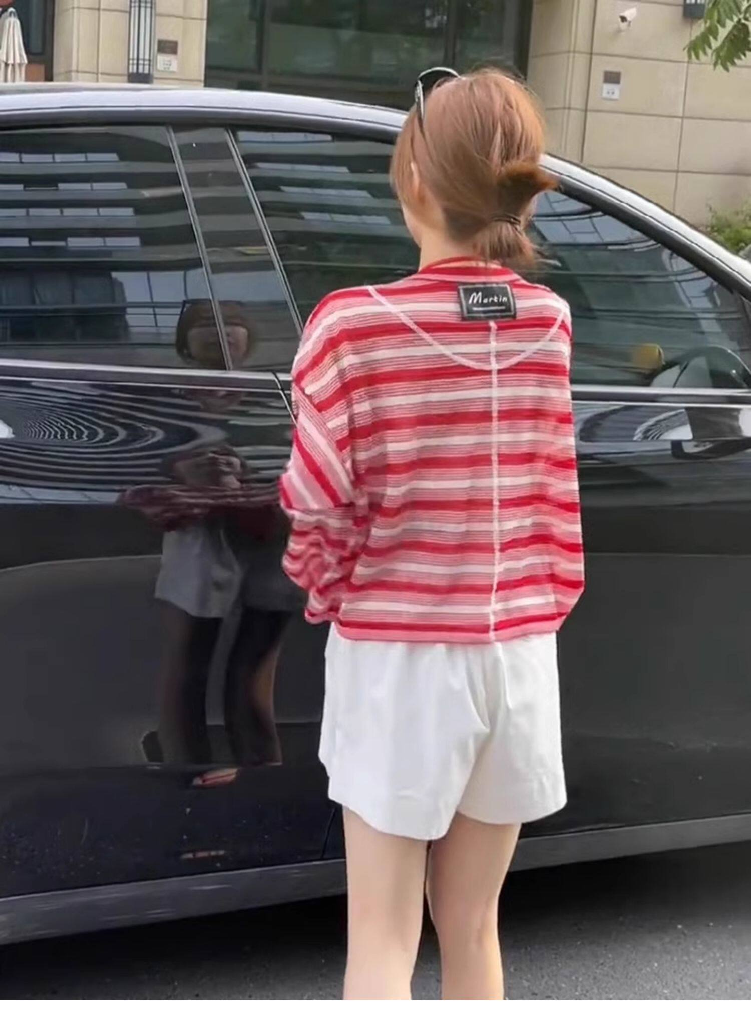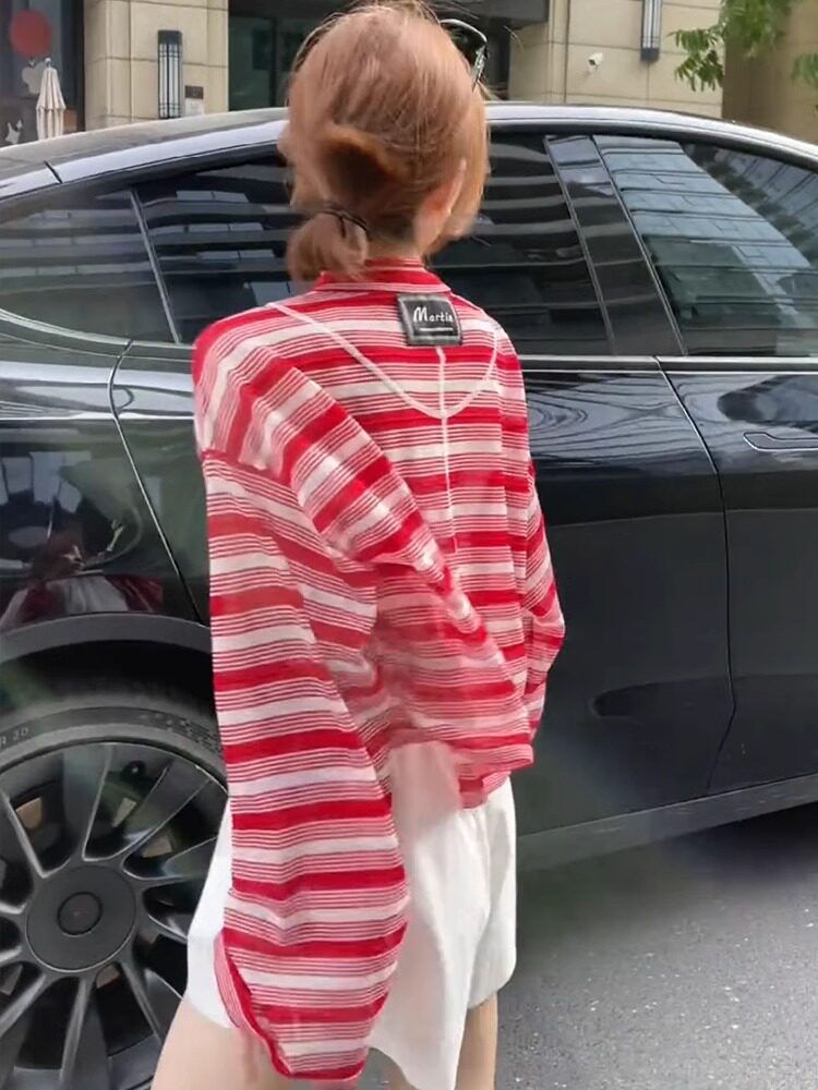 慵懶松弛感薄款條紋長袖t恤女早秋寬鬆短款外搭防曬冰絲罩衫上衣