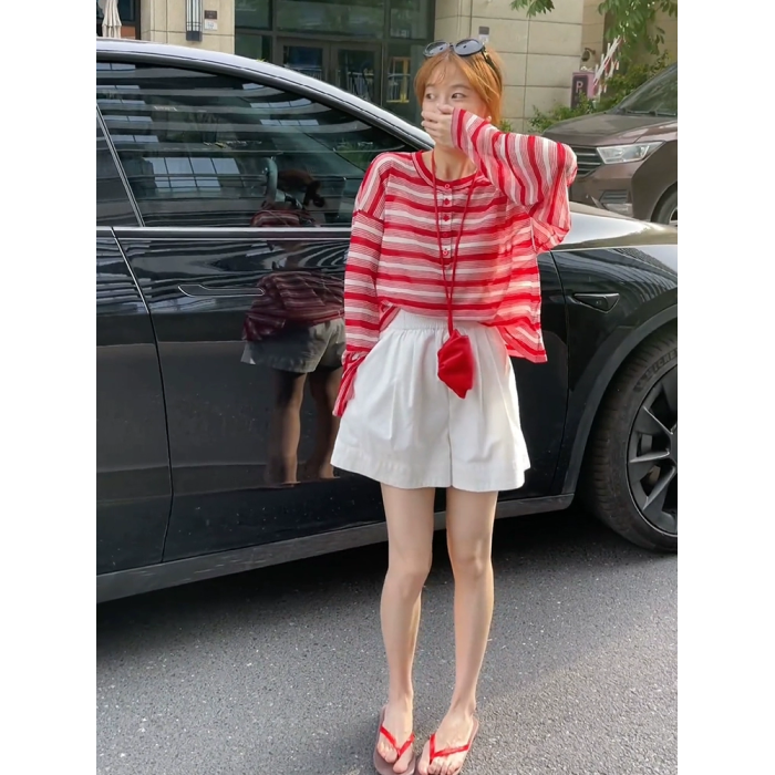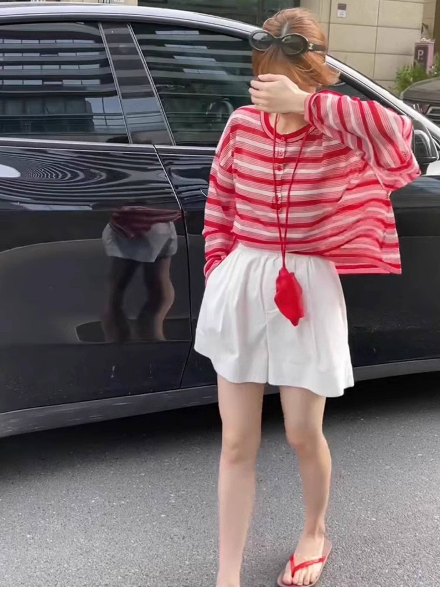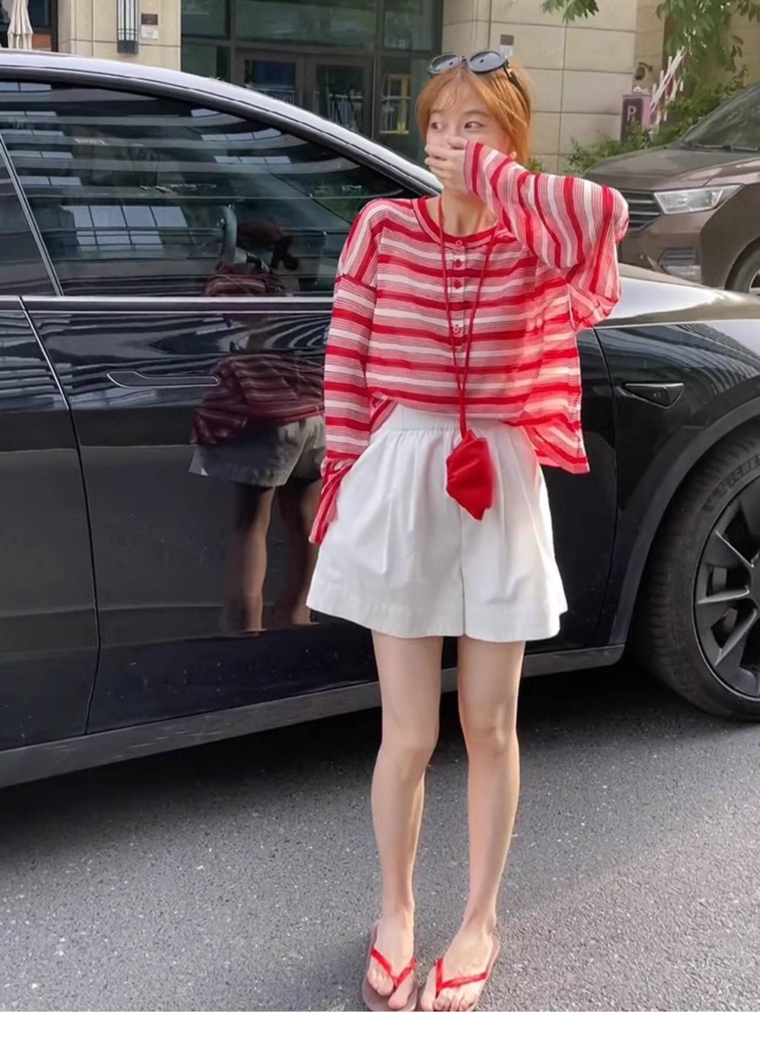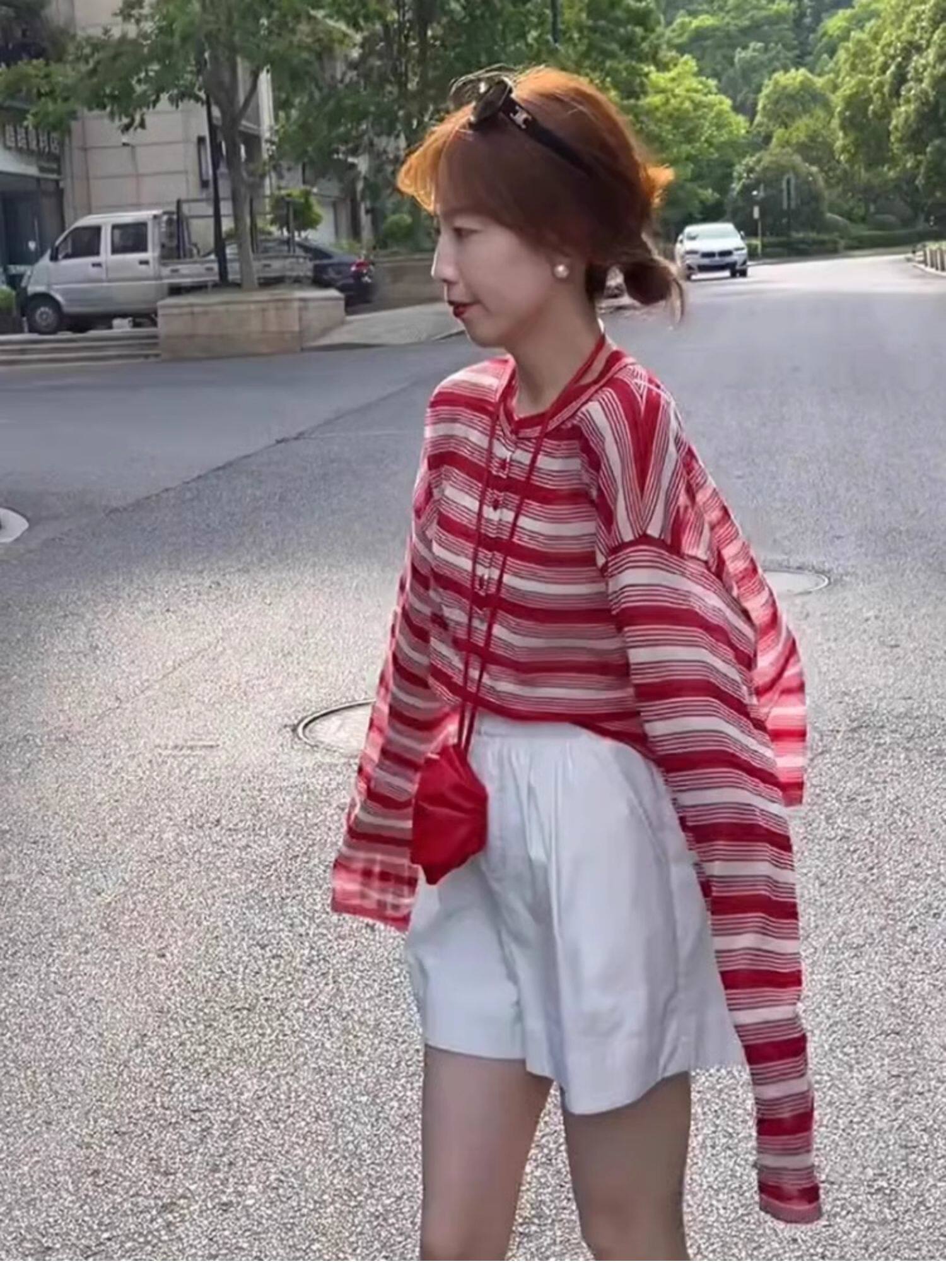 慵懶松弛感薄款條紋長袖t恤女早秋寬鬆短款外搭防曬冰絲罩衫上衣