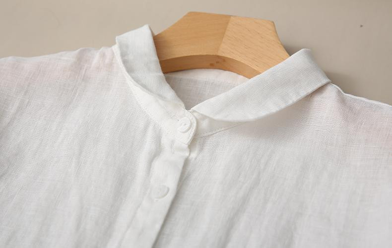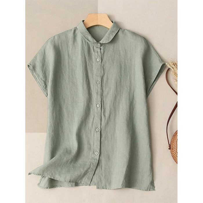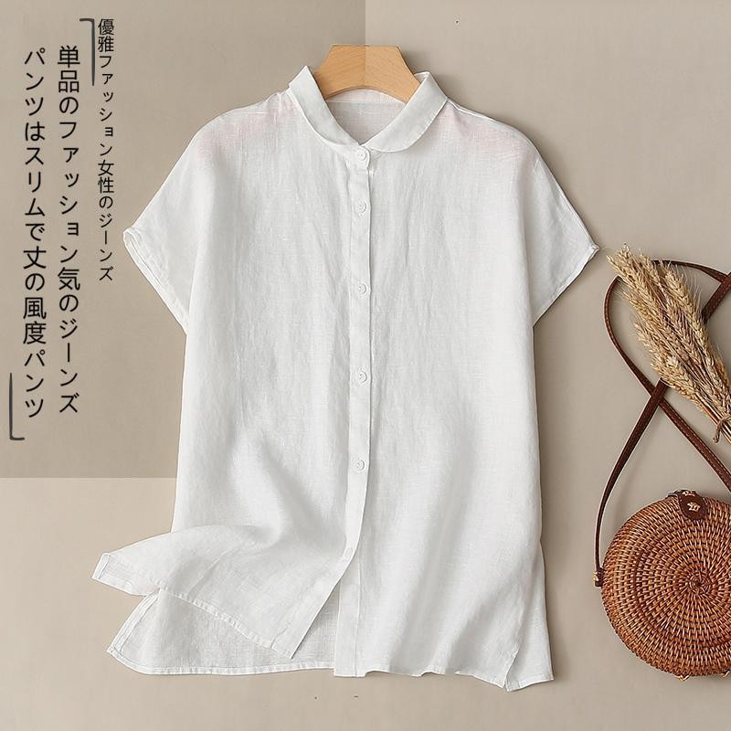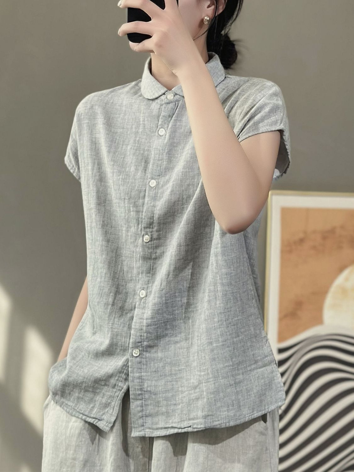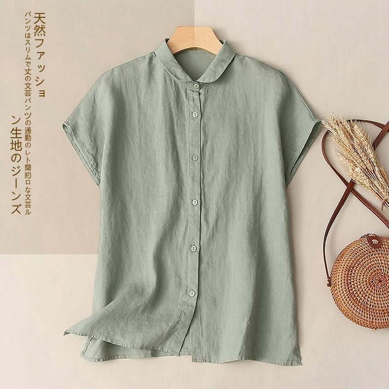 日韓出口剪標純亞麻短袖上衣立領寬鬆百搭設計感文藝棉麻襯衫