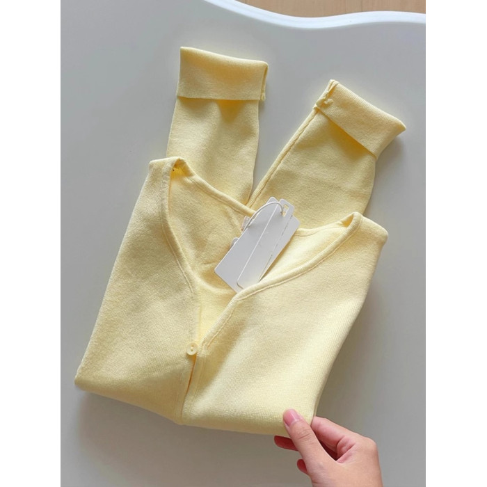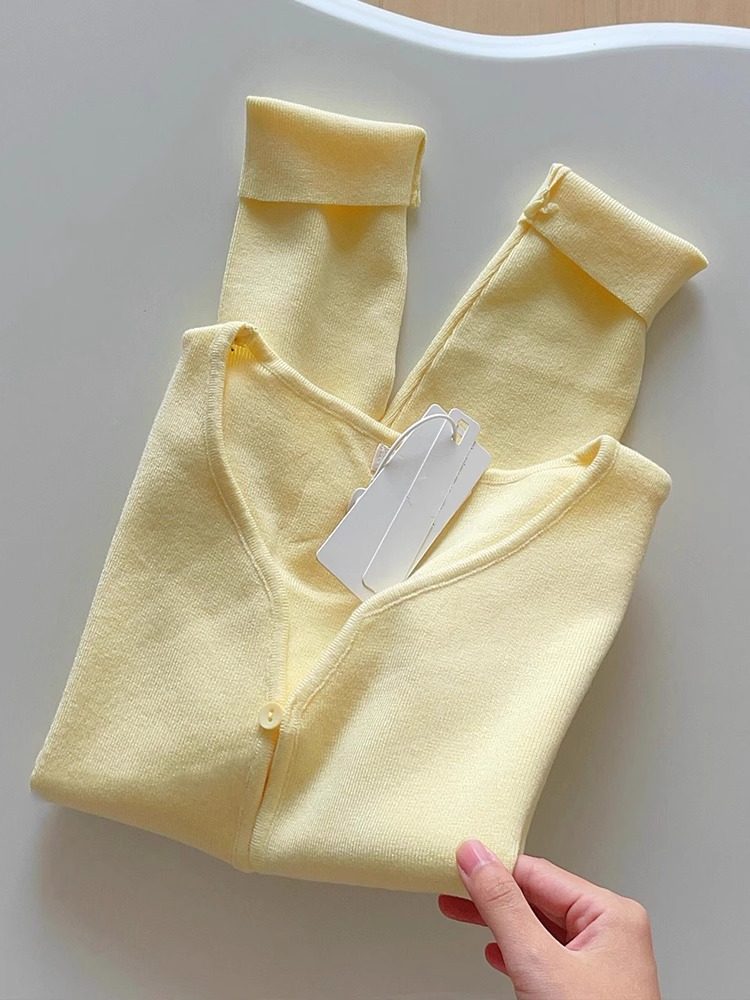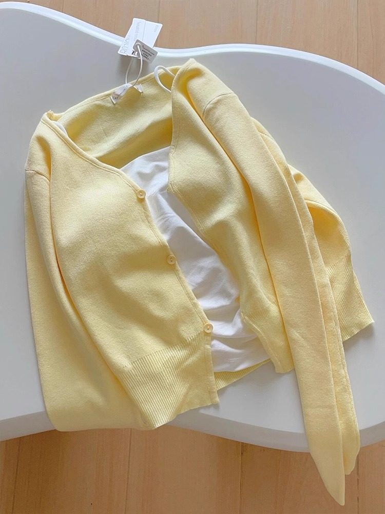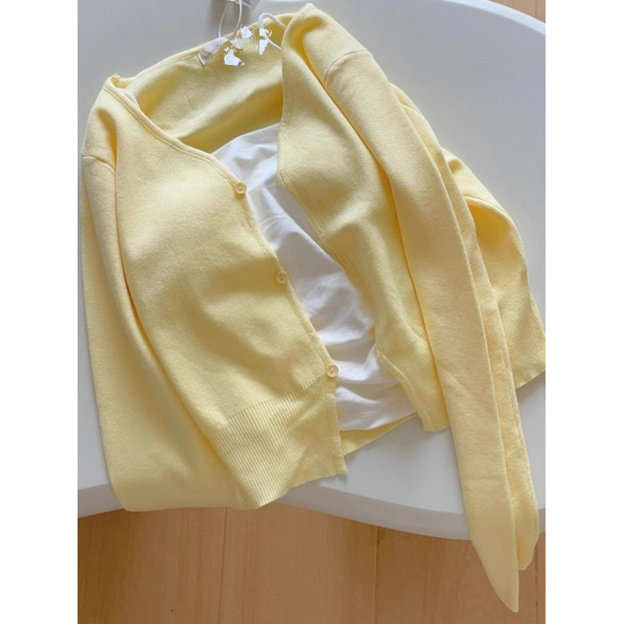 奶黃色v領針織開衫女早秋薄款外穿軟糯修身百搭長袖毛衣外套上衣