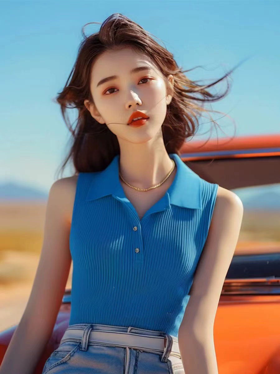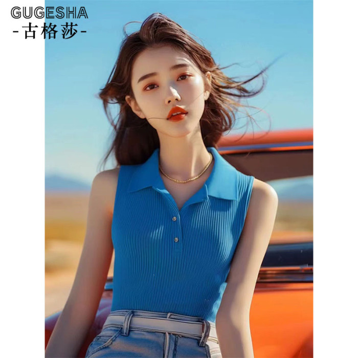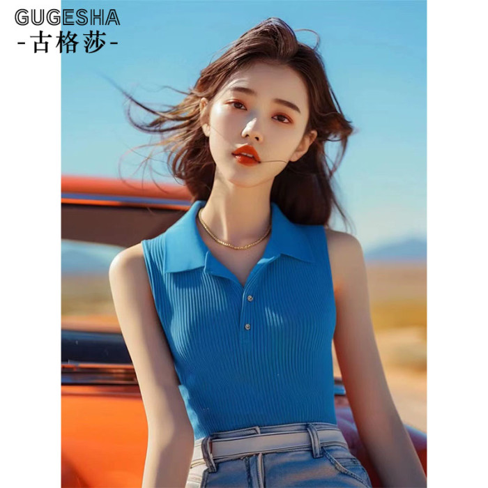 藍色無袖針織背心女士夏季新款法式polo領甜辣小上衣修身顯瘦小衫