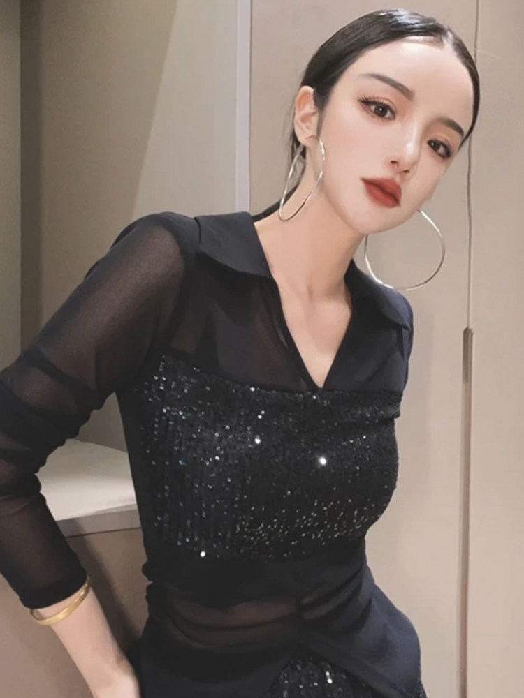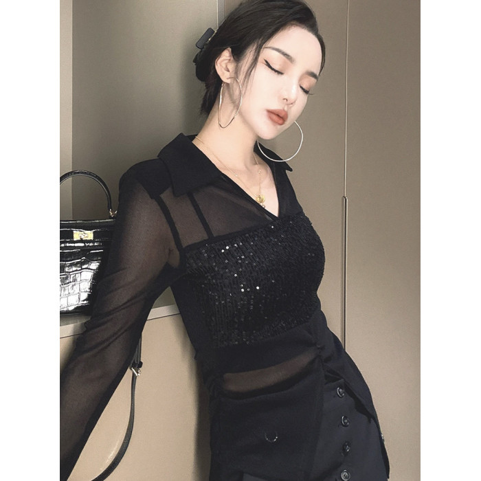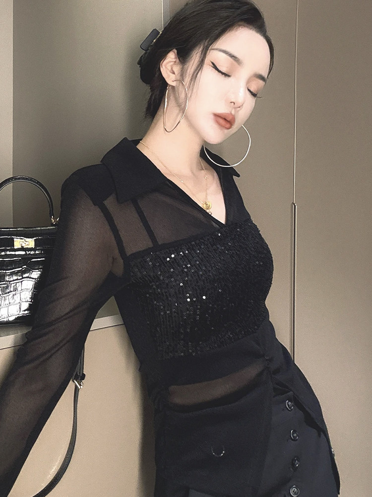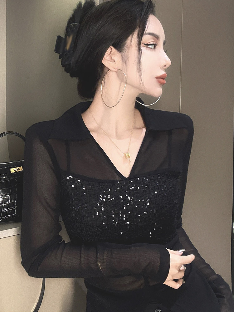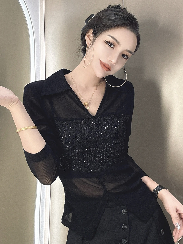 歐貨POLO領微透網紗拼接長袖T恤女2025夏季新款修身顯瘦百搭上衣