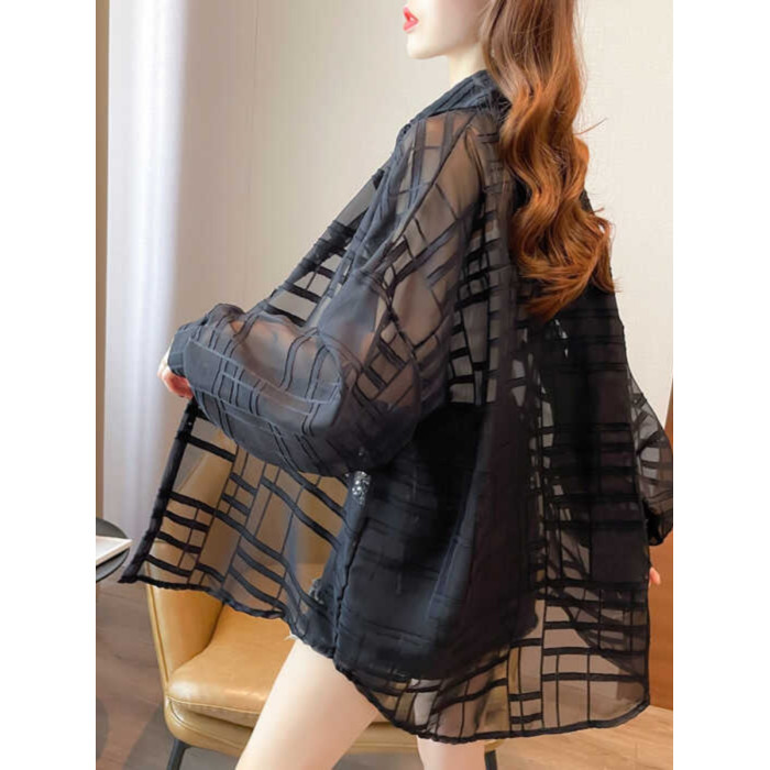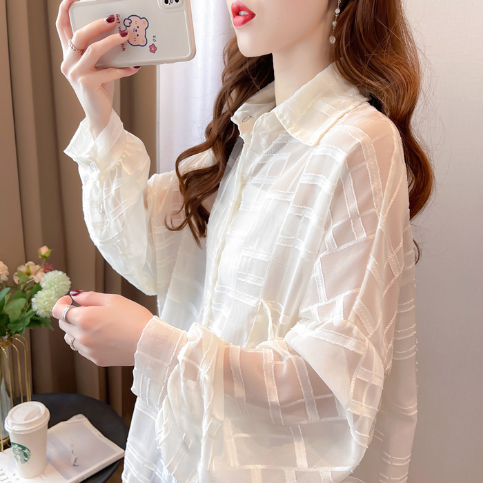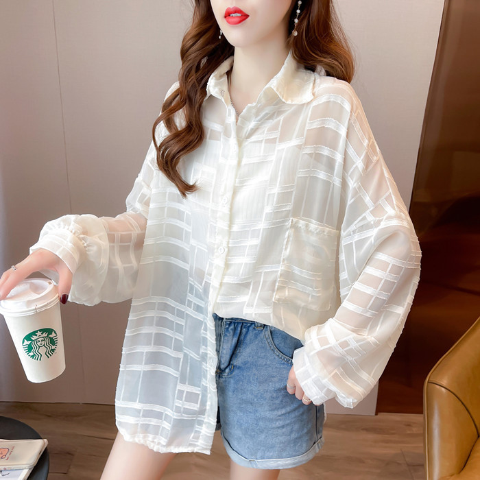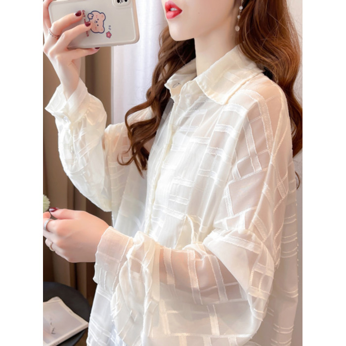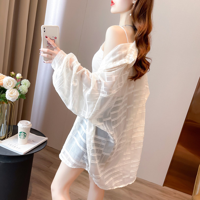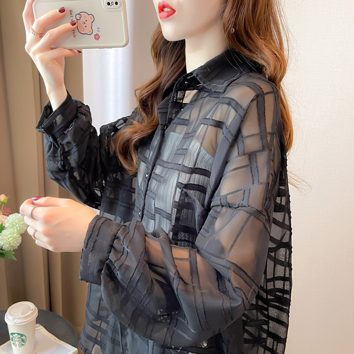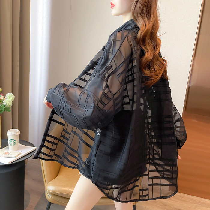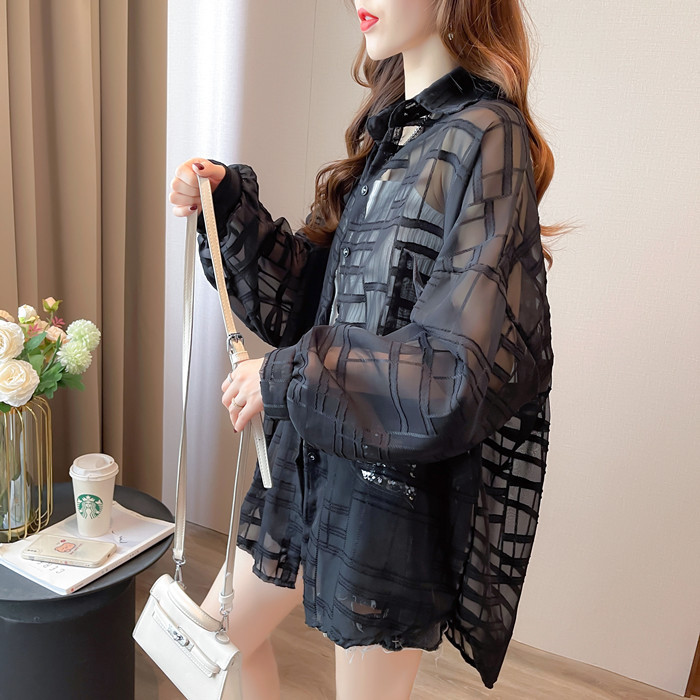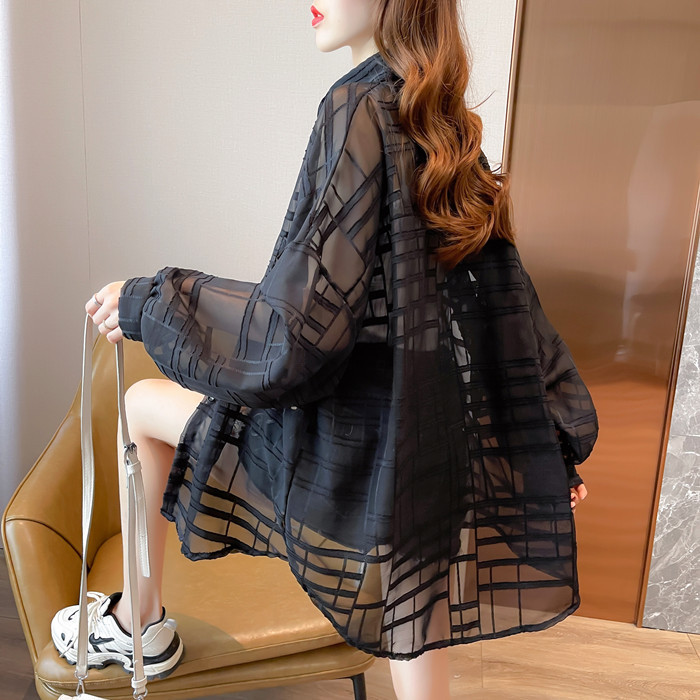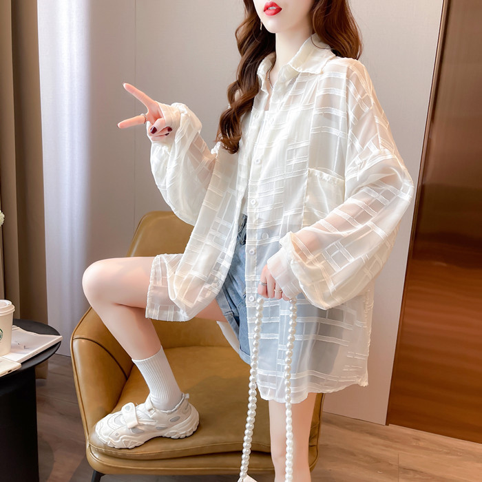 性感防曬襯衫女夏季薄款歐貨時尚洋氣微透開衫寬鬆中長款冰絲襯衣