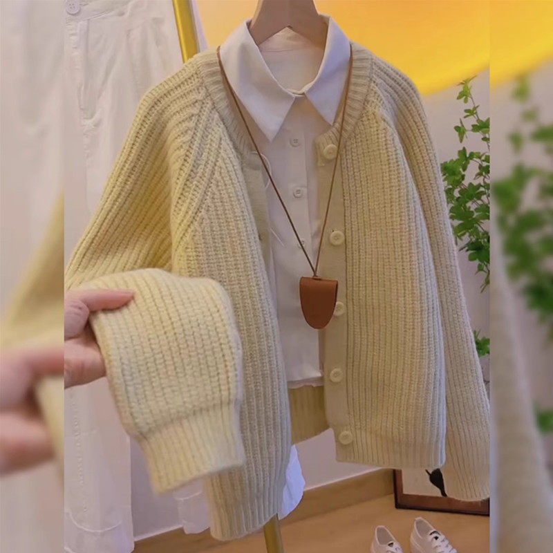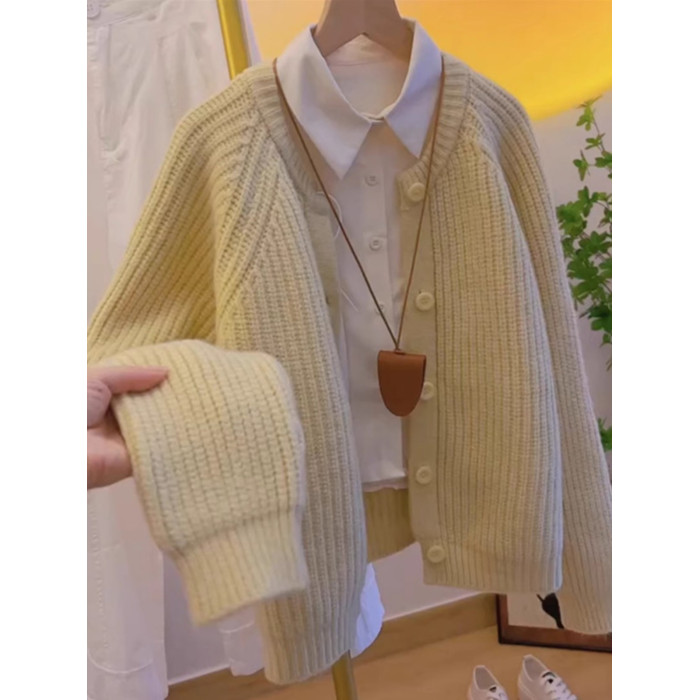 原單女裝專櫃撤廻奶黃色圓領針織開衫秋冬季慵懶厚實毛衣外套