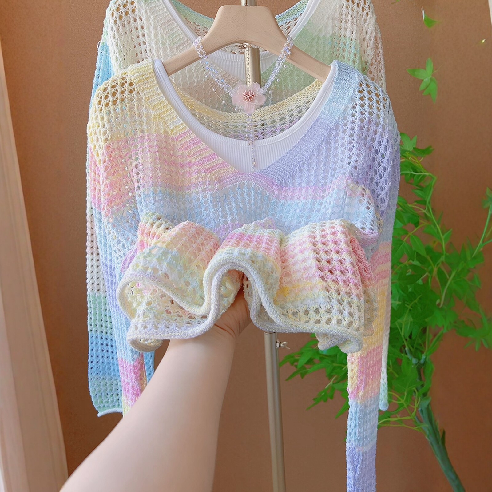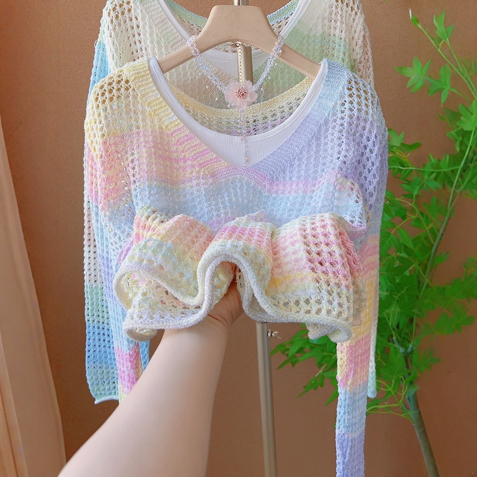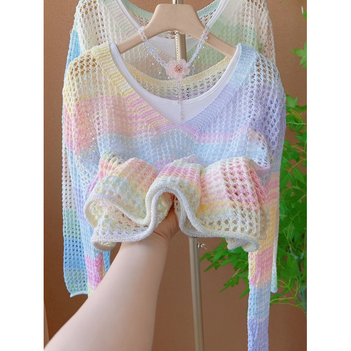 十三行時尚彩虹條紋鏤空防曬針織罩衫女夏季高級感白色背心兩件套