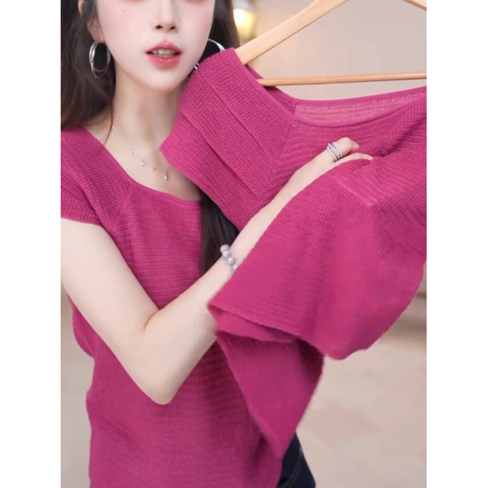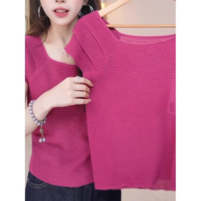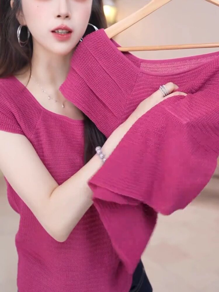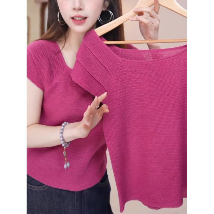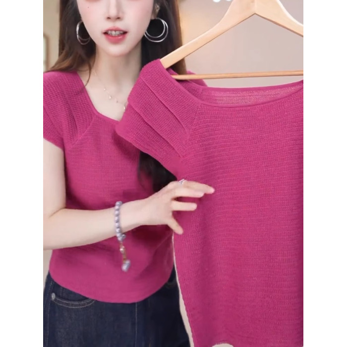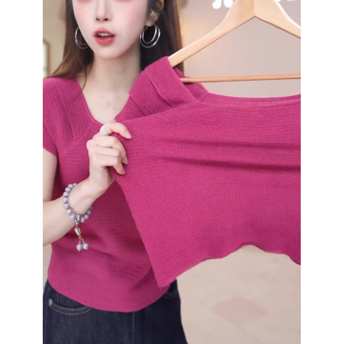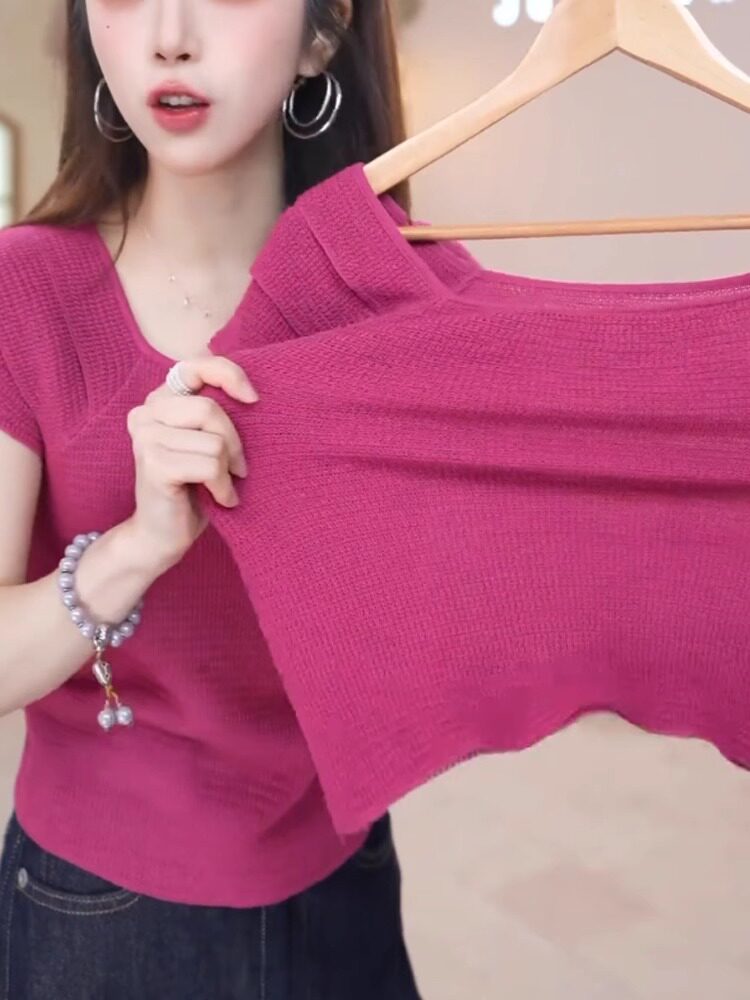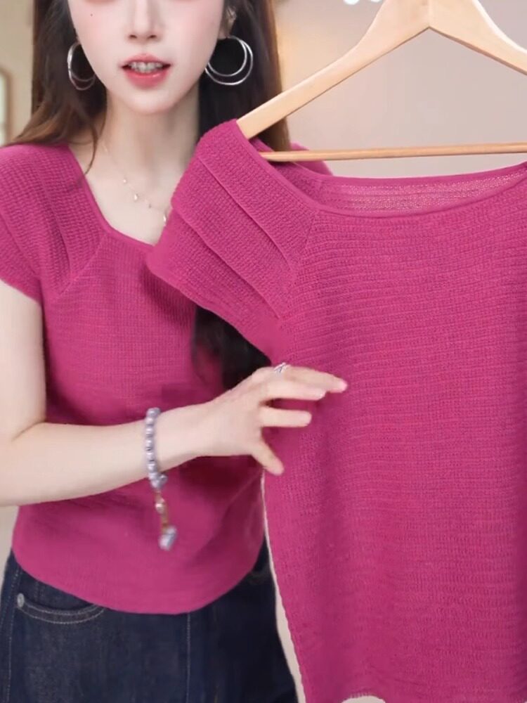 玫紅色顯白減齡冰絲針織衫溫柔甜美百搭短袖上衣2025夏季柔軟親膚