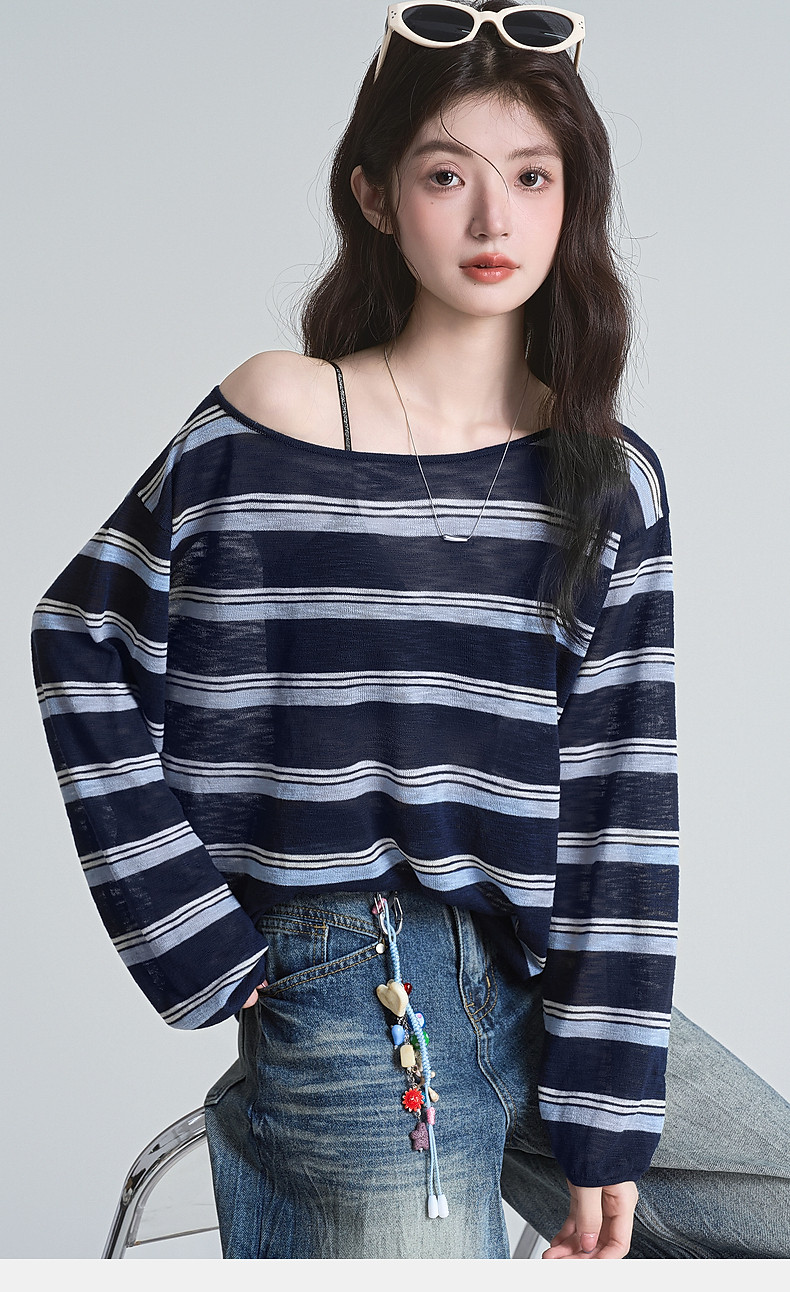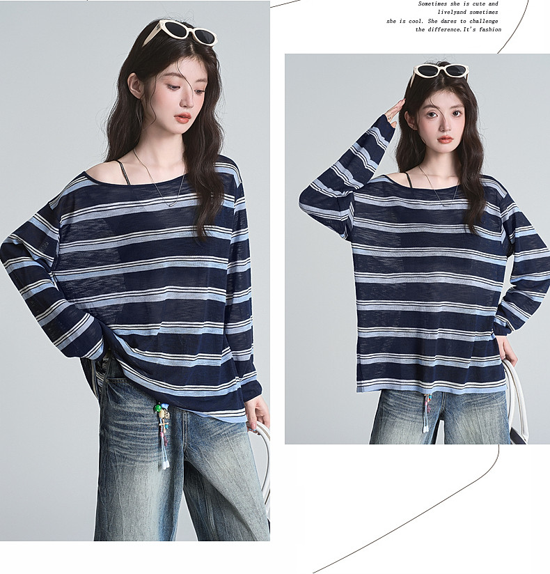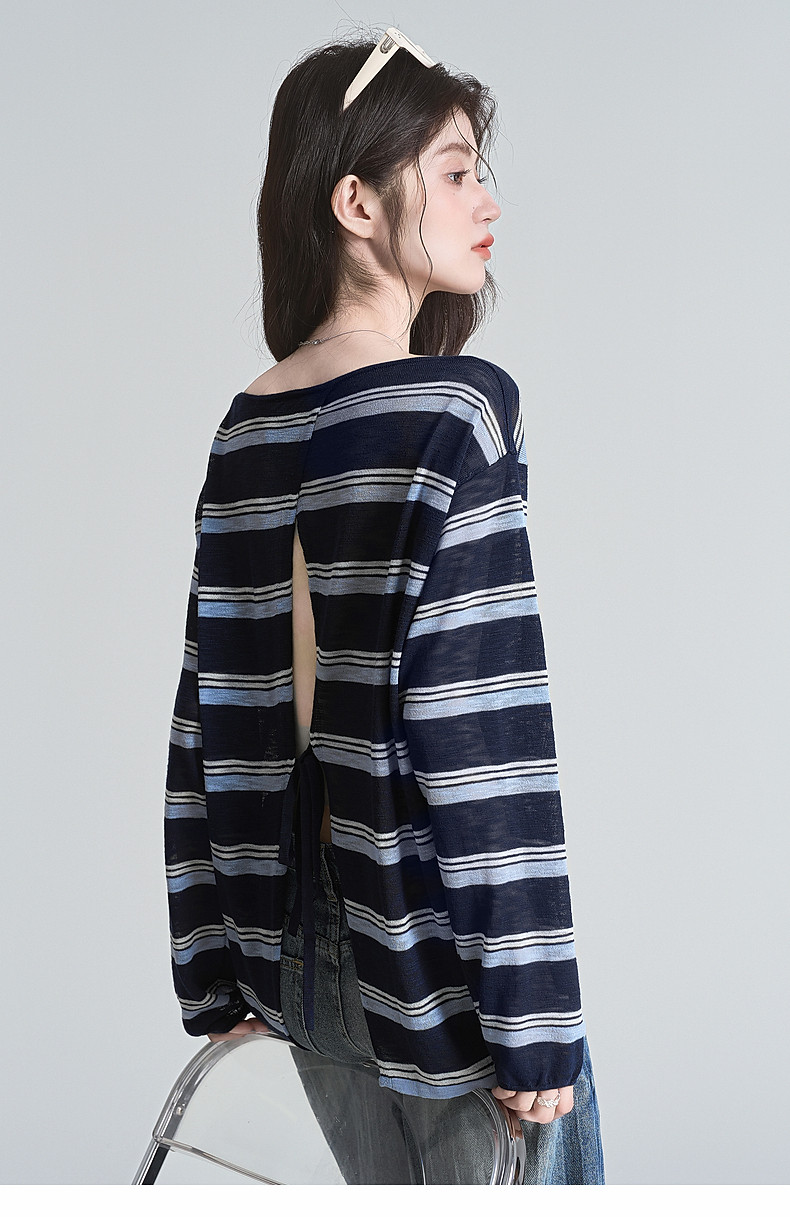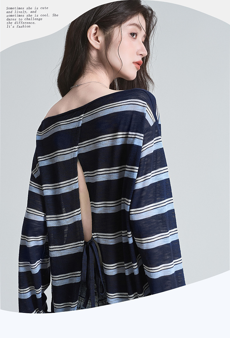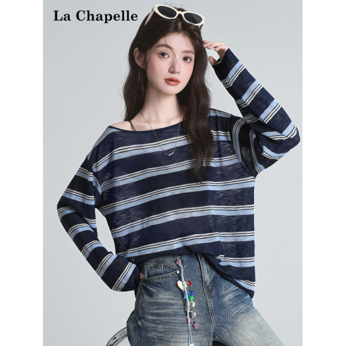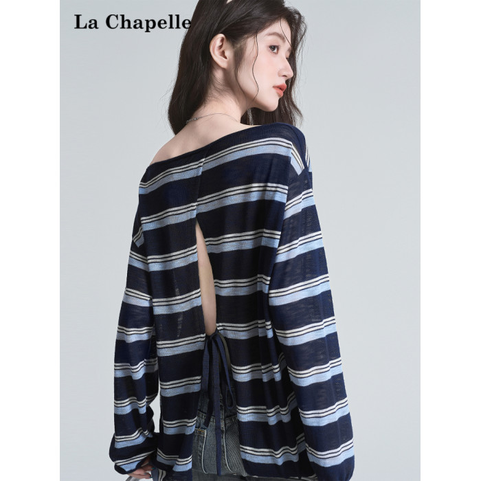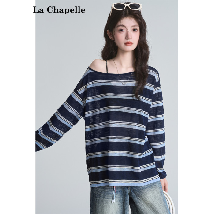 拉夏貝爾藏藍色條紋長袖t恤女防曬罩衫薄紗露肩後背鏤空上衣夏季