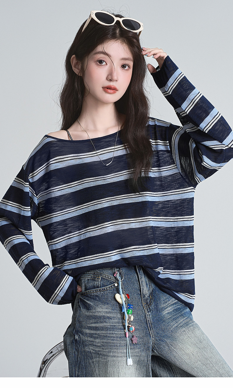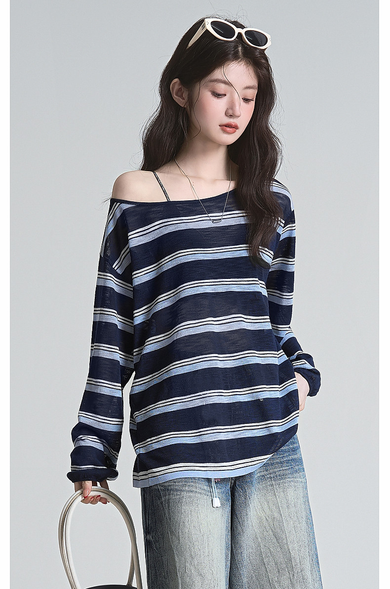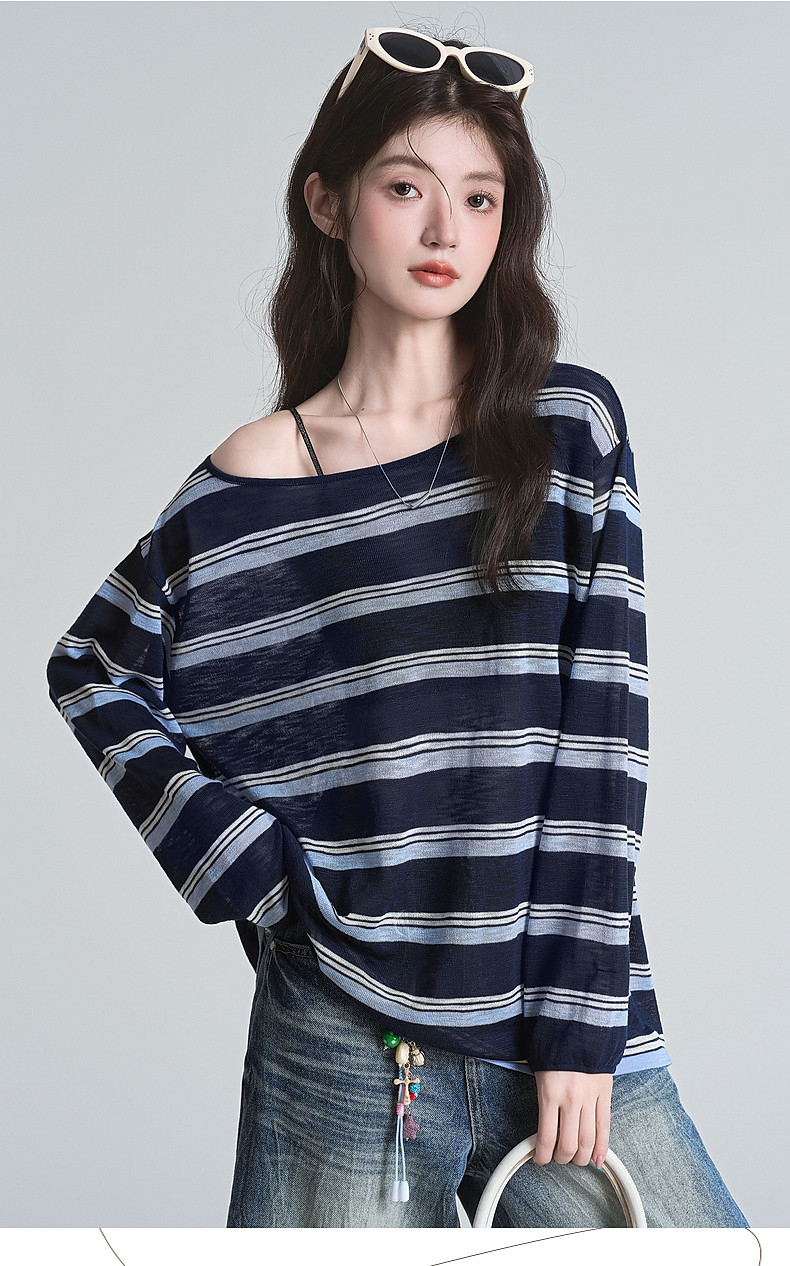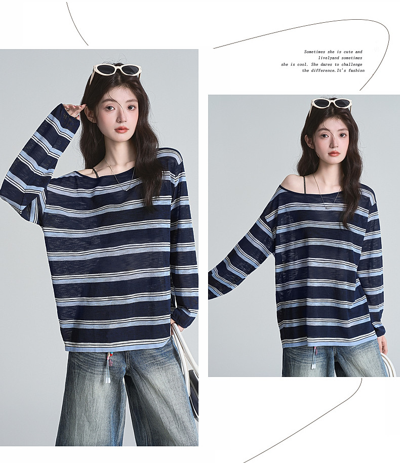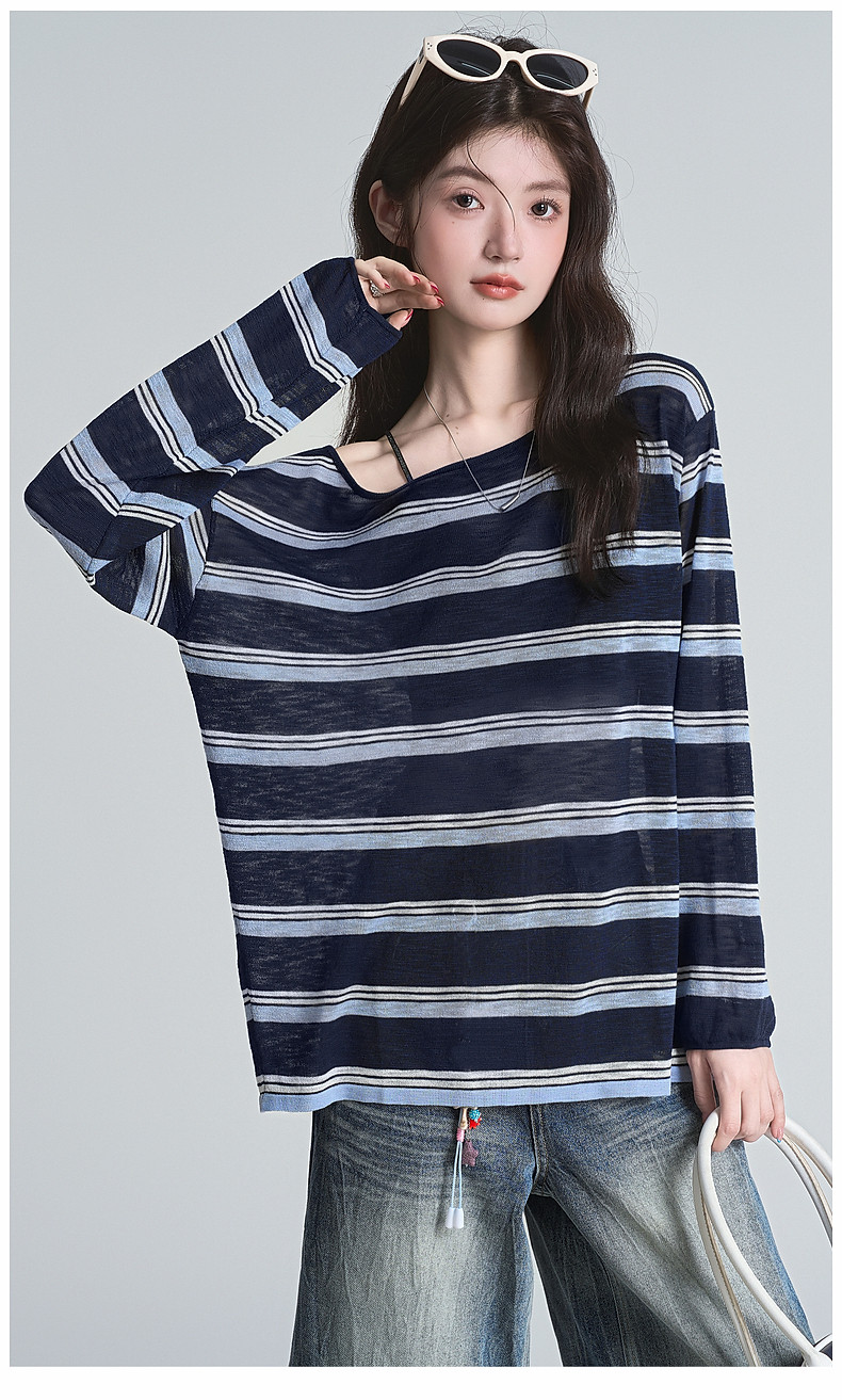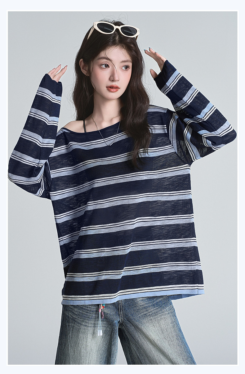 拉夏貝爾藏藍色條紋長袖t恤女防曬罩衫薄紗露肩後背鏤空上衣夏季