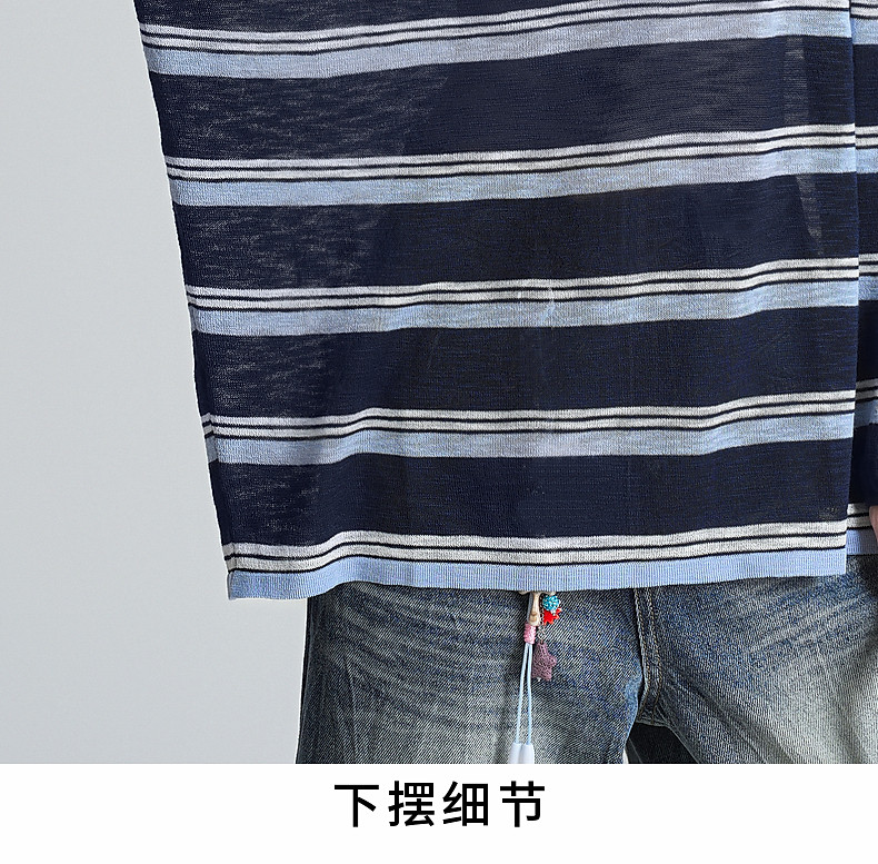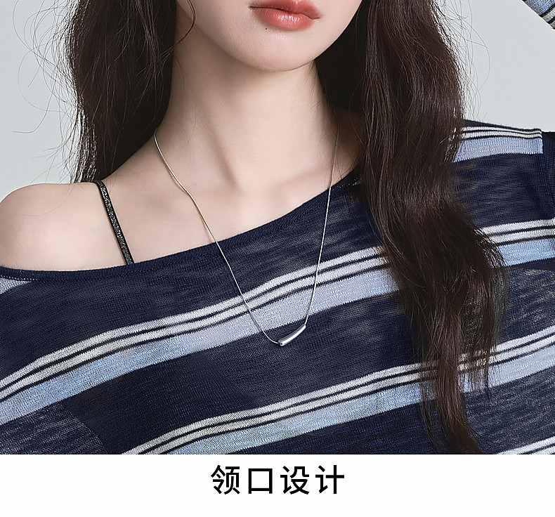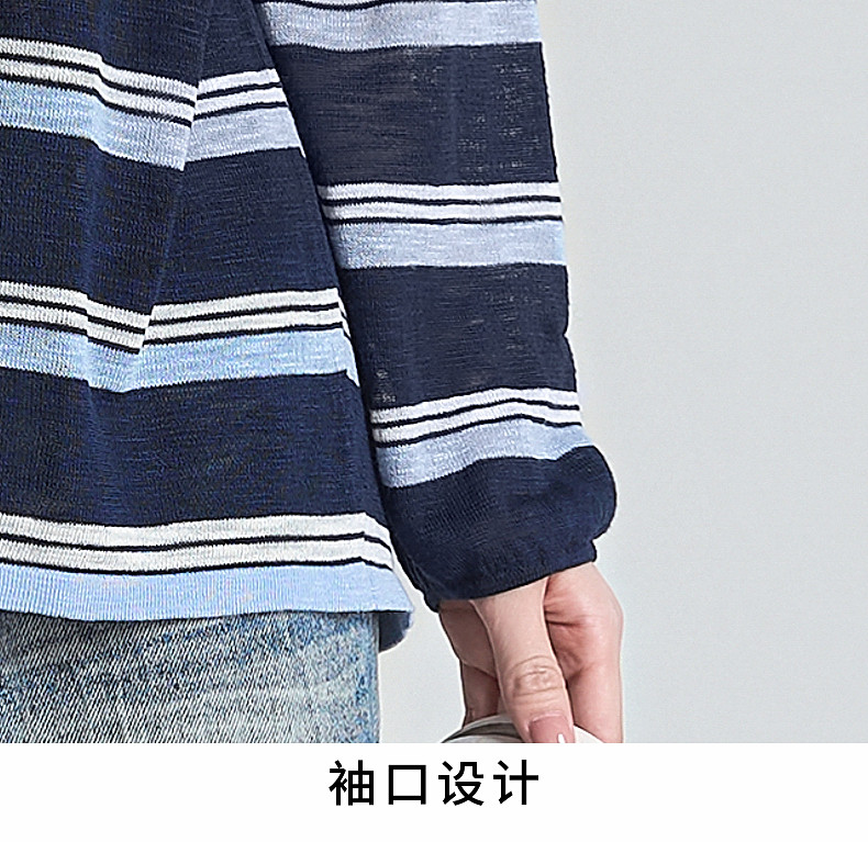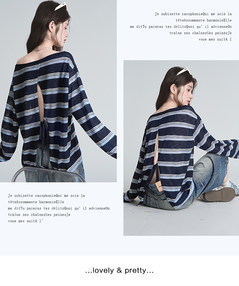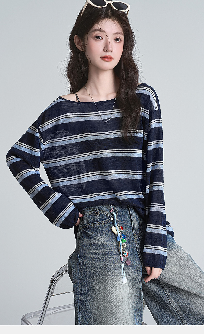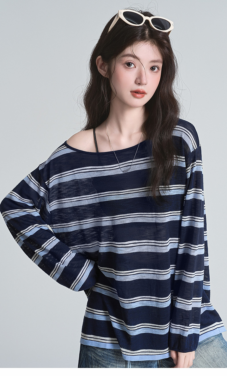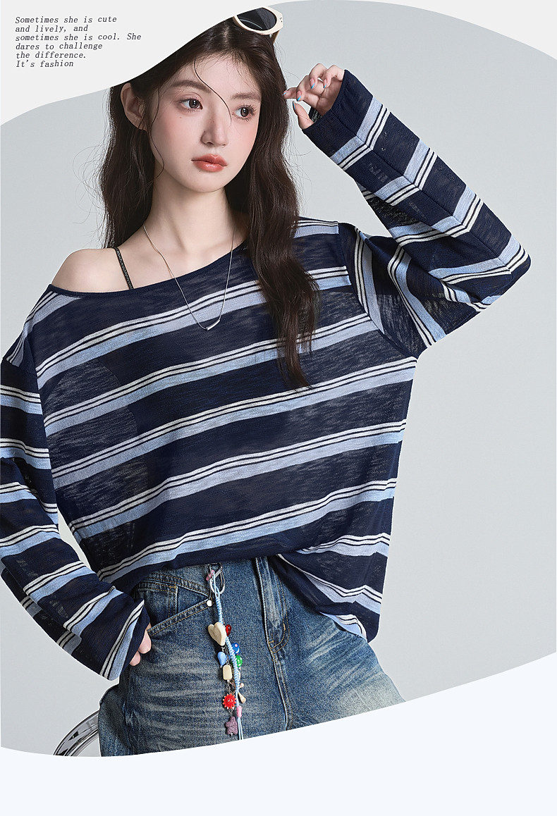 拉夏貝爾藏藍色條紋長袖t恤女防曬罩衫薄紗露肩後背鏤空上衣夏季