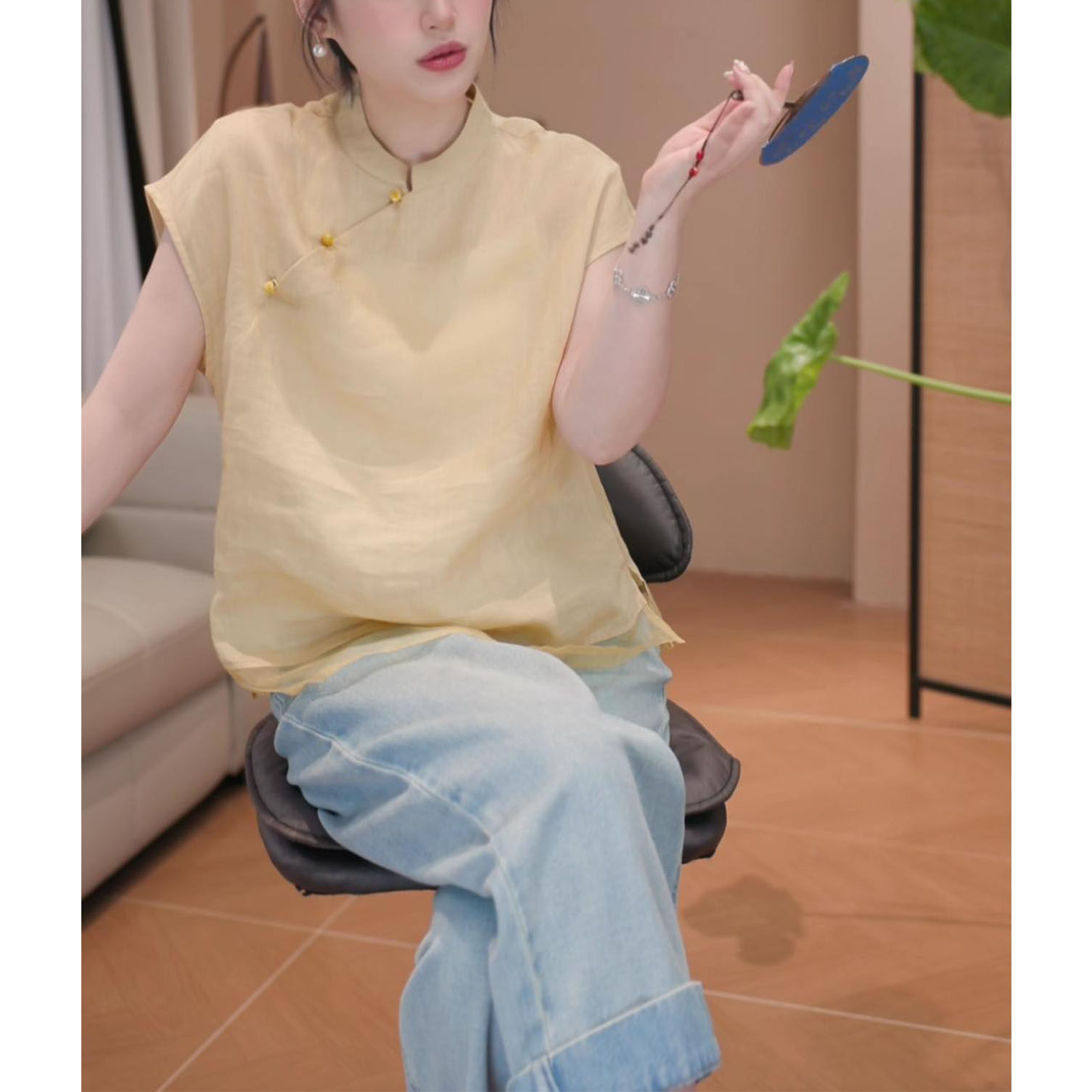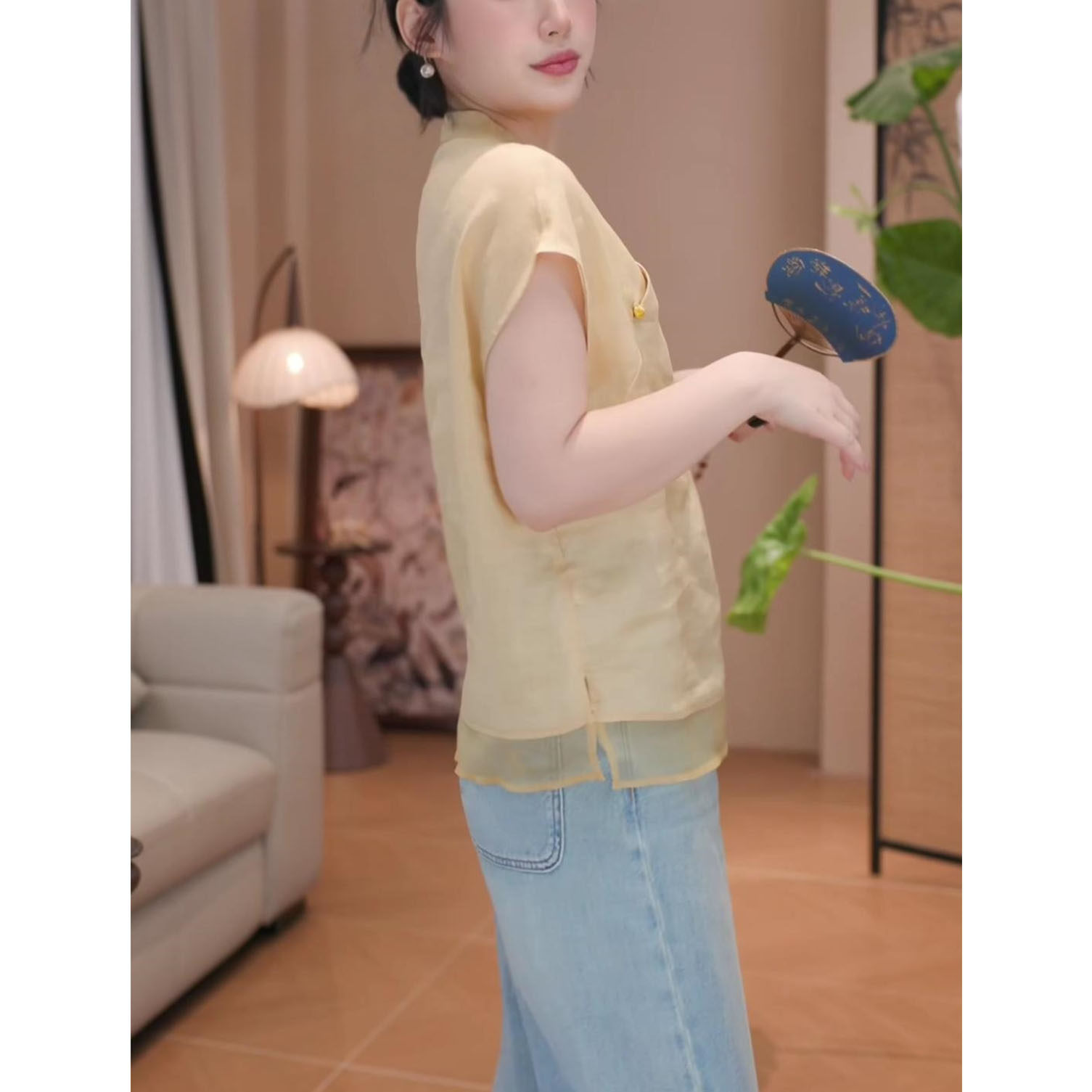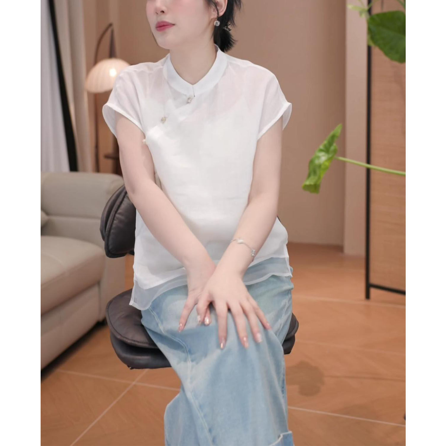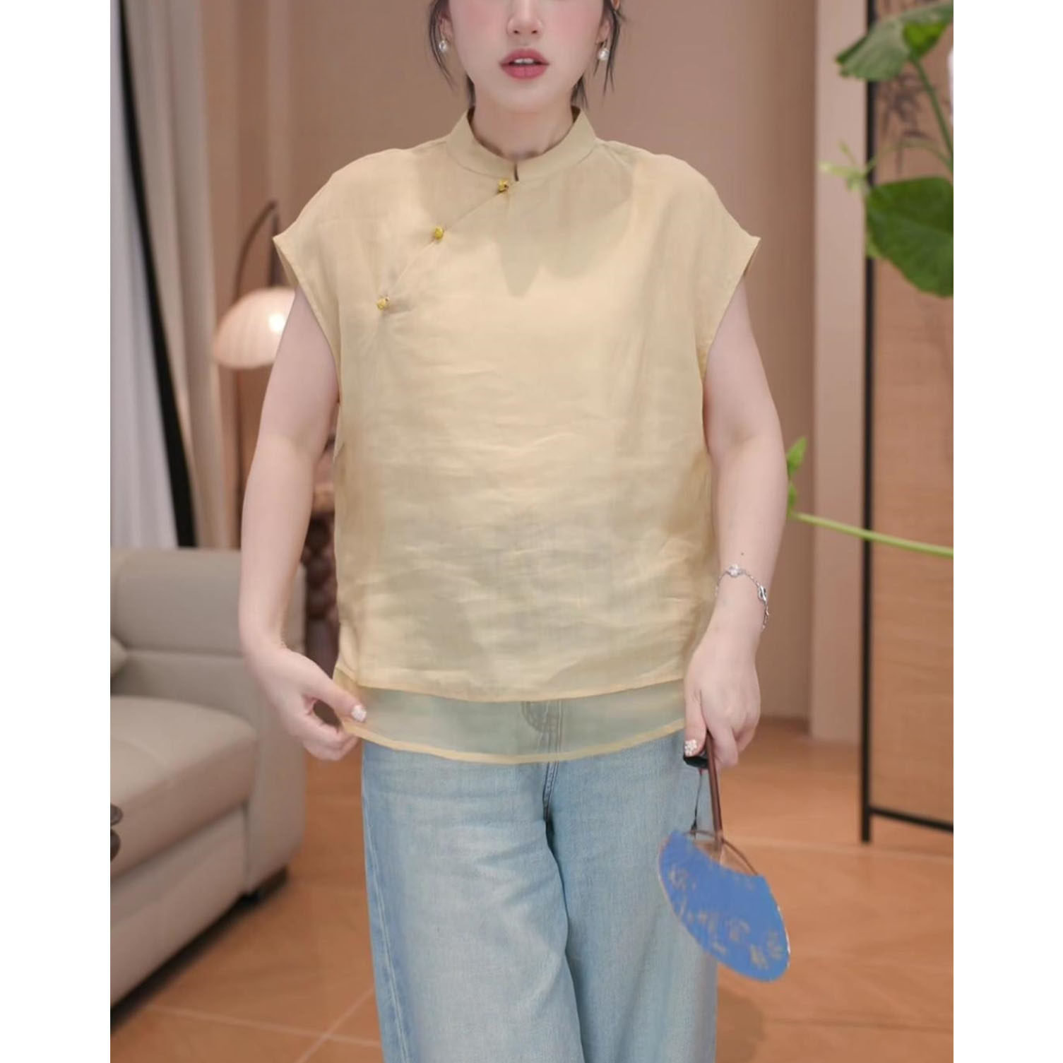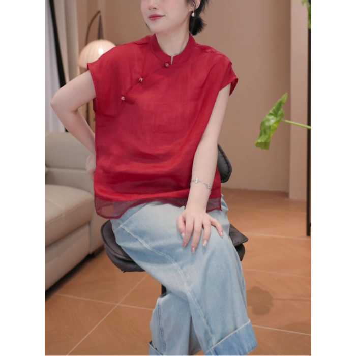2026年夏季新款新中式顯瘦短袖上衣女時尚氣質國風立領飛飛袖襯衫