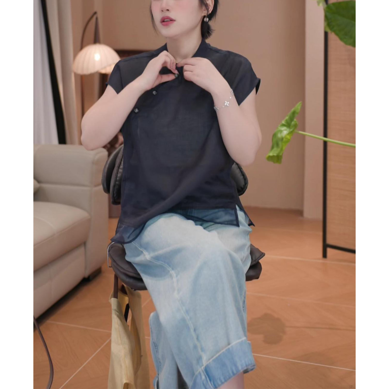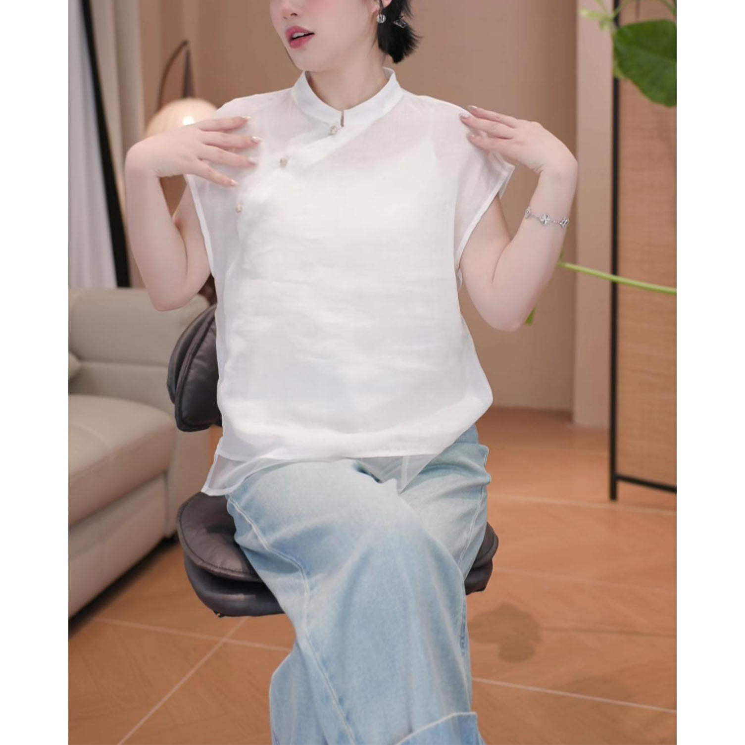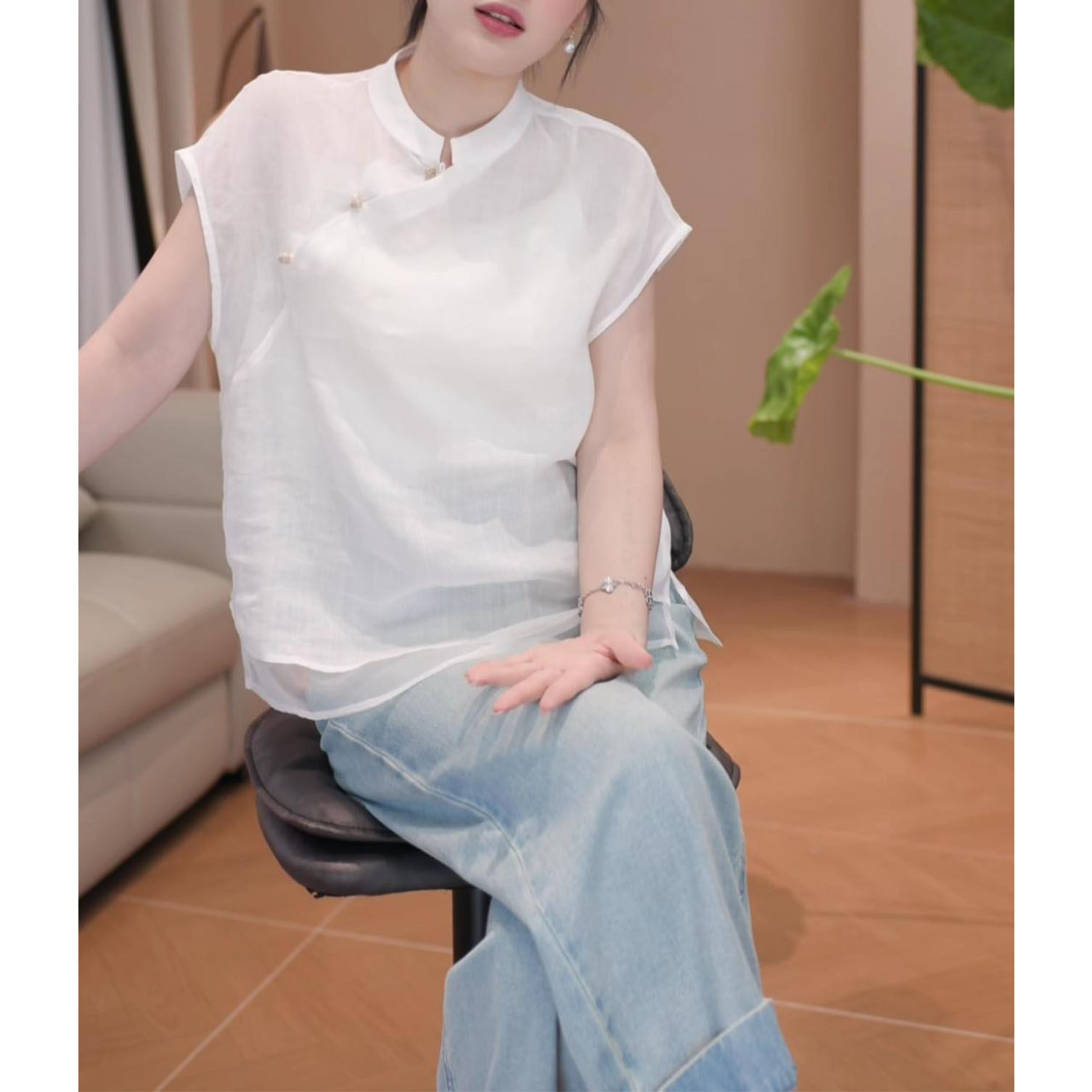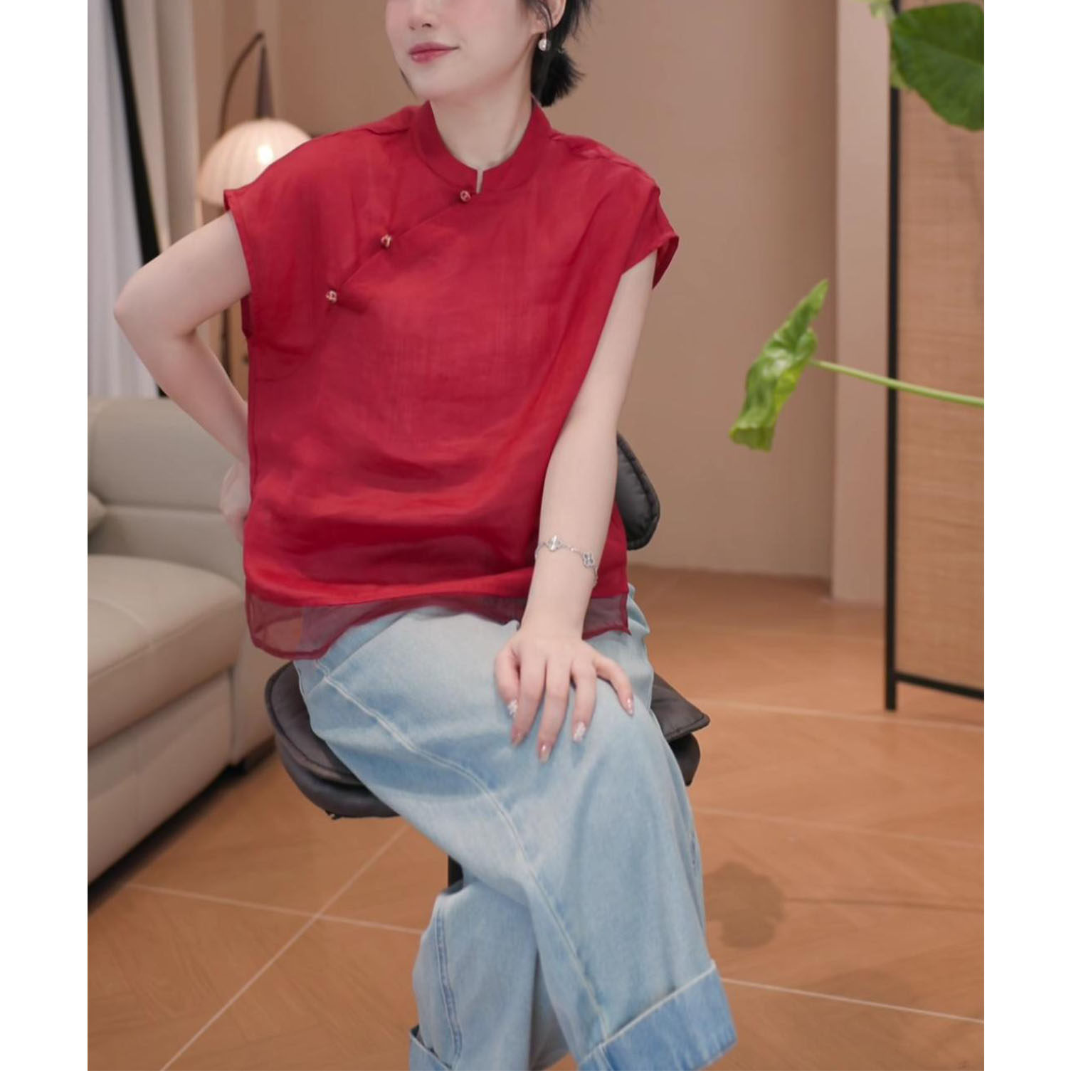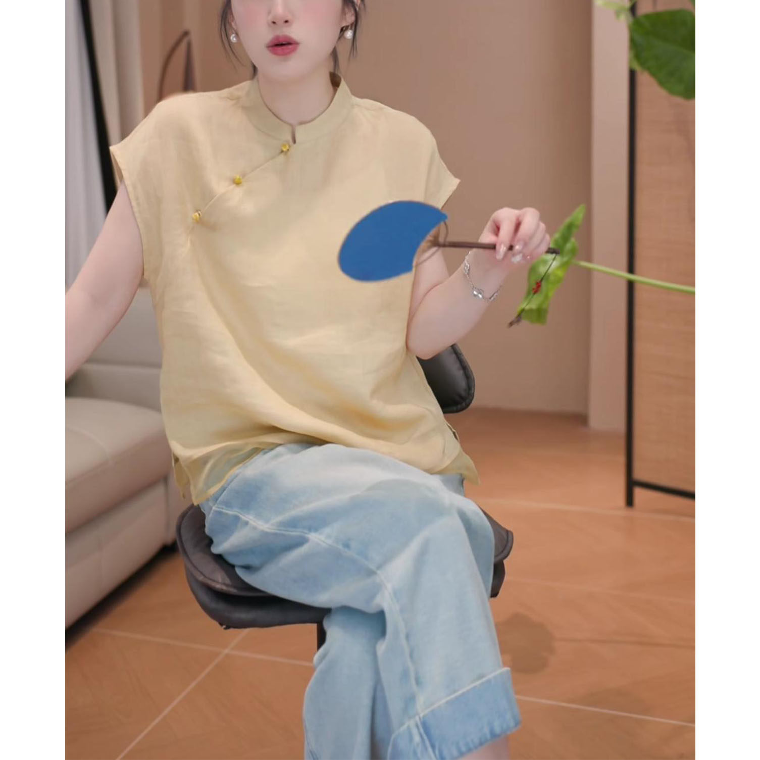 2026年夏季新款新中式顯瘦短袖上衣女時尚氣質國風立領飛飛袖襯衫