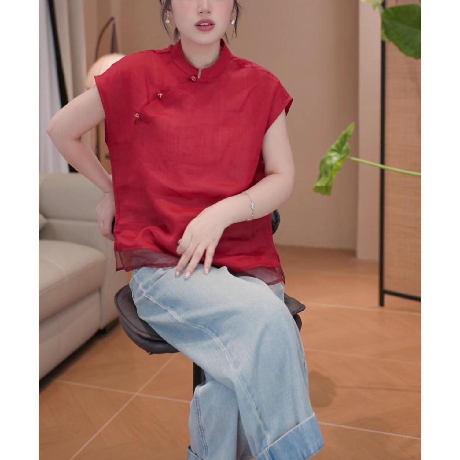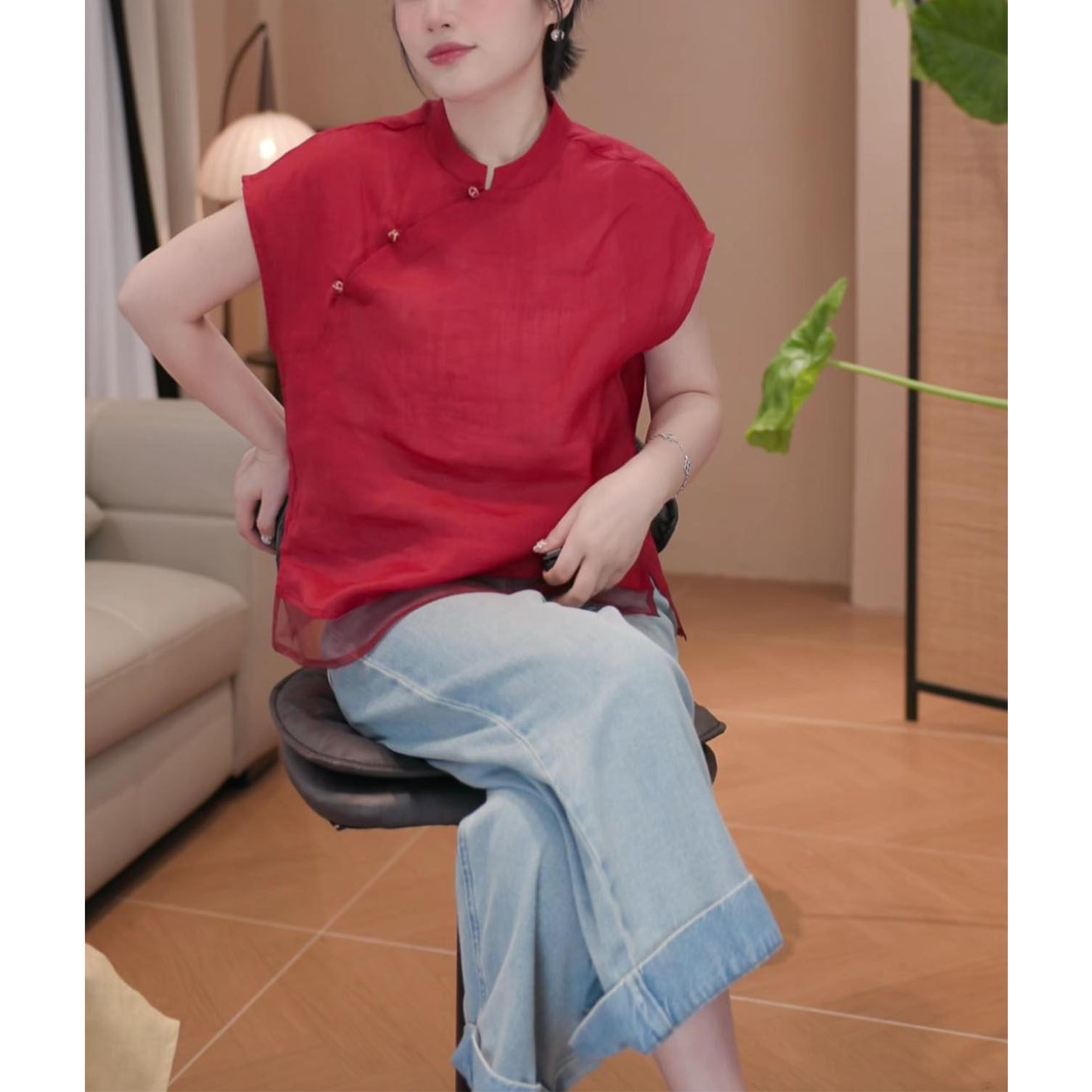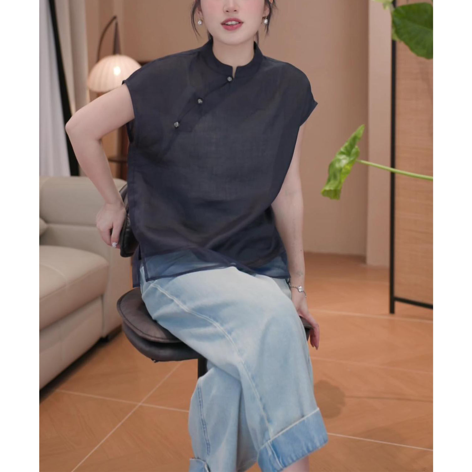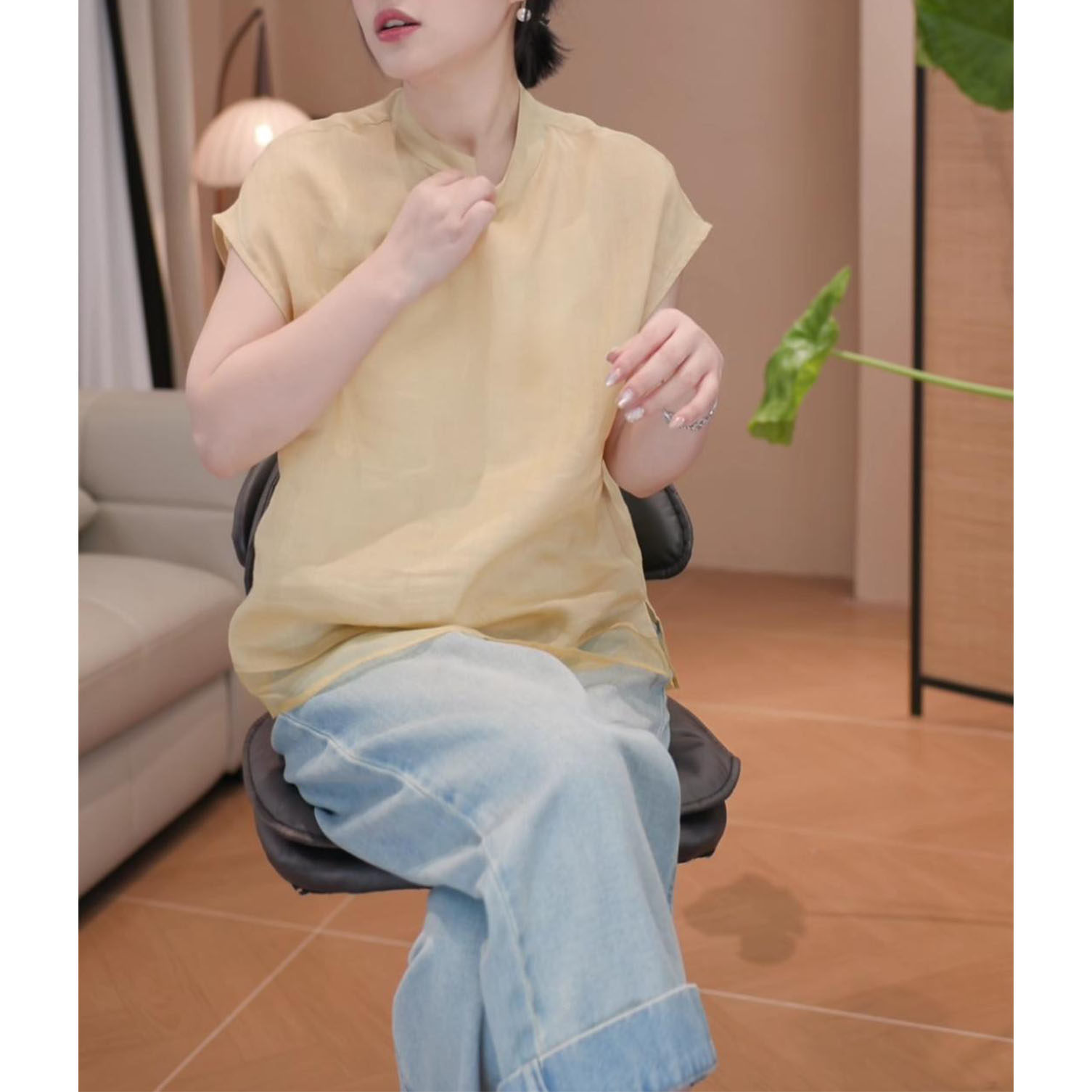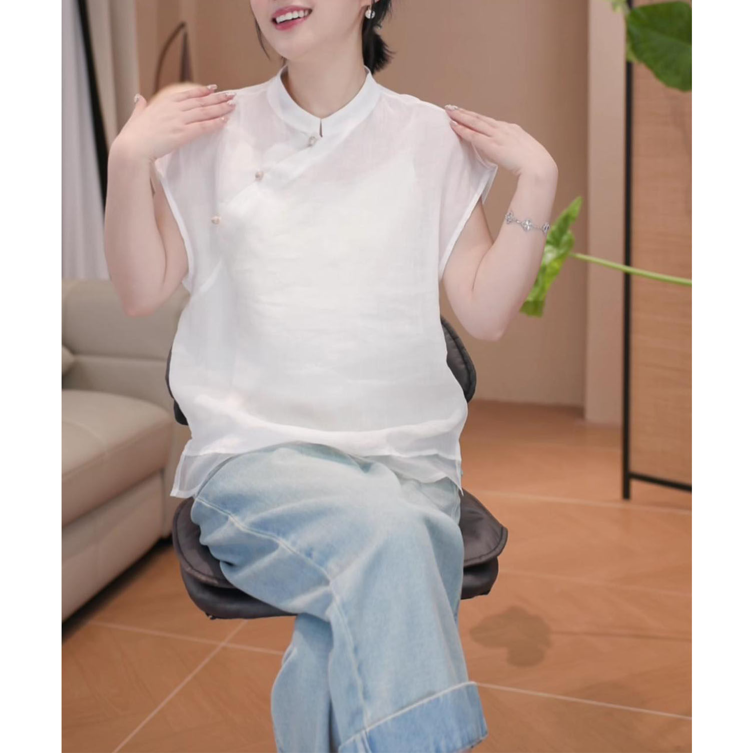 2026年夏季新款新中式顯瘦短袖上衣女時尚氣質國風立領飛飛袖襯衫